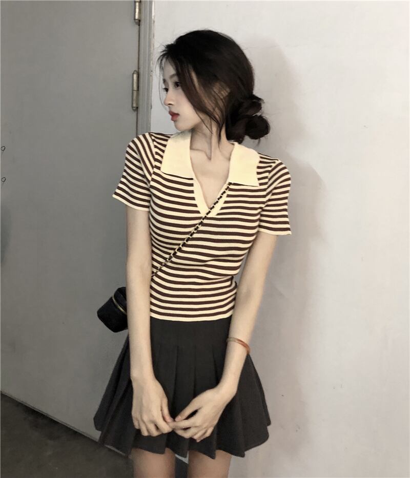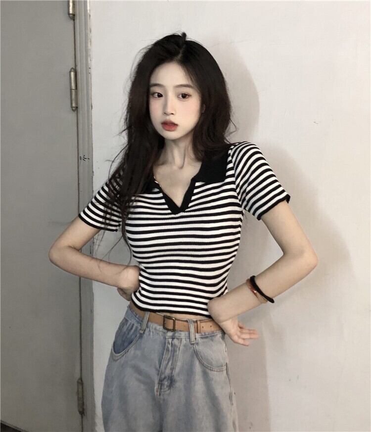 ホットVネックストライプニット半袖Tシャツレディースサマー薄手コントラストカラーポロシャツスリムフィットハイウエストショートトップ ハイウェスト 夏物 7460059448968045 | framboise21