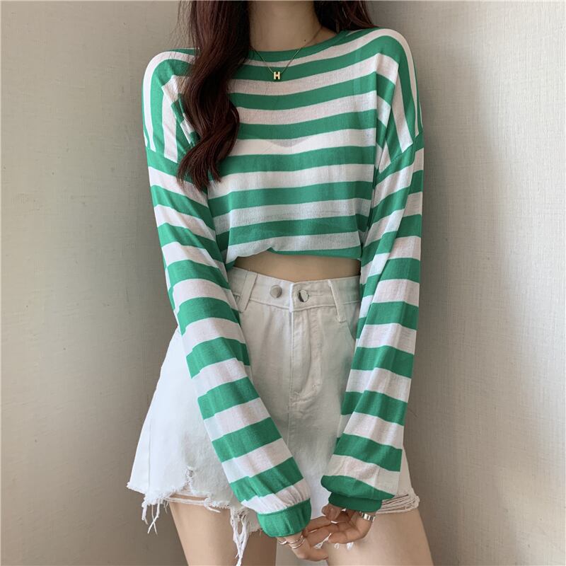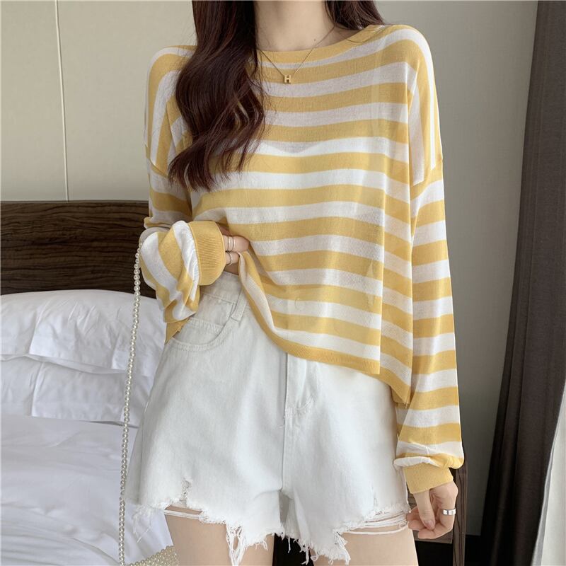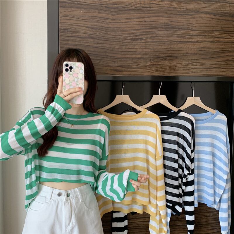 夏の薄い日焼け止めストライプ長袖Tシャツレディースバージョンルーズ2022新しいオールマッチラウンドネックトップ ロング サマー 夏物 Oネック 746004713360603 | framboise21