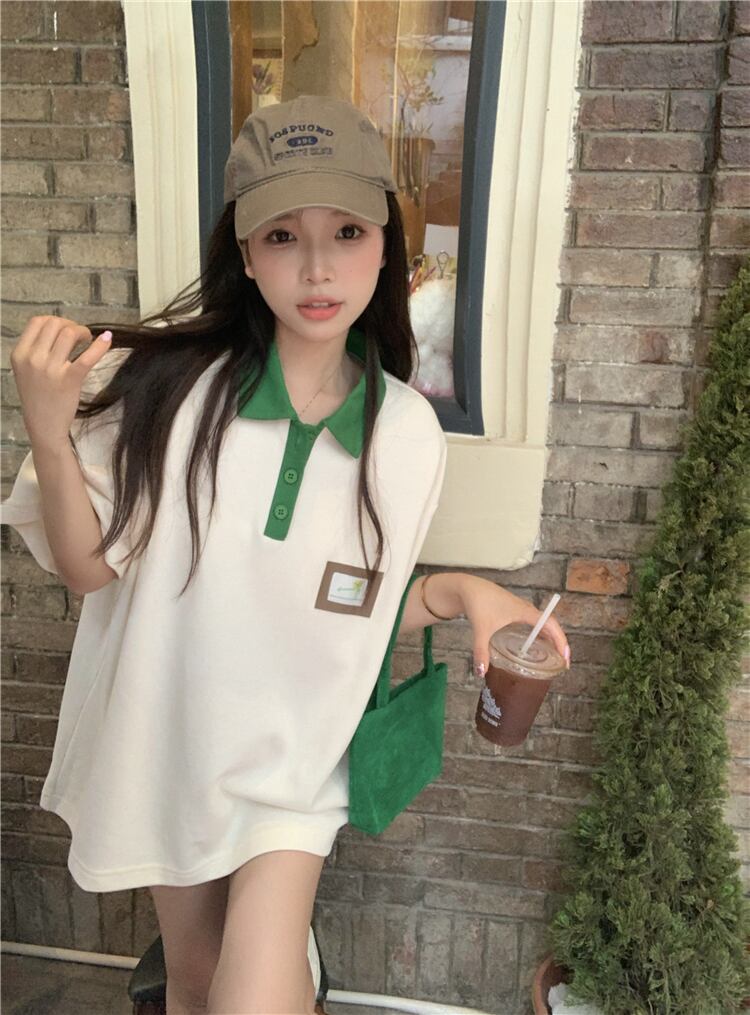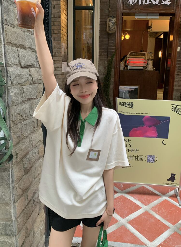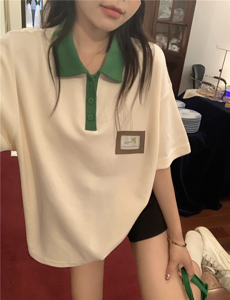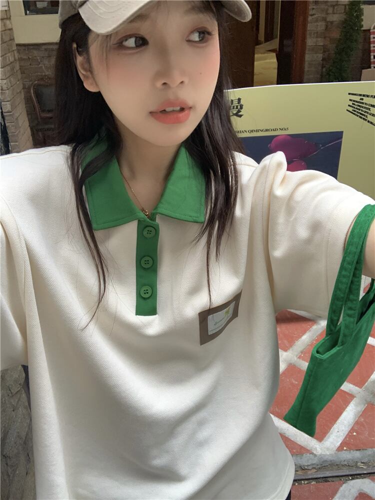 コントラストカラーのポロカラールーズ半袖Tシャツレディースサマーオールマッチカジュアルミドル丈ボトムスシックなハーフスリーブトップス欠品 夏物 746009736388428 | framboise21