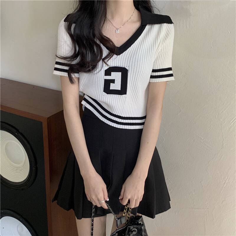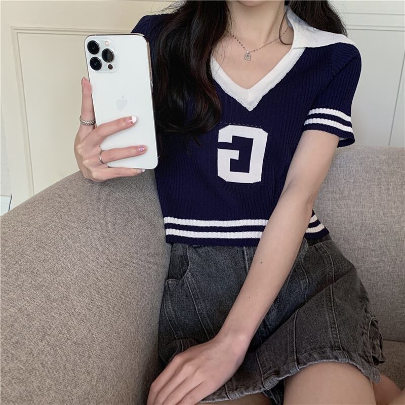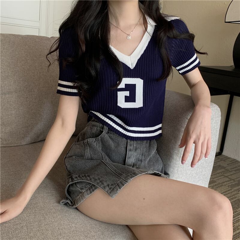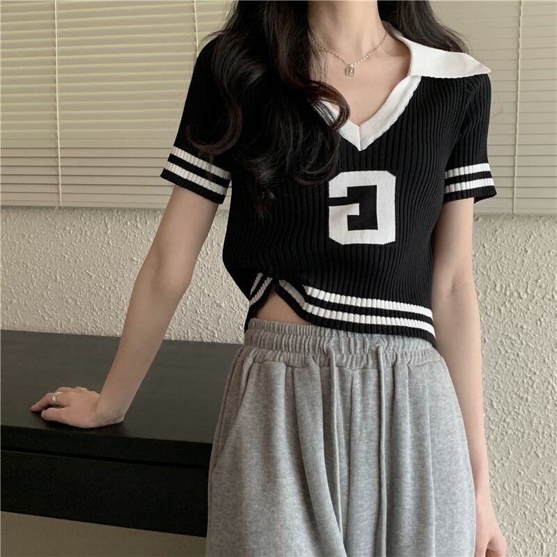 レタープリントコントラストカラーVネック半袖Tシャツレディースサマースリムフィットハイウエストニットスモールシャツショートトップ ハイウェスト 夏物 7460069005956941 | framboise21