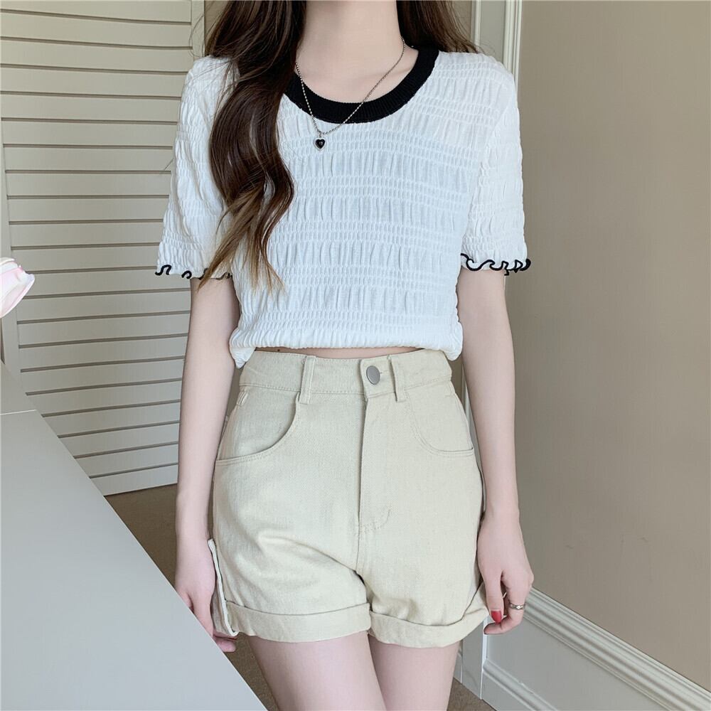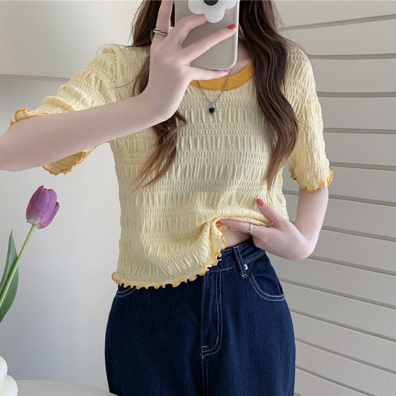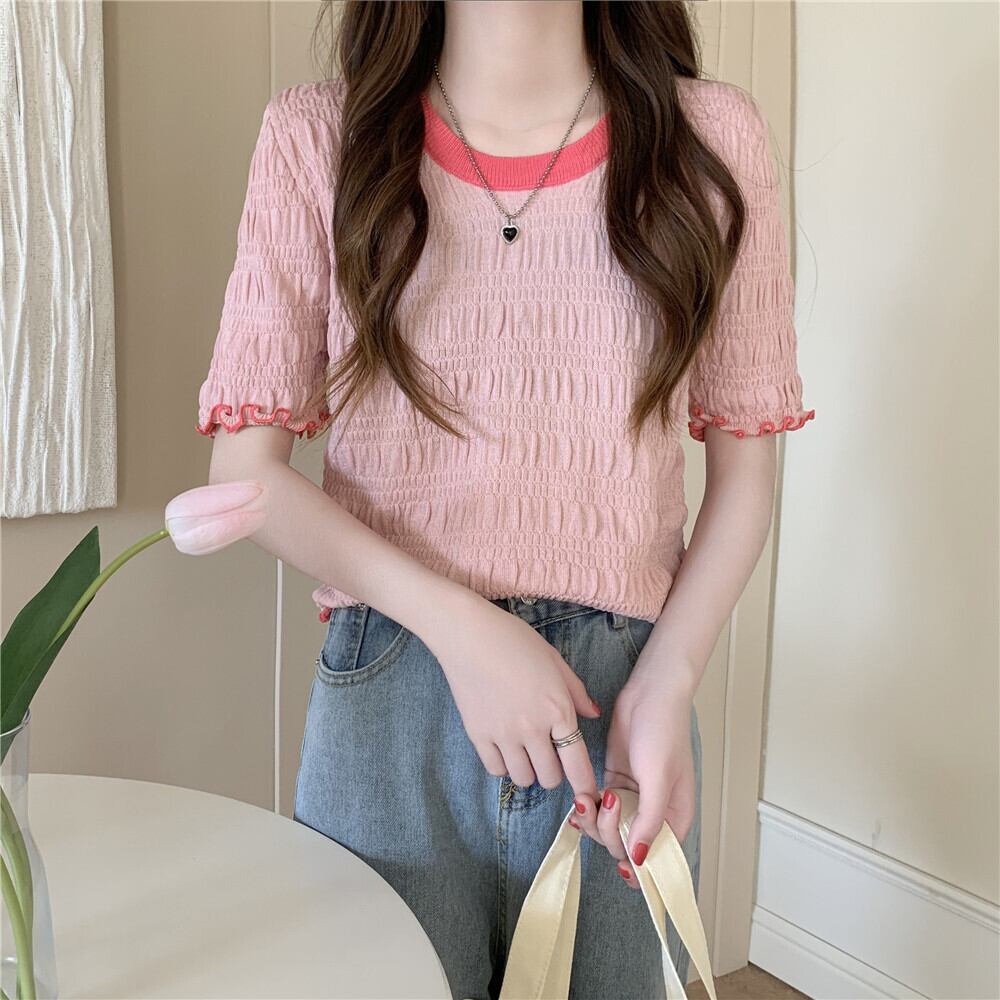 半袖フロントショルダーTシャツレディースサマーフレンチニッチコントラストカラーカビエッジウエスタンスタイルユニークでスリムなショートトップ 夏物 7460089010658047 | framboise21