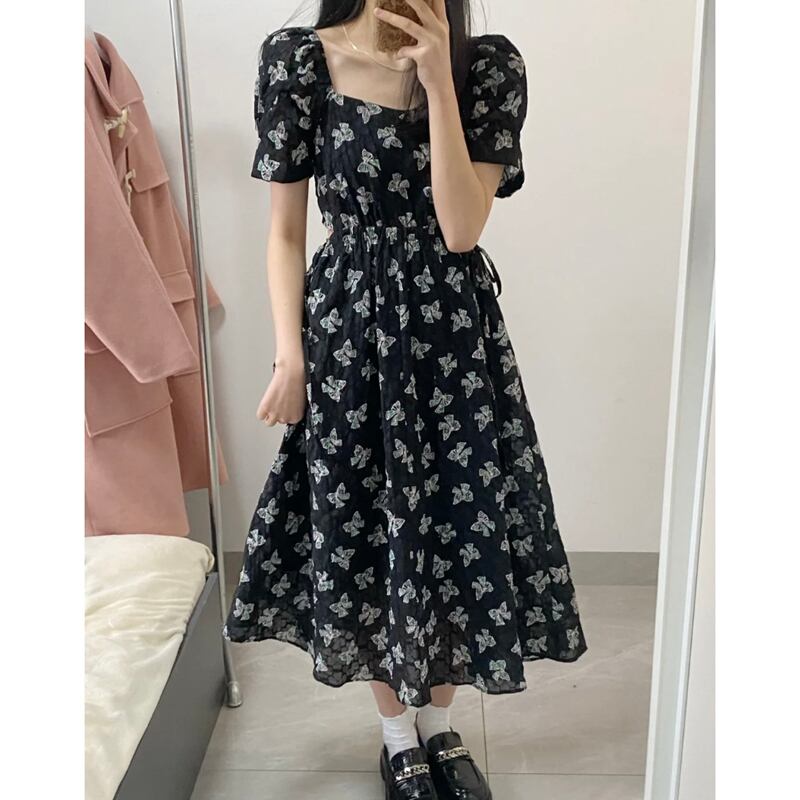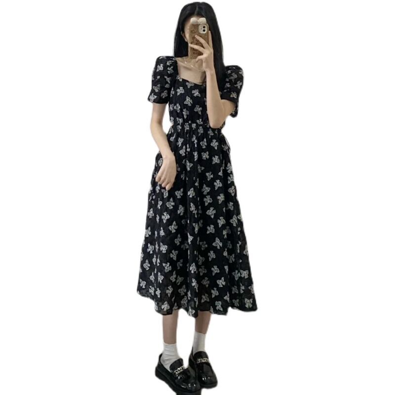 ブラックドレスレディースサマーシンボウロングスカートフレンチハイエンドデザインセンススクエアネックスカート2022new リボン 夏物 スクウェア 7460092683994451 | framboise21