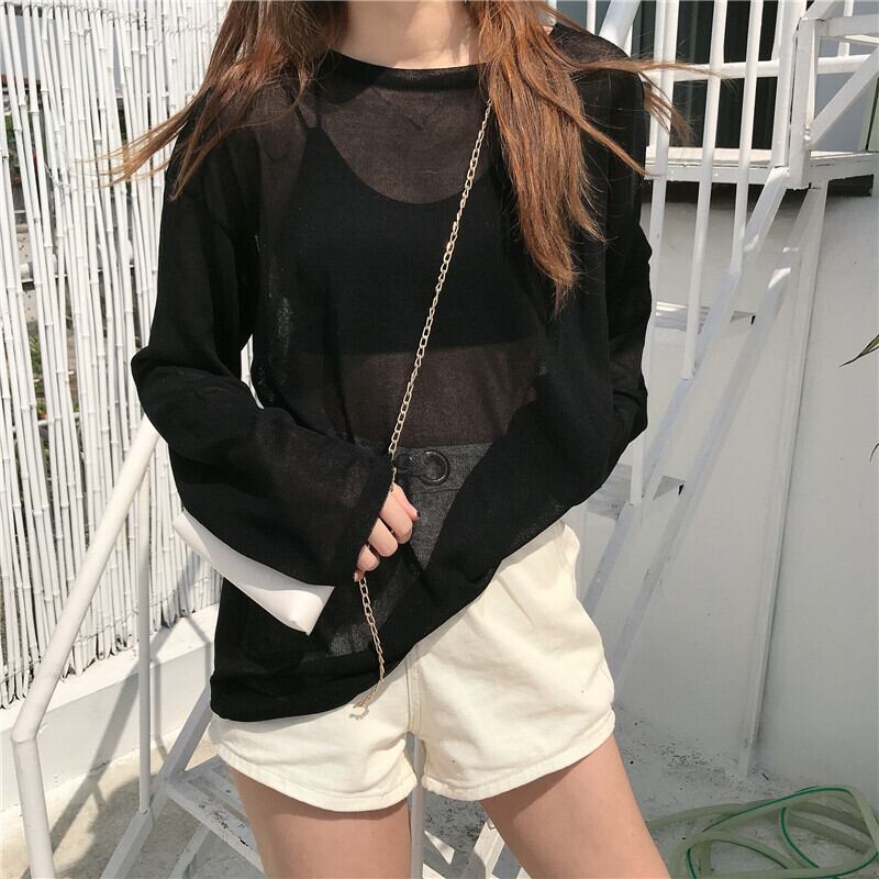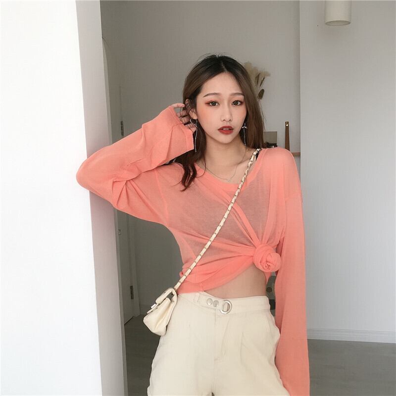 サマーネットレッド薄めセクションキャンディーカラーアイスシルク日焼け止めニットブラウス長袖Tシャツ女性はやや透明なトップインタイドを緩めます ロング 夏物 7460025784997554 | framboise21