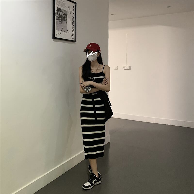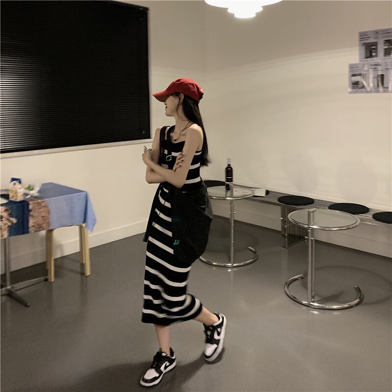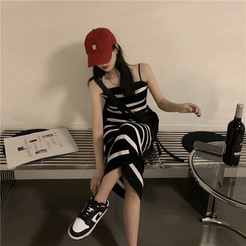 黒と白のストライプのニットサスペンダードレス女性の2022年夏の新しいデザインニッチシックなウエストロングスカート ホワイト ブラック サマー 夏物 7460024826096541 | framboise21