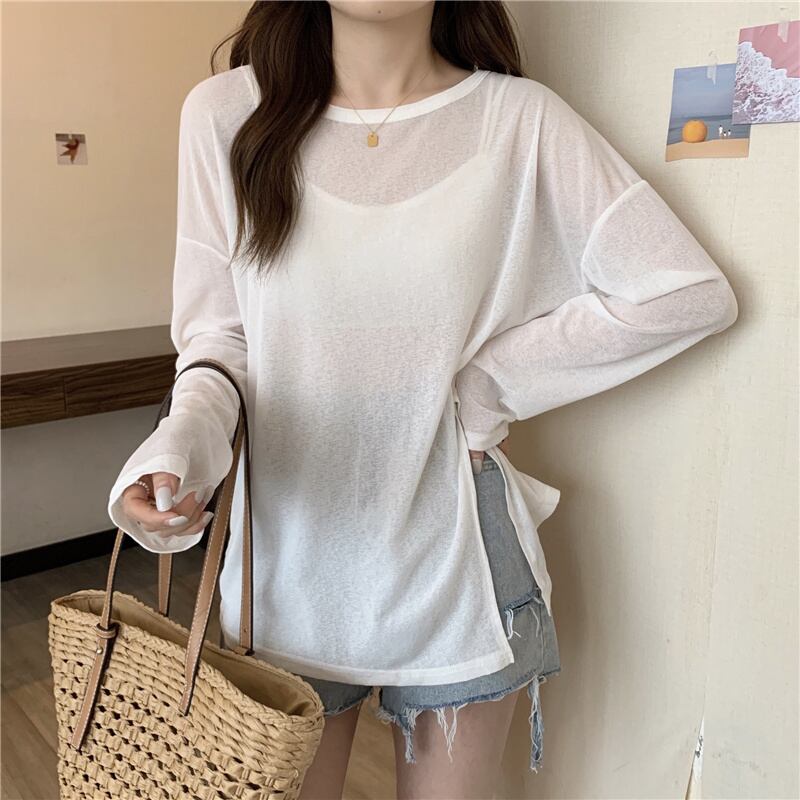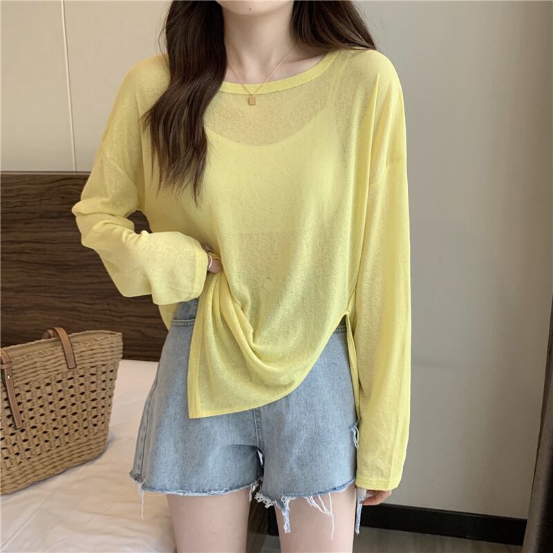 キャンディーカラーの日焼け止め長袖Tシャツ女性の夏の薄いルーズニット不規則なスプリットエアコンブラウスアイスシルクトップ ロング サマー 夏物 7460065773674420 | framboise21