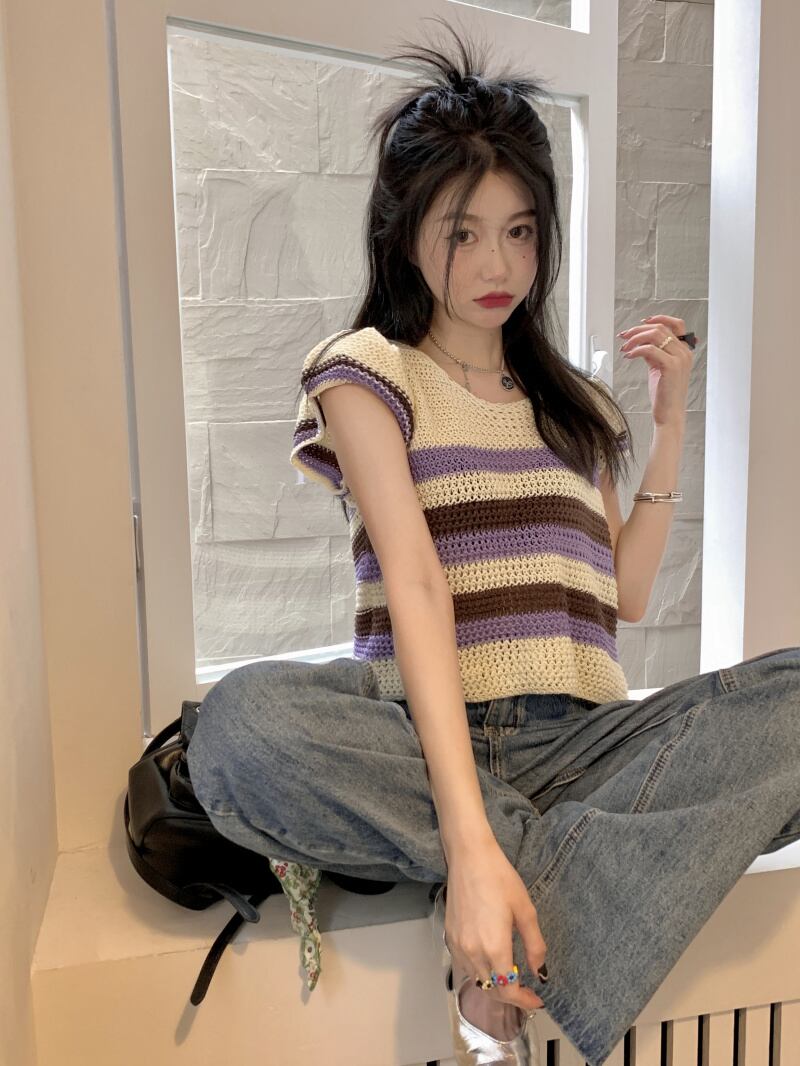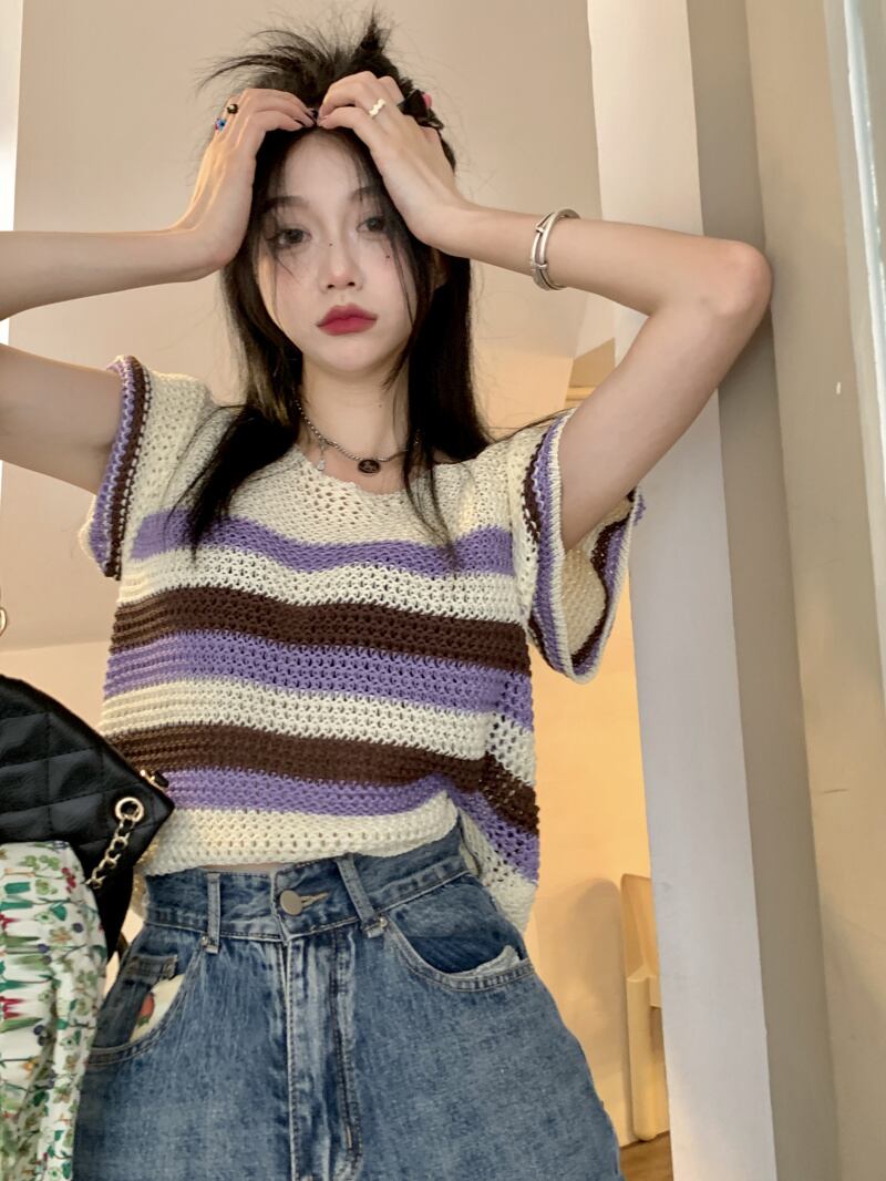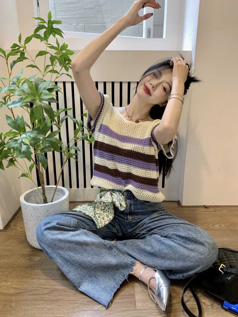 ピュアデザイアスタイルパープルストライプショートレディースユニークなデザインセンスニッチホロートップ2022年夏ニットセーター半袖 ハーフスリーブ サマー 夏物 746001663209243 | framboise21