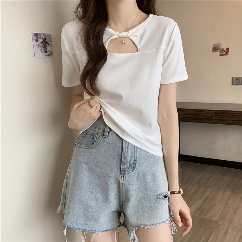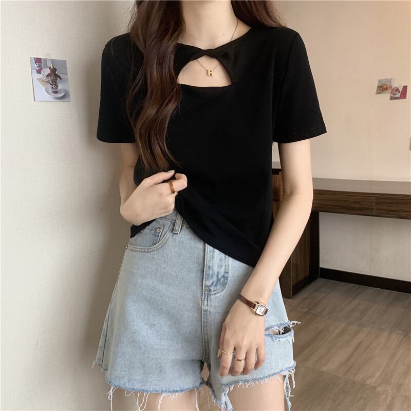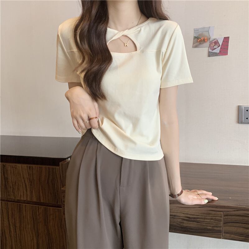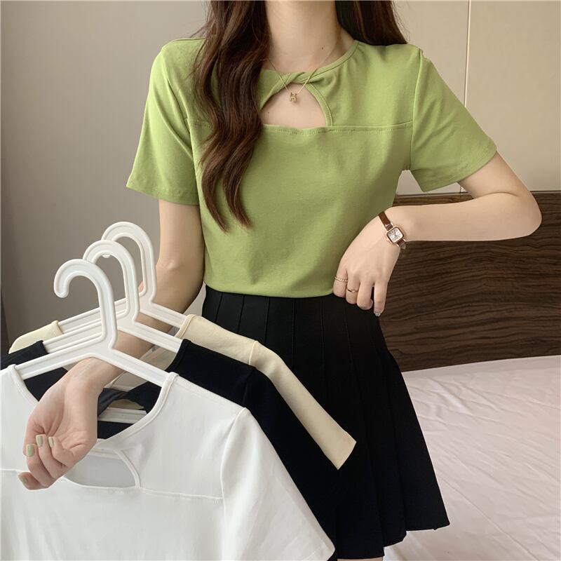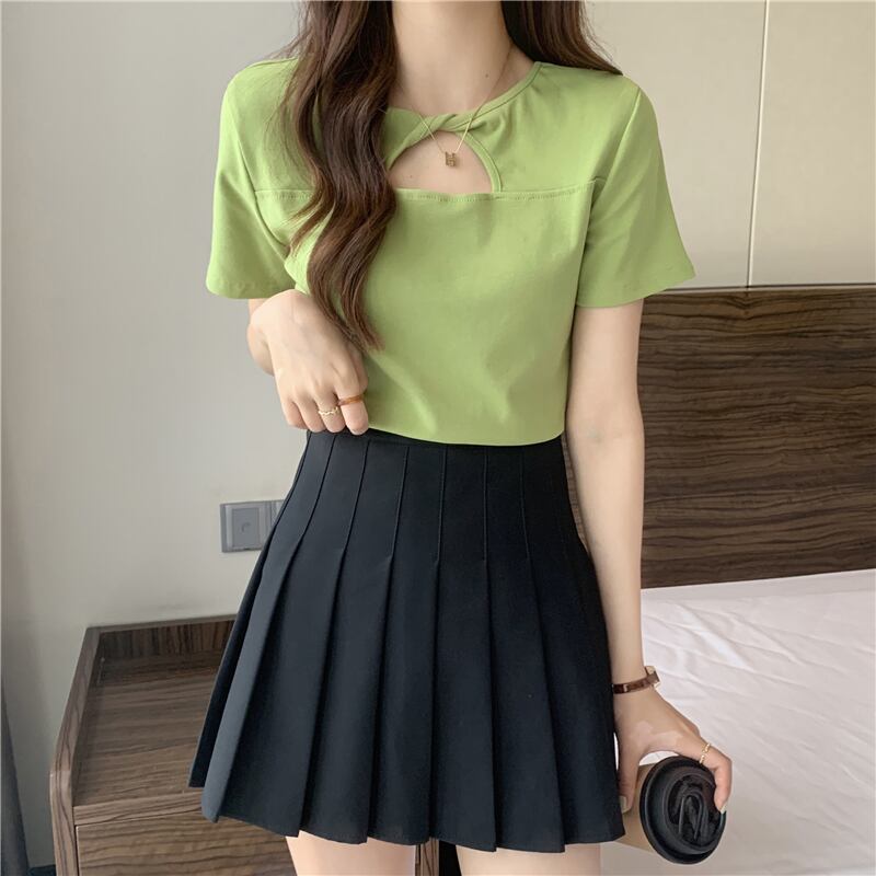アボカドグリーンフレンチホロウフロントショルダー半袖Tシャツ2022サマーシンピンチウエストシャツトップレディース ショート ハーフスリーブ 夏物 7460058452311729 | framboise21