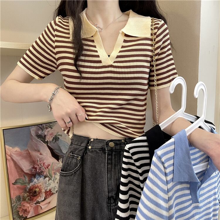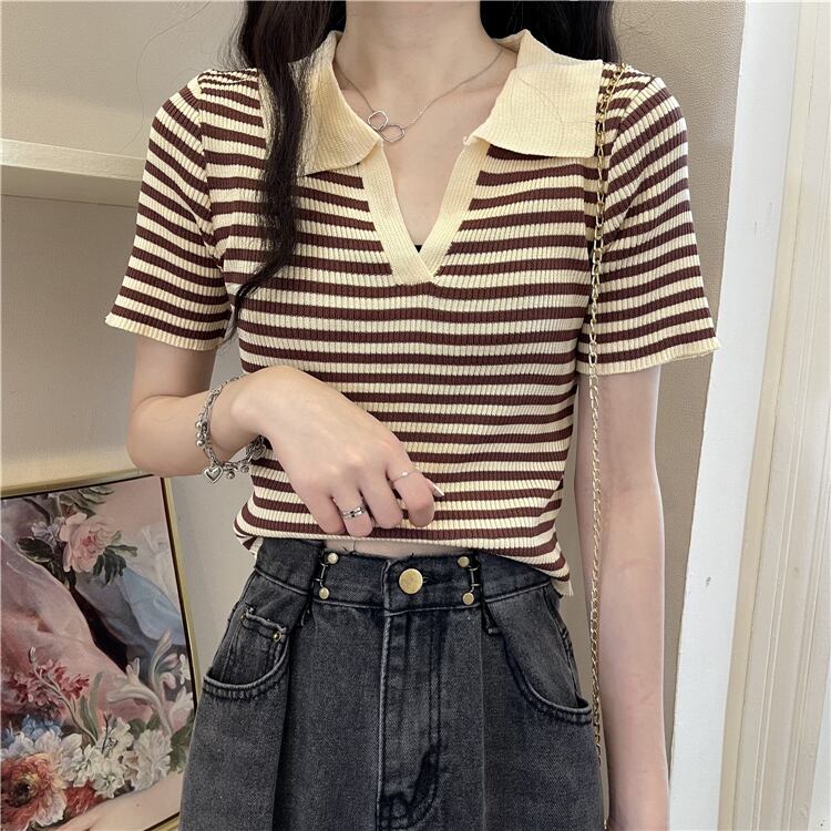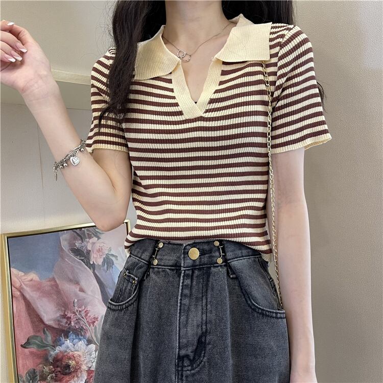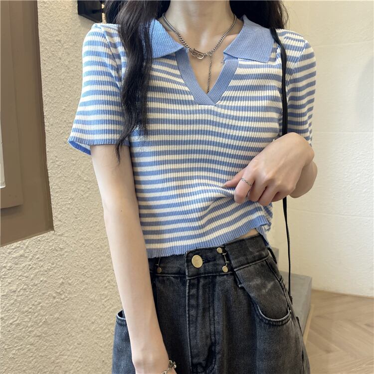 アイスシルク半袖フロントショルダーTシャツレディースサマーフレンチシックニッチポロシャツVネック個性的なショートストライプトップ薄手 夏物 7460033306231415 | framboise21