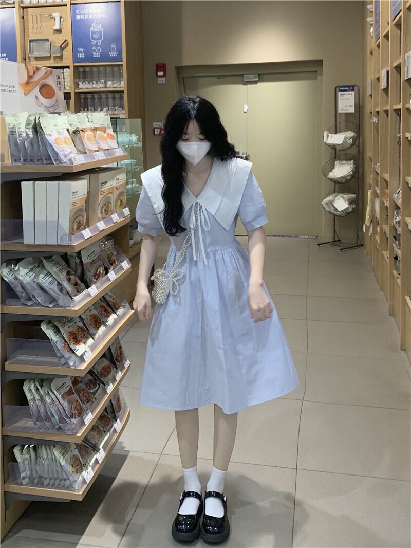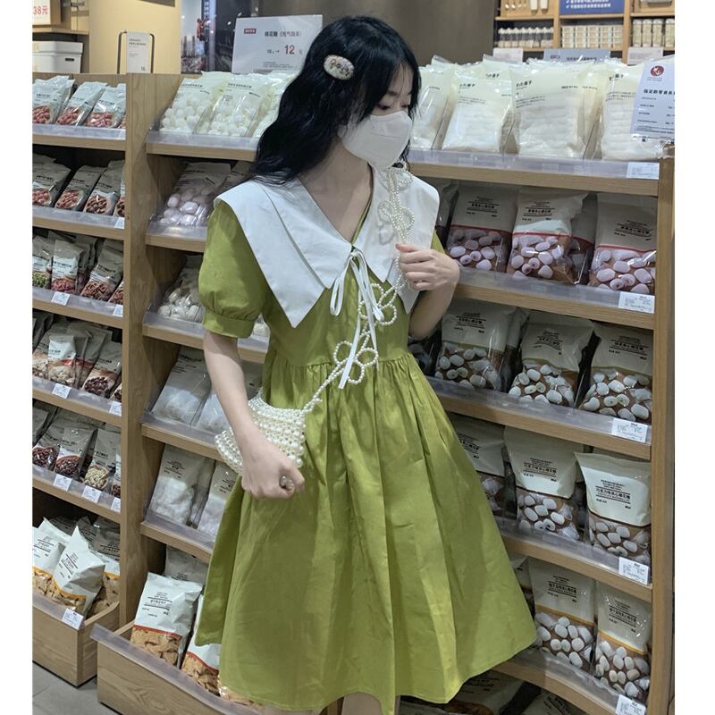 コントラストカラーの人形ネクタイネクタイバブル半袖ドレス女性の夏の甘い初恋ウエストスリムVネックAラインショートスカート 大人ガーリー スウィート キュート カジュアル サマー 夏物 7460010404084978 | framboise21