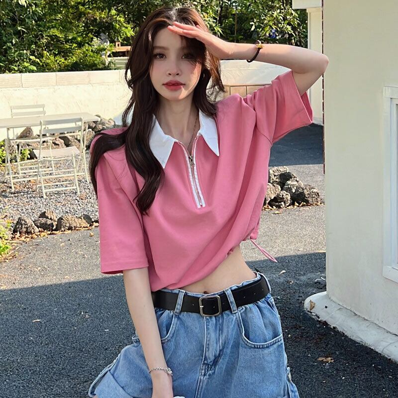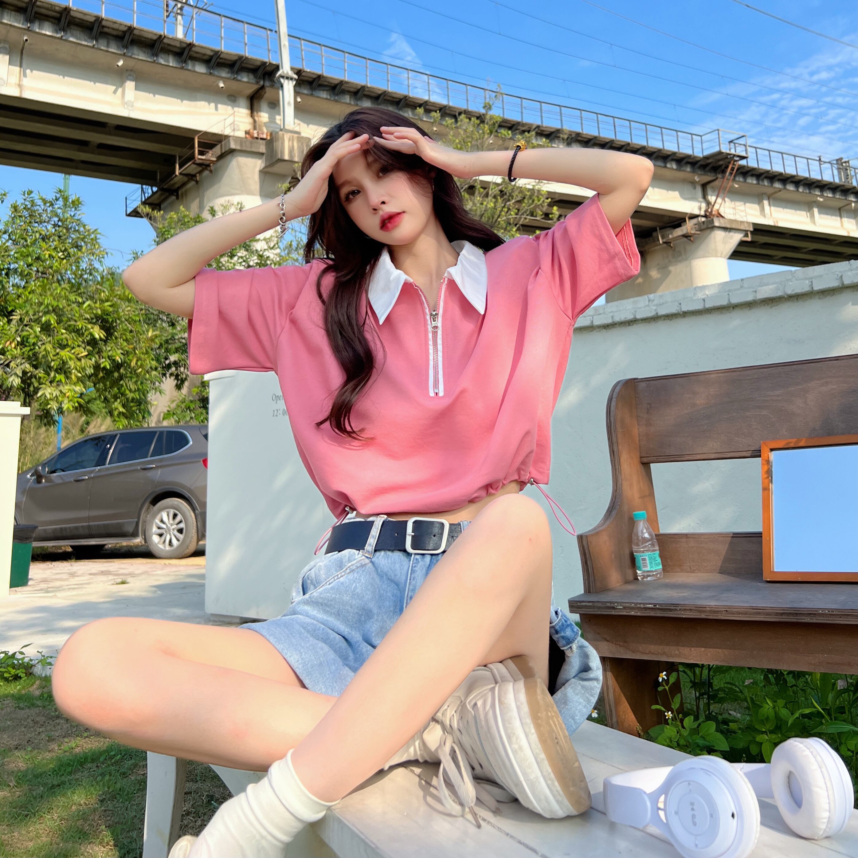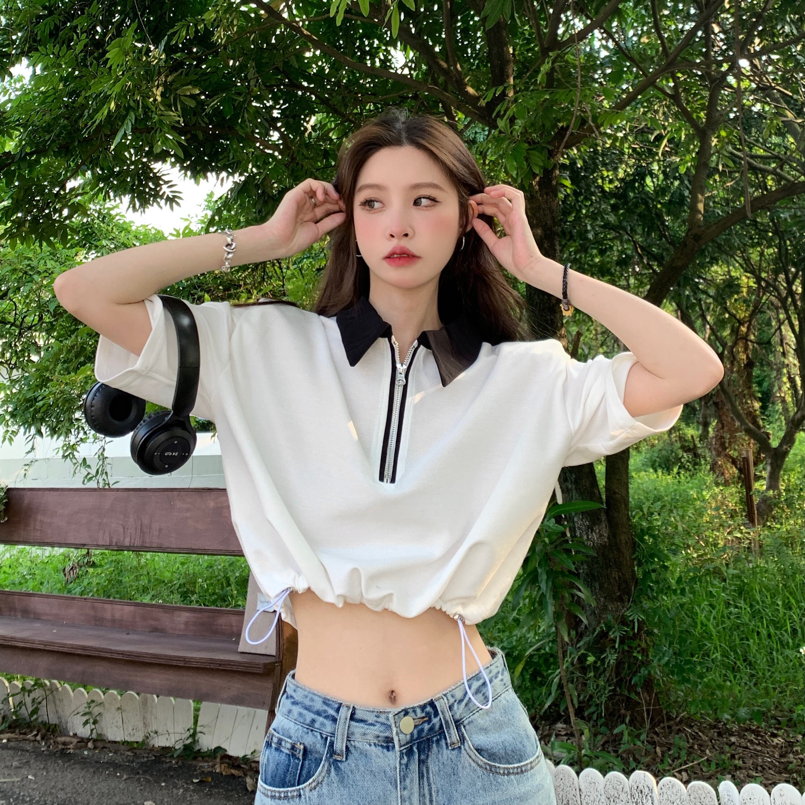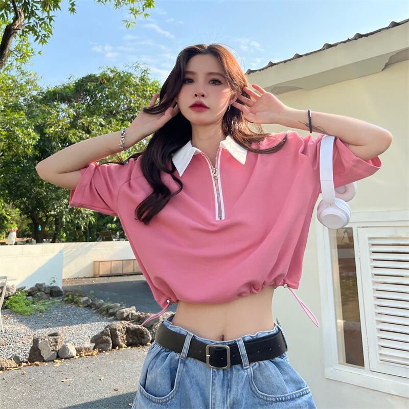 ジッパーポロシャツショルダーパッドTシャツレディースサマー半袖デザインニッチハイウエストショートドローストリングウエストトップトレンディ 夏物 7460088069757212 | framboise21