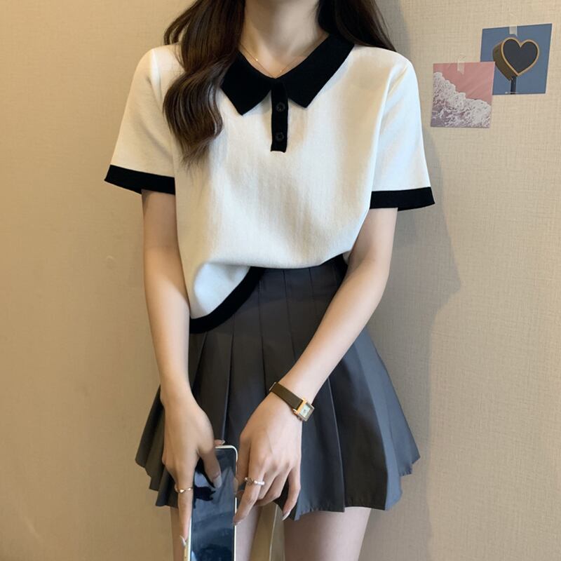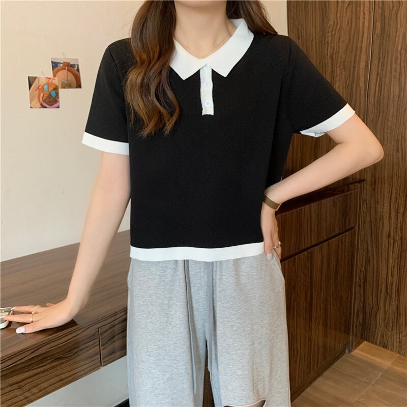ニット半袖トップ女性の夏の薄いアイスシルクポロシャツデザインハイウエストショートフロントショルダーホワイトTシャツイン ハイウェスト サマー 夏物 7460035033444900 | framboise21