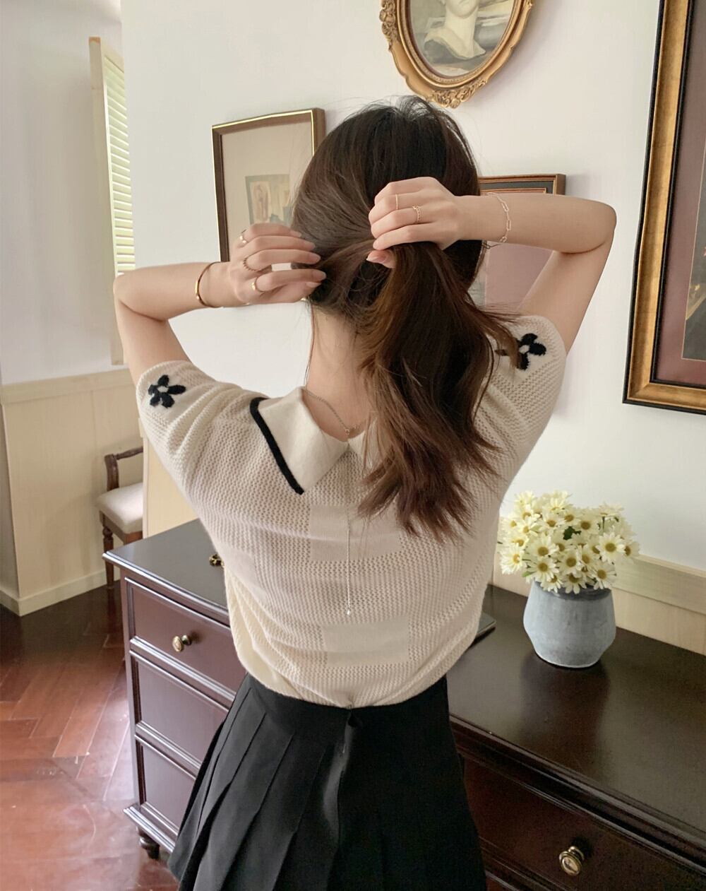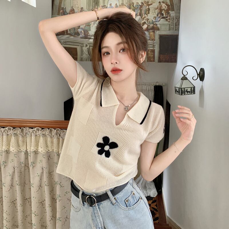 夏のユニークでシックな甘くてスパイシーな薄いトップティーティーホワイトポロカラー刺繍半袖Tシャツ女性 レッド 大人ガーリー スウィート キュート カジュアル サマー 夏物 7460058740921421 | framboise21