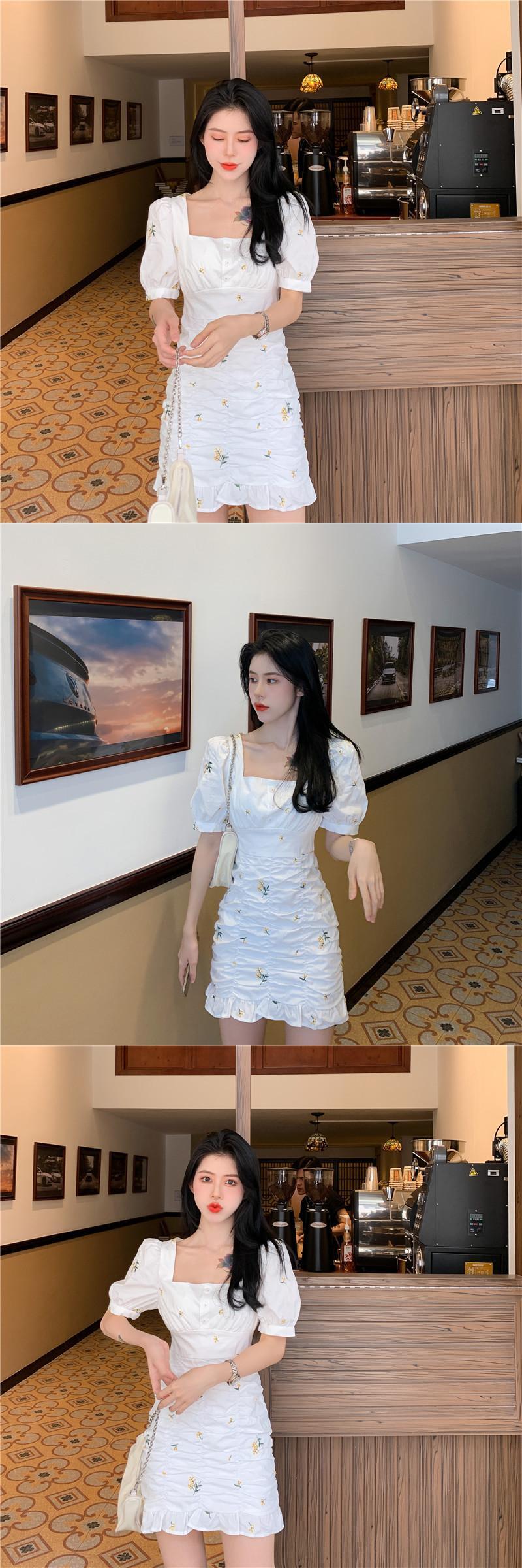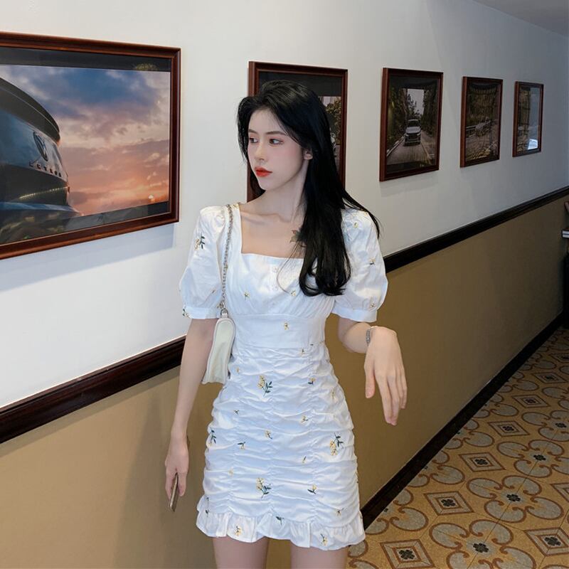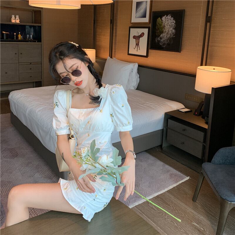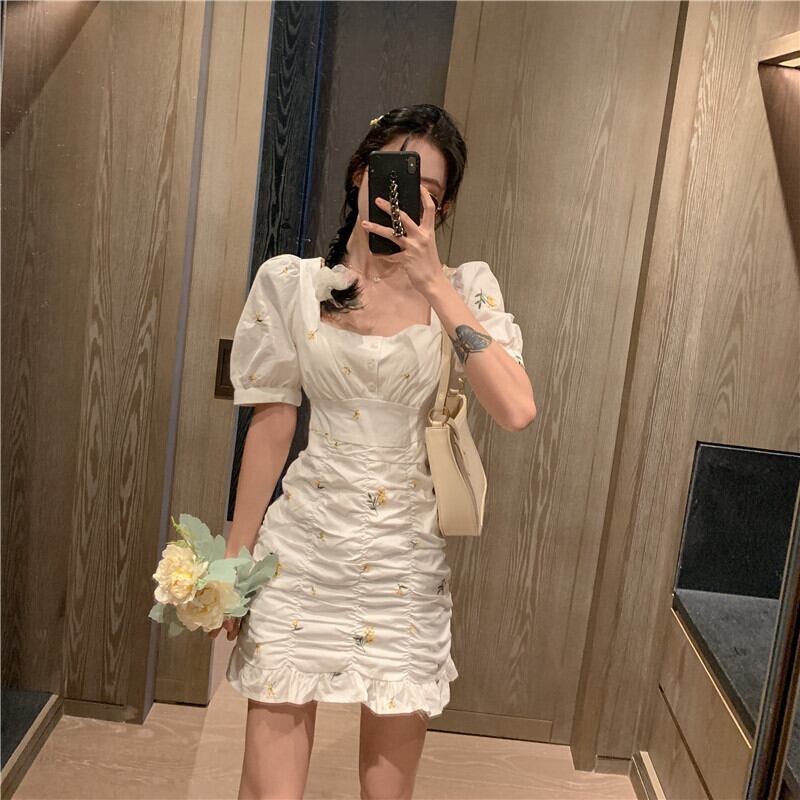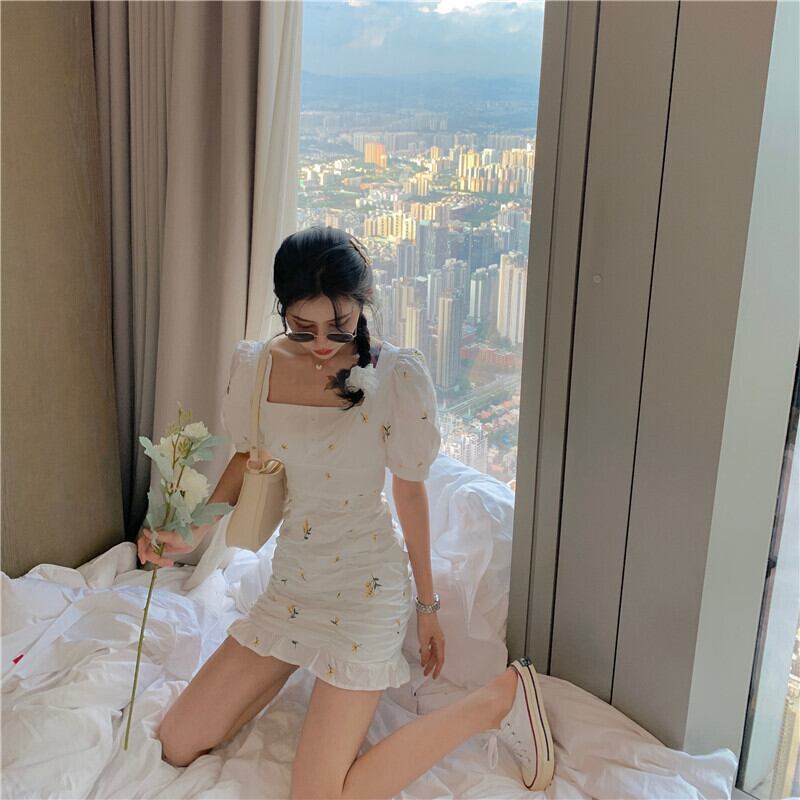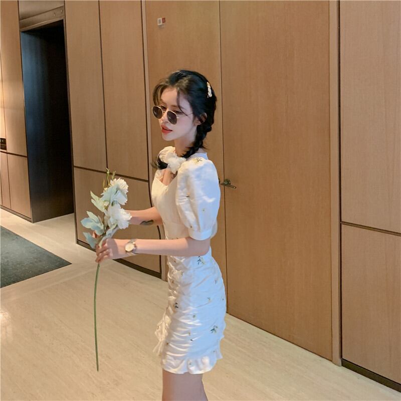ピュアデザイアフレンチニッチウエストと細いスクエアネックフィッシュテールバッグヒップブレイクフラワーパフスリーブホワイトファーストラブドレス女性夏 サマー 夏物 フラワーデザイン スクウェア 746007257460288 | framboise21