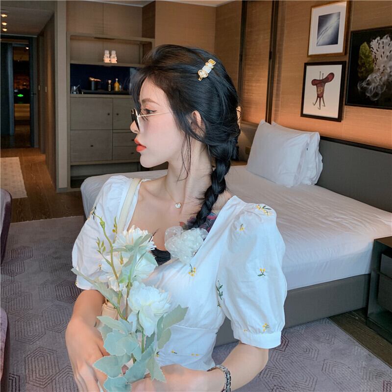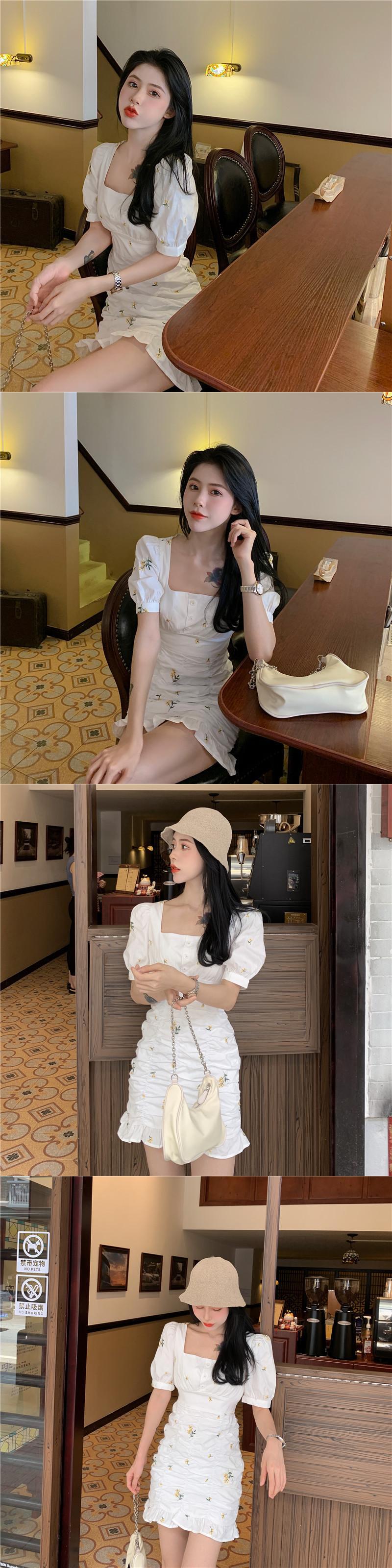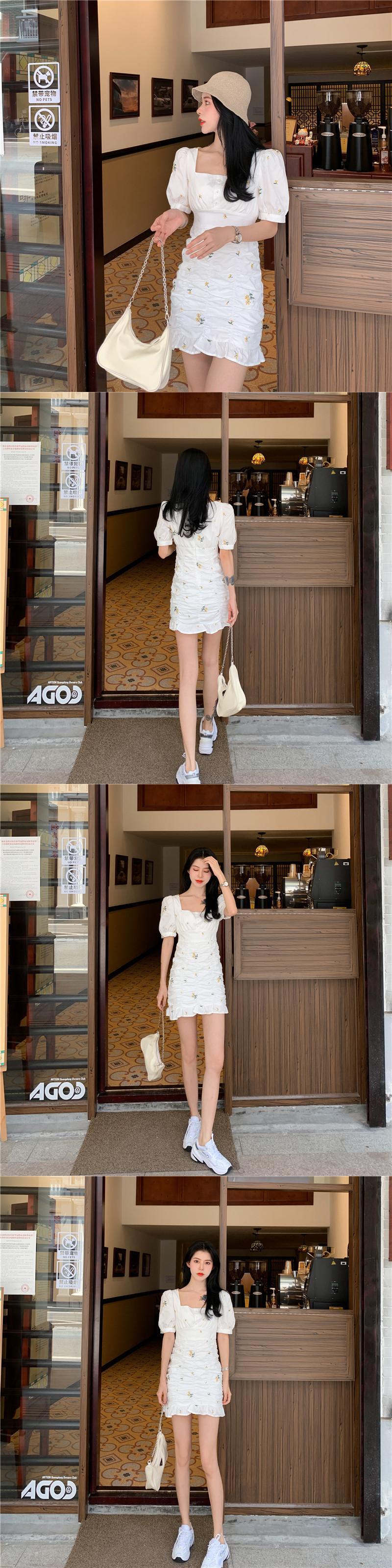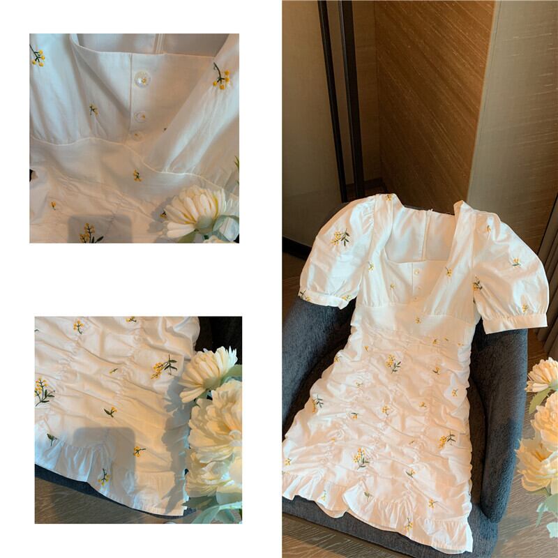 ピュアデザイアフレンチニッチウエストと細いスクエアネックフィッシュテールバッグヒップブレイクフラワーパフスリーブホワイトファーストラブドレス女性夏 サマー 夏物 フラワーデザイン スクウェア 746007257460288 | framboise21