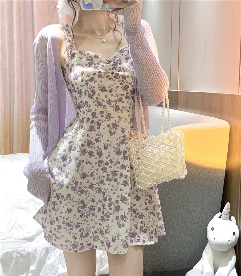 2022年新作フレンチファーストラブスモールシフォンパープルフローラルサスペンダードレスカーディガンツーピーススーツ女性夏 サマー 夏物 花柄 7460069111744948 | framboise21