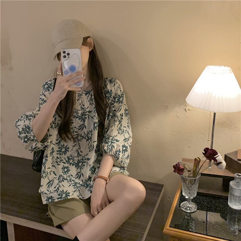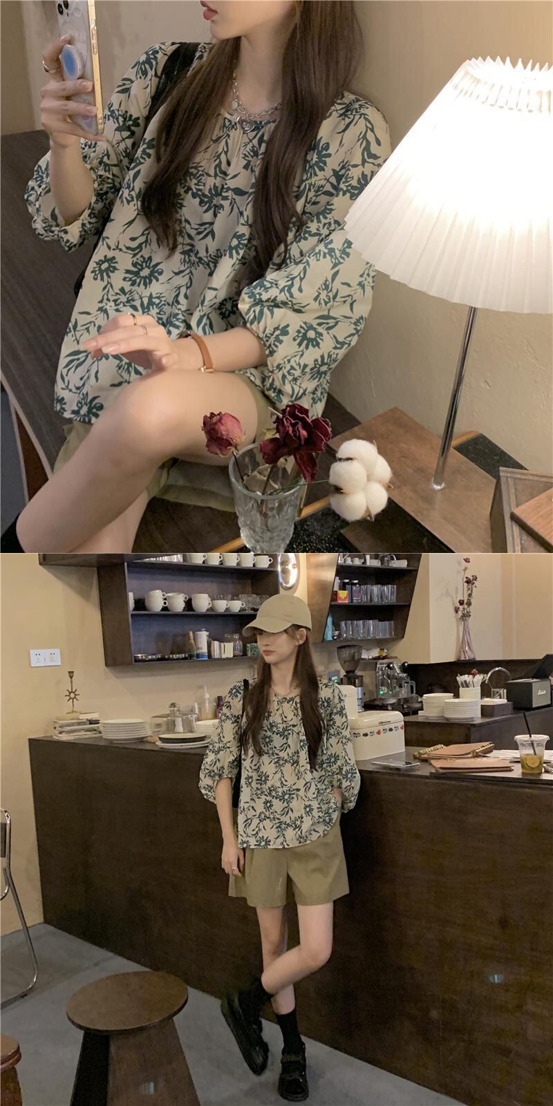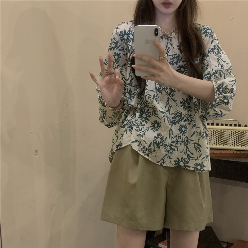 色:フラワーシャツ,カーキショートパンツ