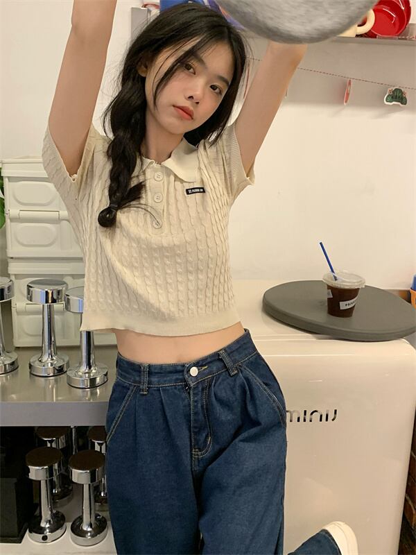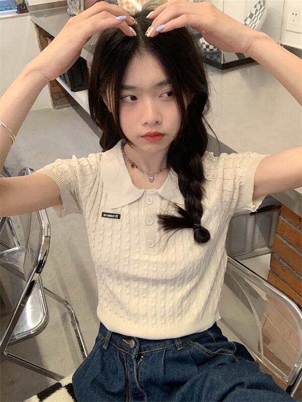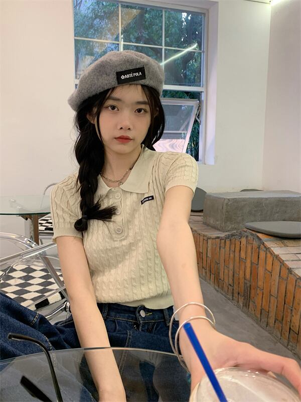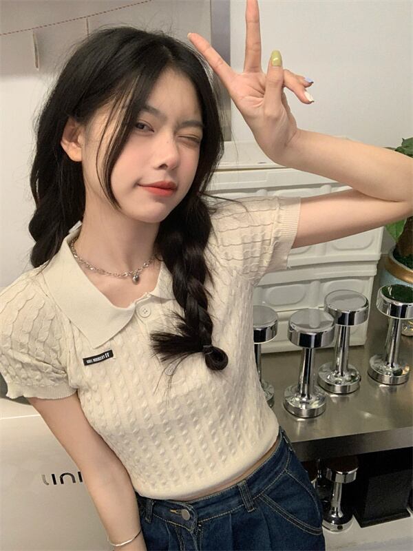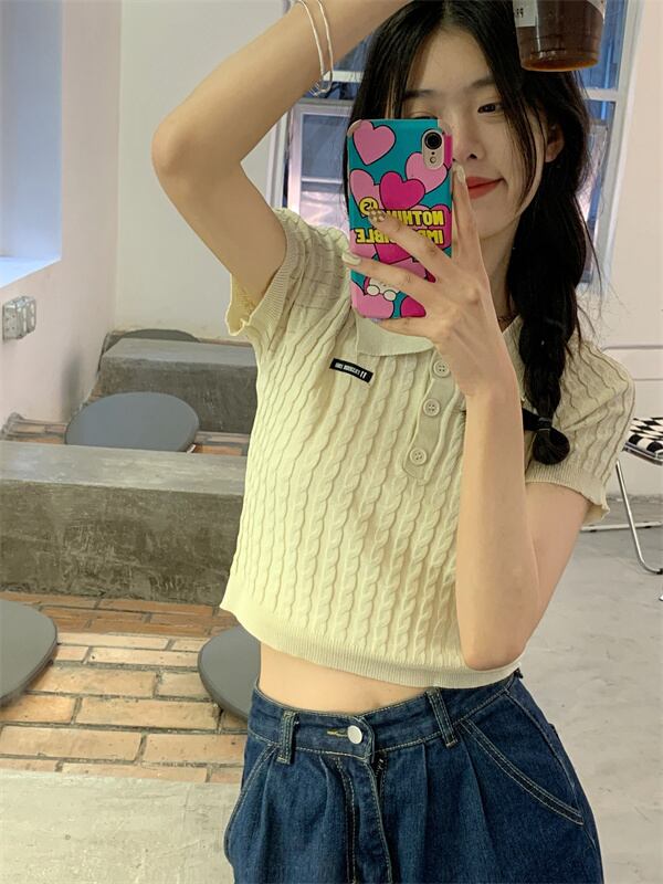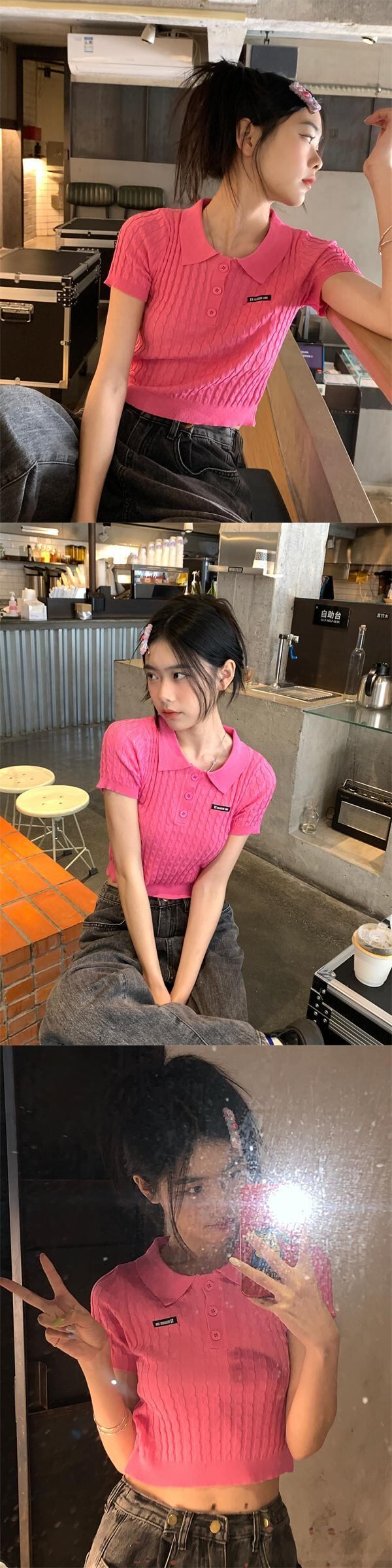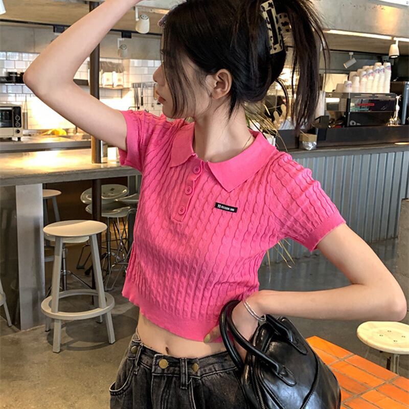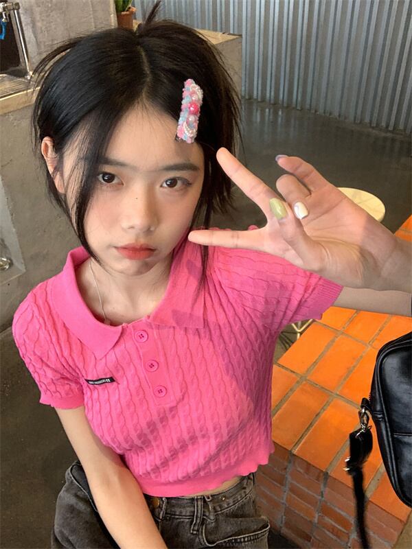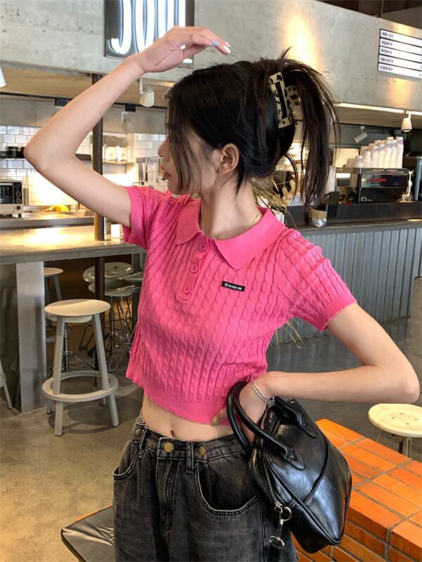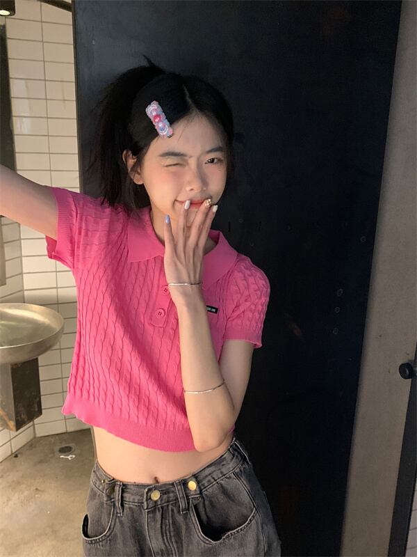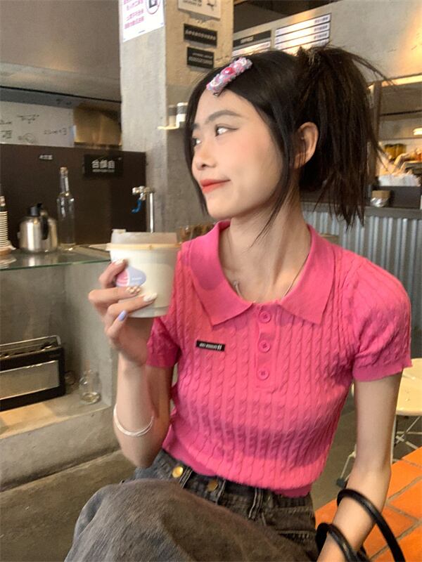 ラズベリーピンクのフロントショルダーポロシャツニット半袖Tシャツレディースサマースウィートでスパイシーなbmスタイルのショートトップ、ハイウエストパンツ ハイウェスト ハーフスリーブ 大人ガーリー キュート カジュアル 夏物 7460054535746223 | framboise21
