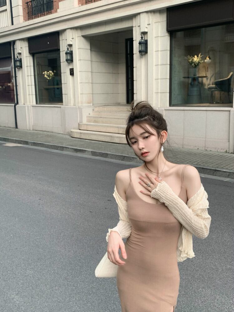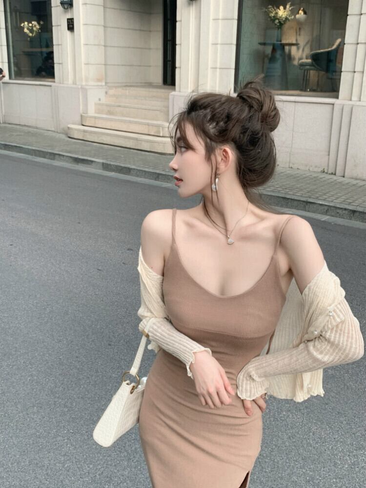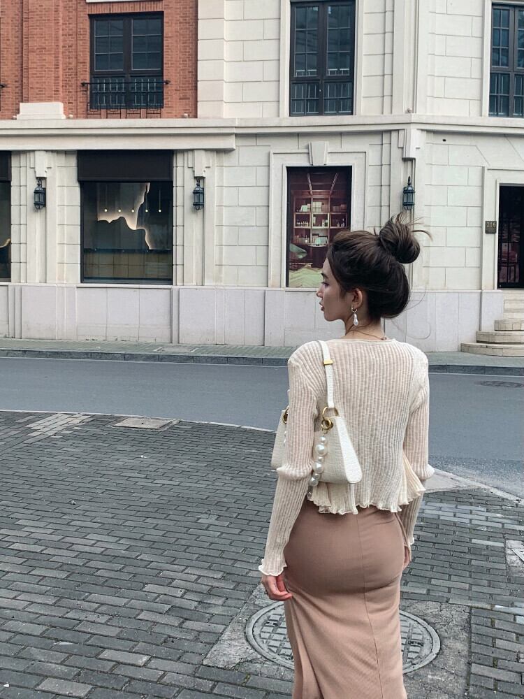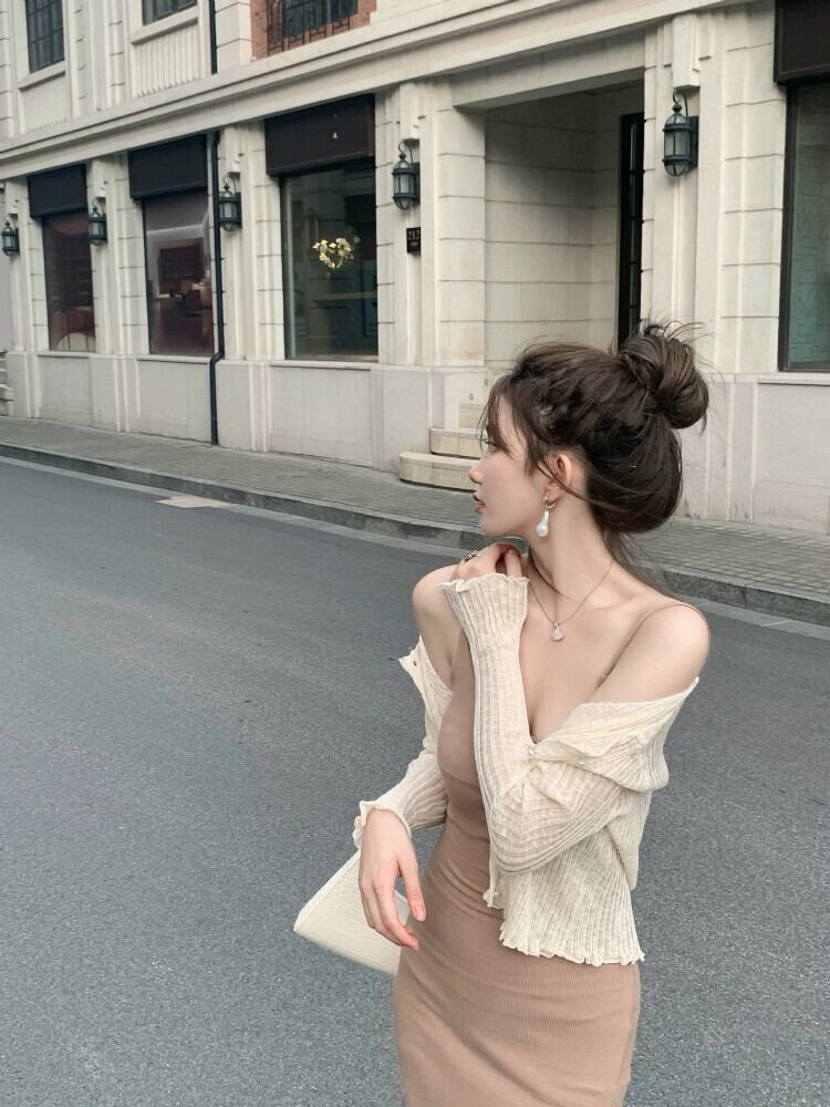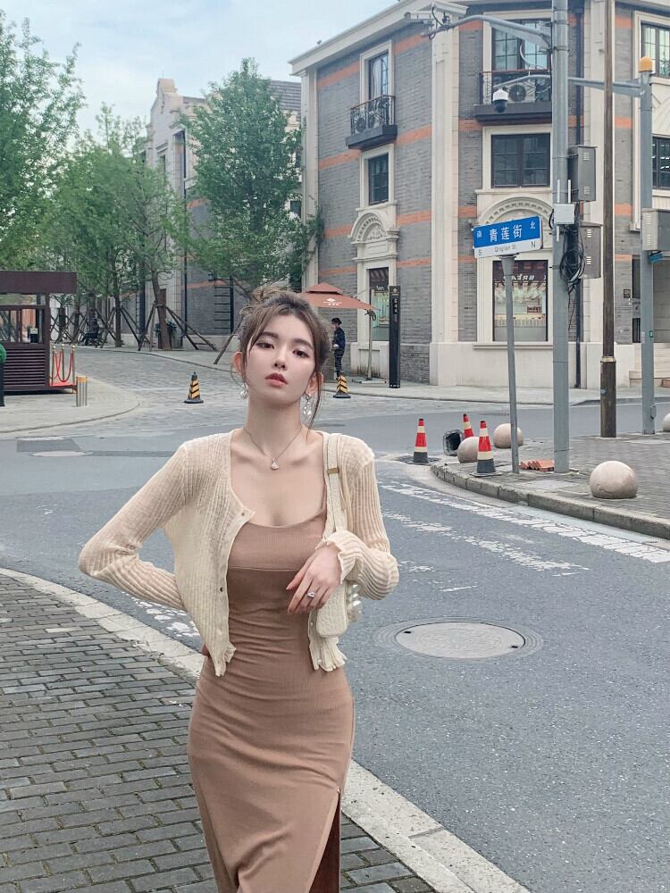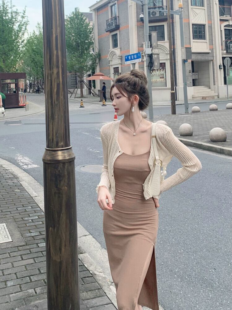 アイスシルクの薄いニットの日焼け止めカーディガンコートの女性は、サスペンダースカートとアプリコットのショートショールブラウスで夏を過ごします サマー 夏物 7460041392553772 | framboise21