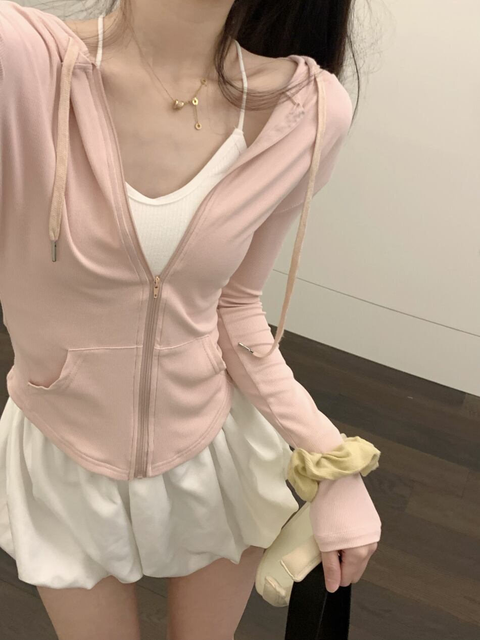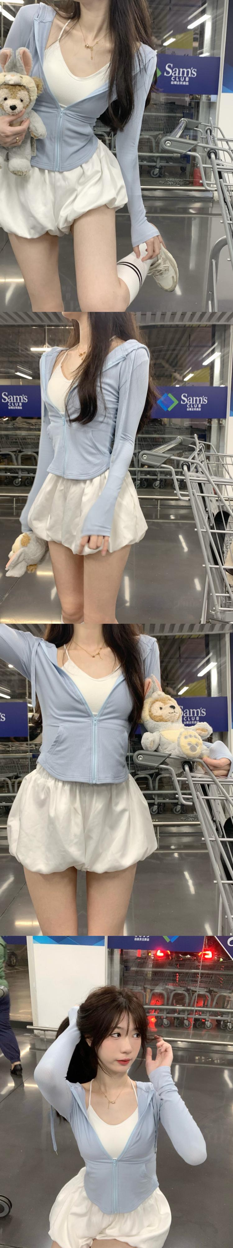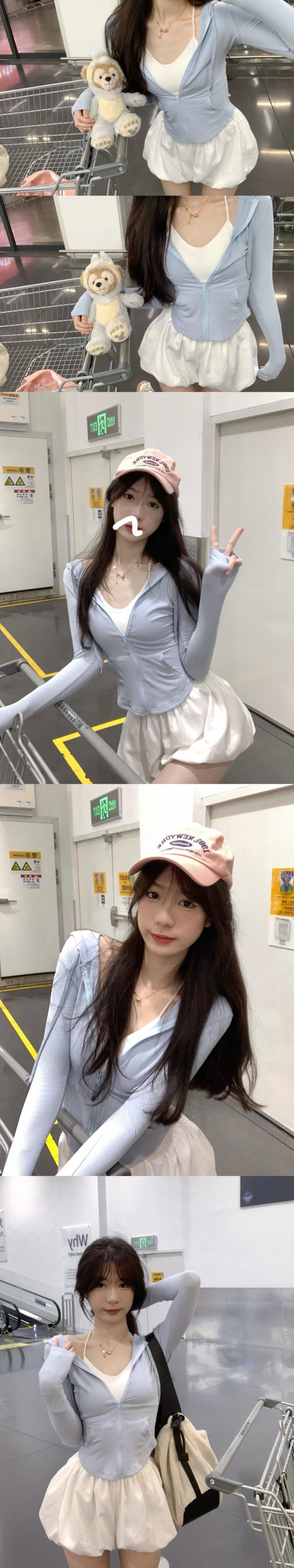 ブルーのフード付き日焼け止め服女性の夏のデザインセンススリムアウターウェアショートシンイレギュラースポーツカーディガンジャケット サマー 夏物 7460086942238571 | framboise21