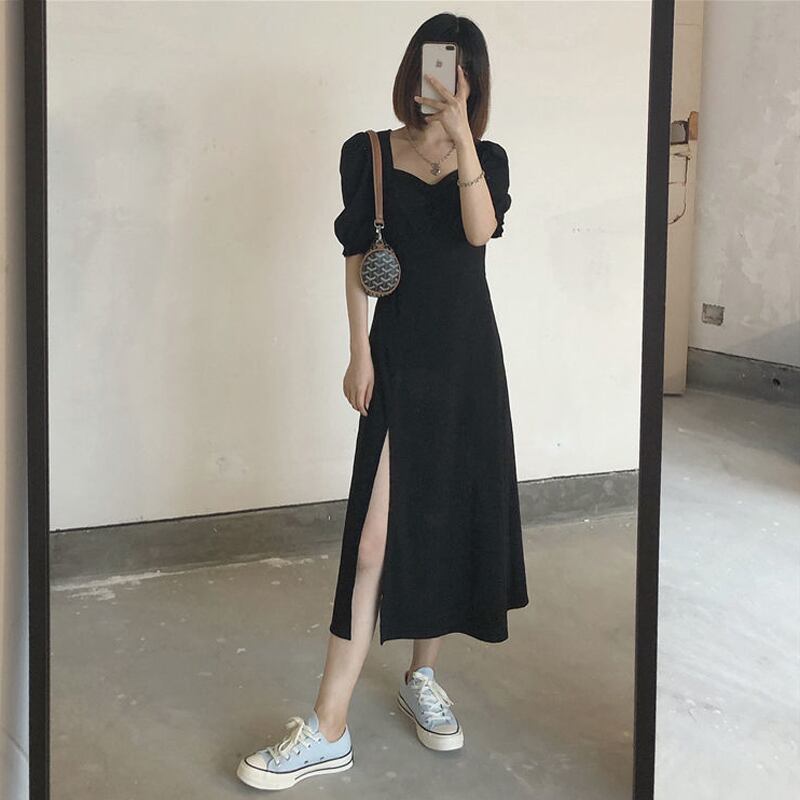 フレンチパフスリーブブラックスクエアネックドレス女性2022夏新しい小さな気質ヘップバーンスタイルリトルブラックドレス サマー 夏物 スクウェア 7460083038237468 | framboise21