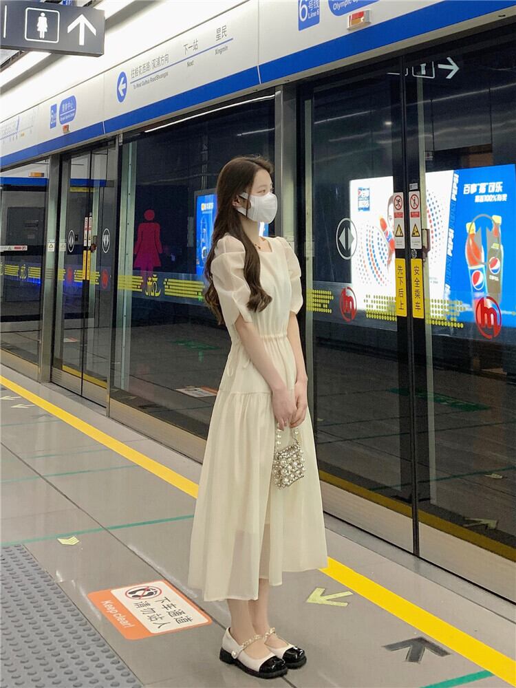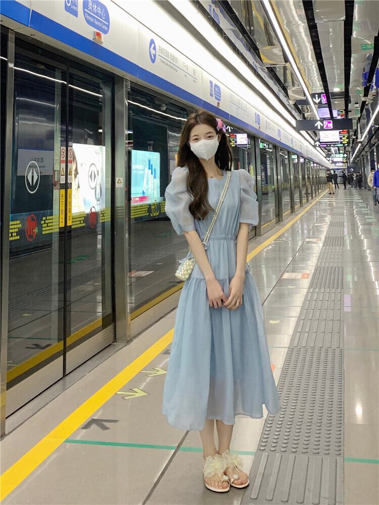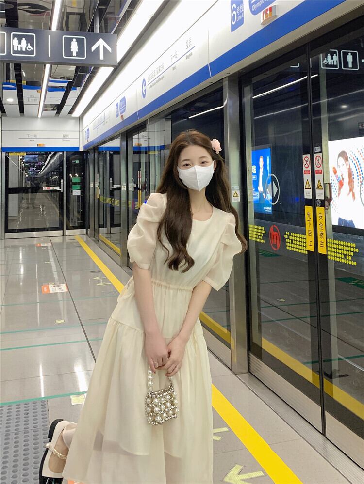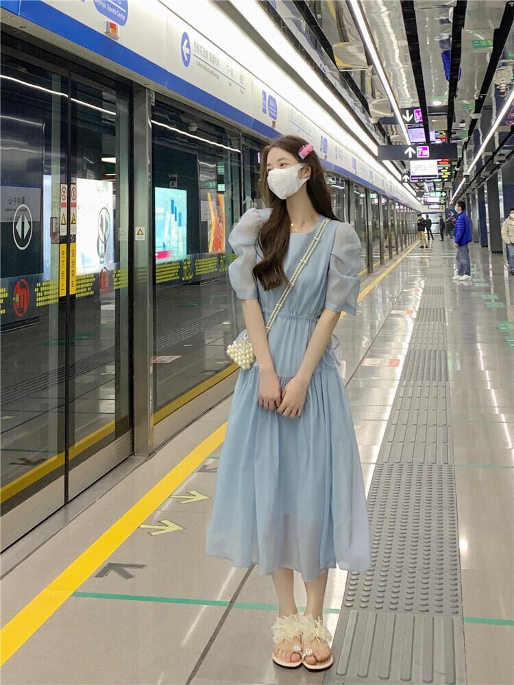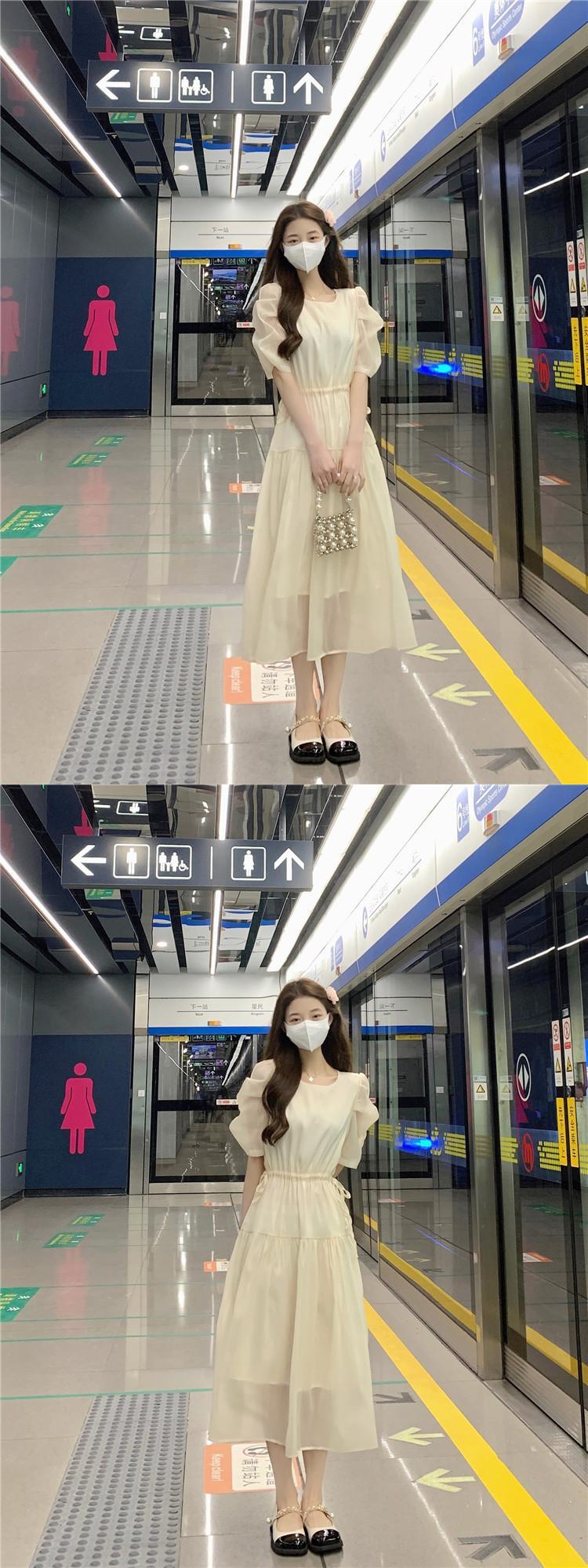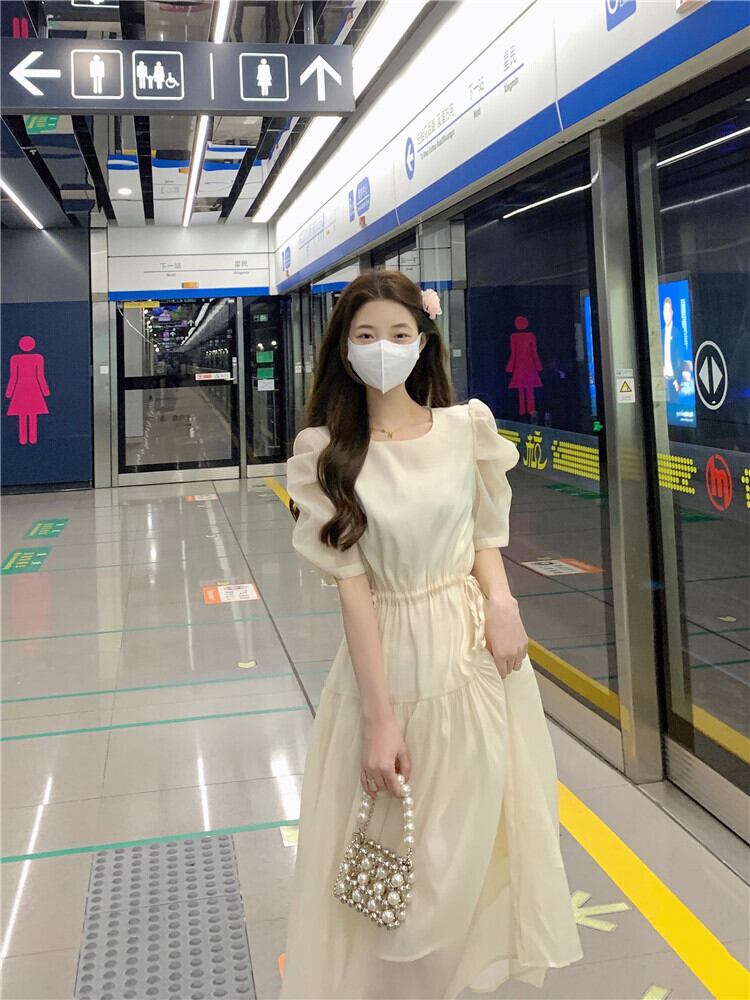 フランスの甘い気質バブル半袖シフォンドレス女性の夏の巾着ウエストミドル丈の妖精のエストスカート 大人ガーリー スウィート キュート カジュアル サマー 夏物 7460072761541912 | framboise21