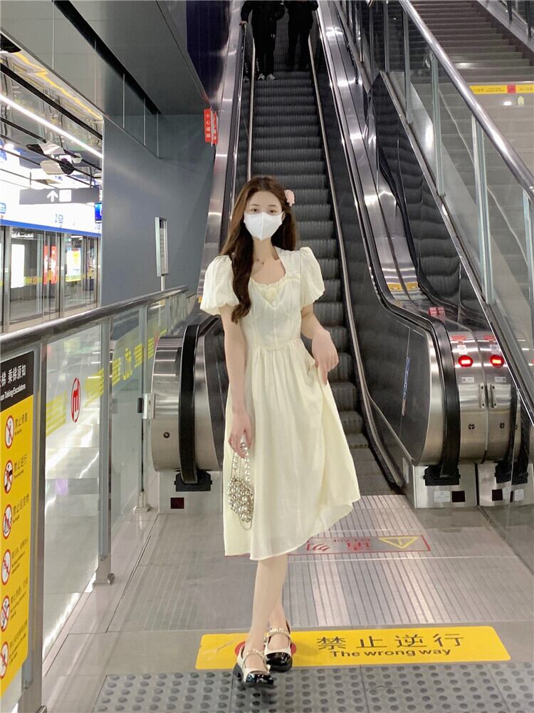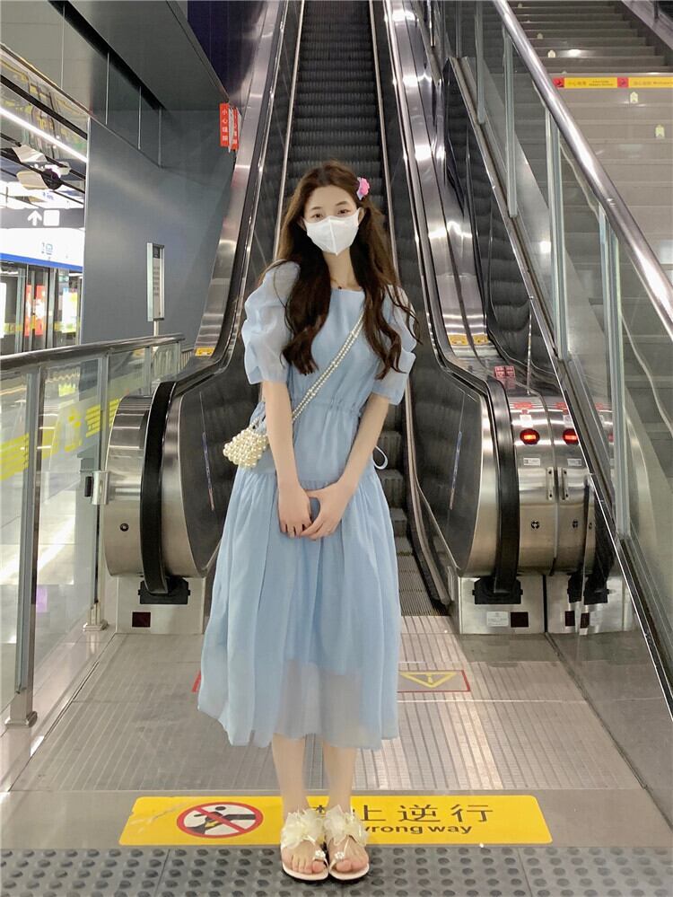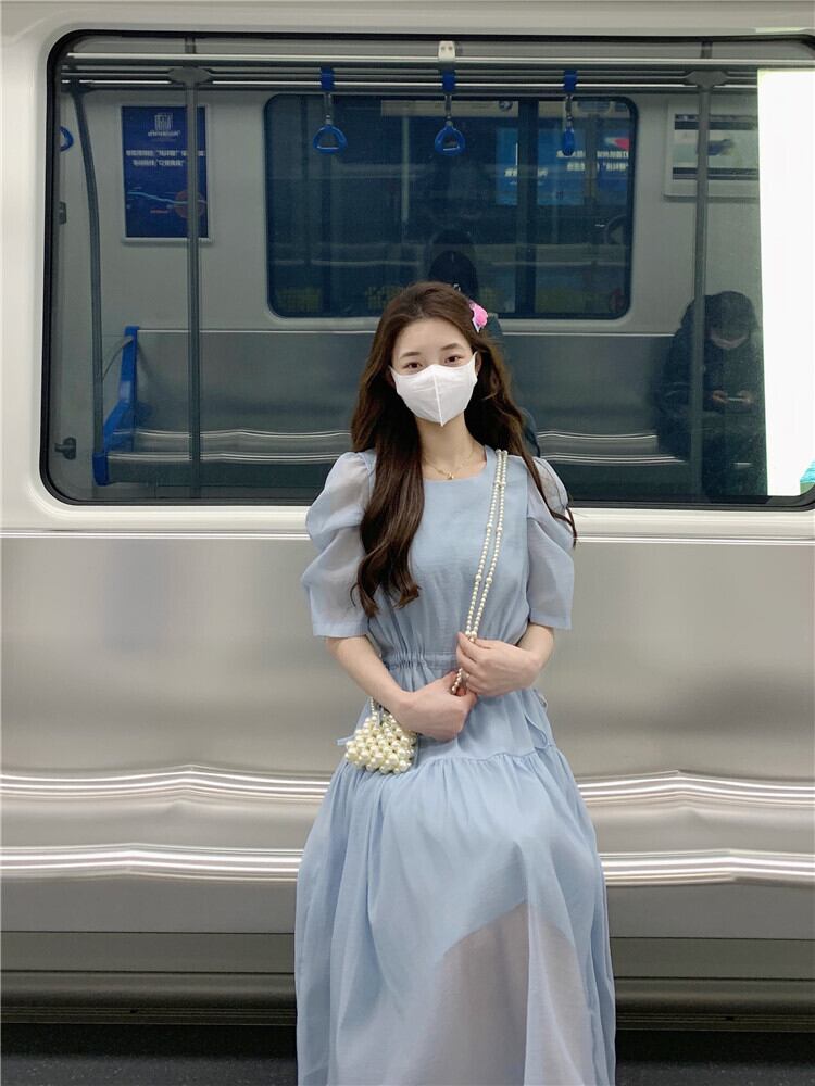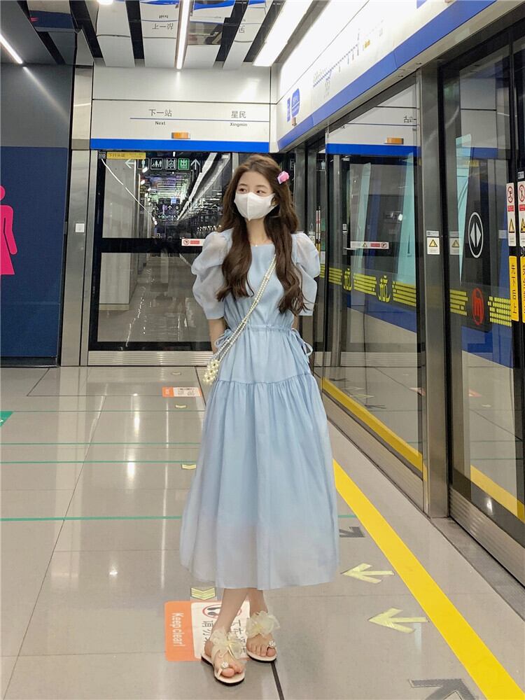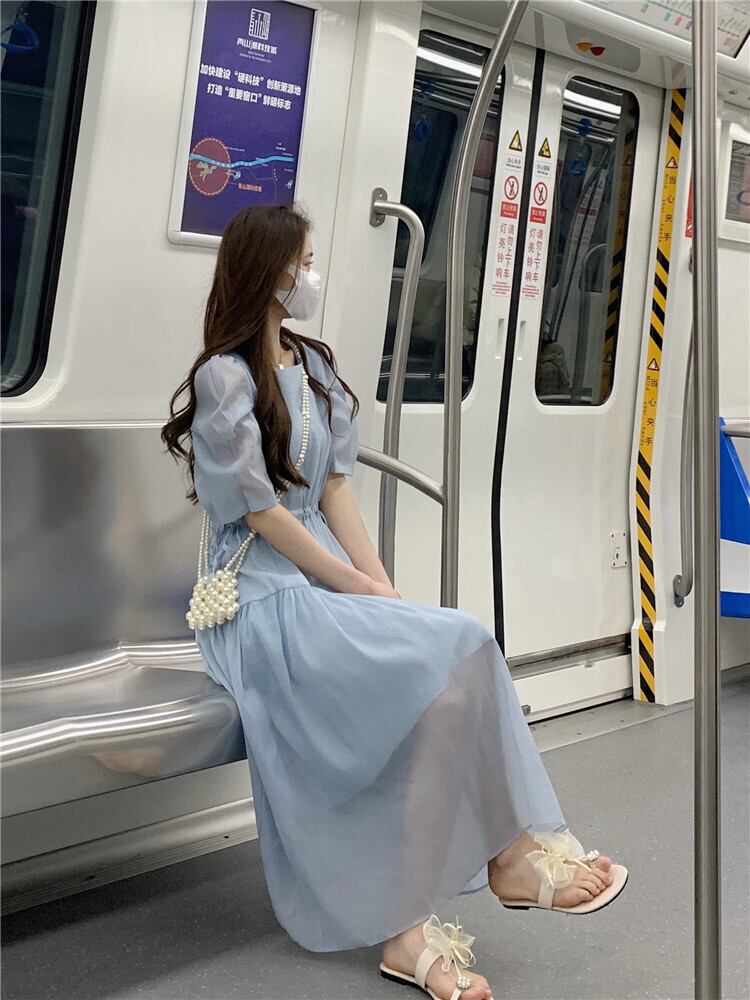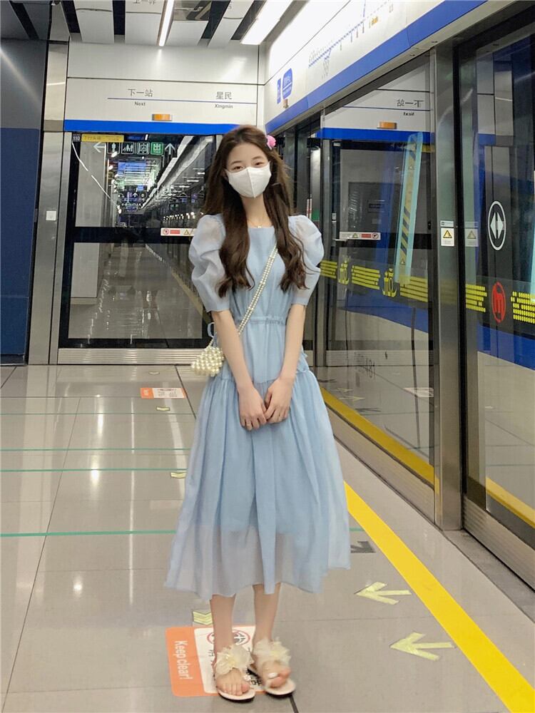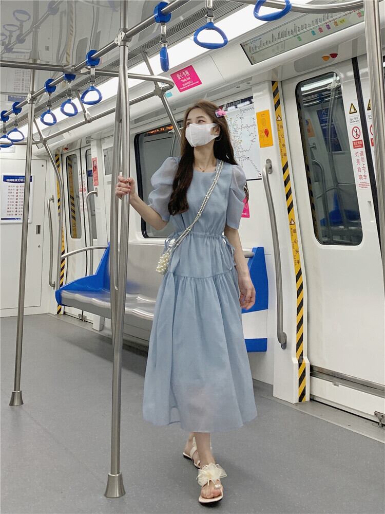 フランスの甘い気質バブル半袖シフォンドレス女性の夏の巾着ウエストミドル丈の妖精のエストスカート 大人ガーリー スウィート キュート カジュアル サマー 夏物 7460072761541912 | framboise21
