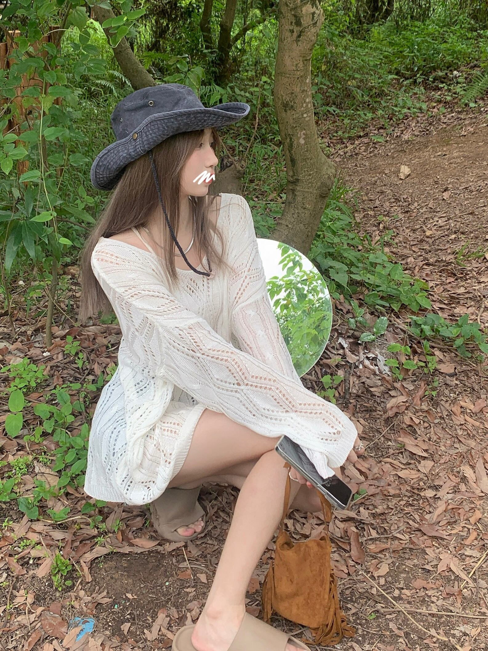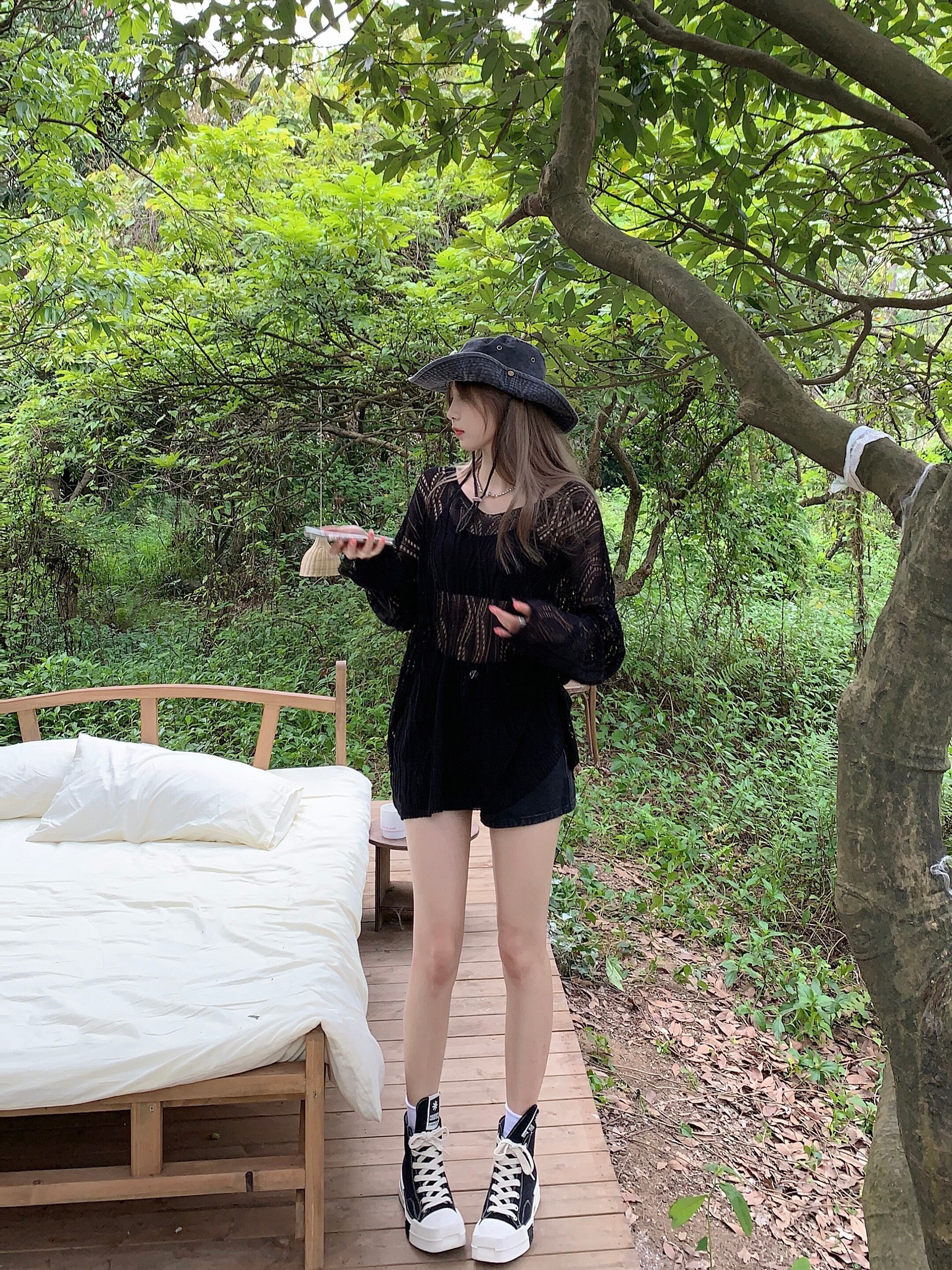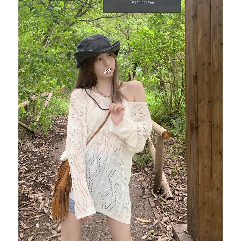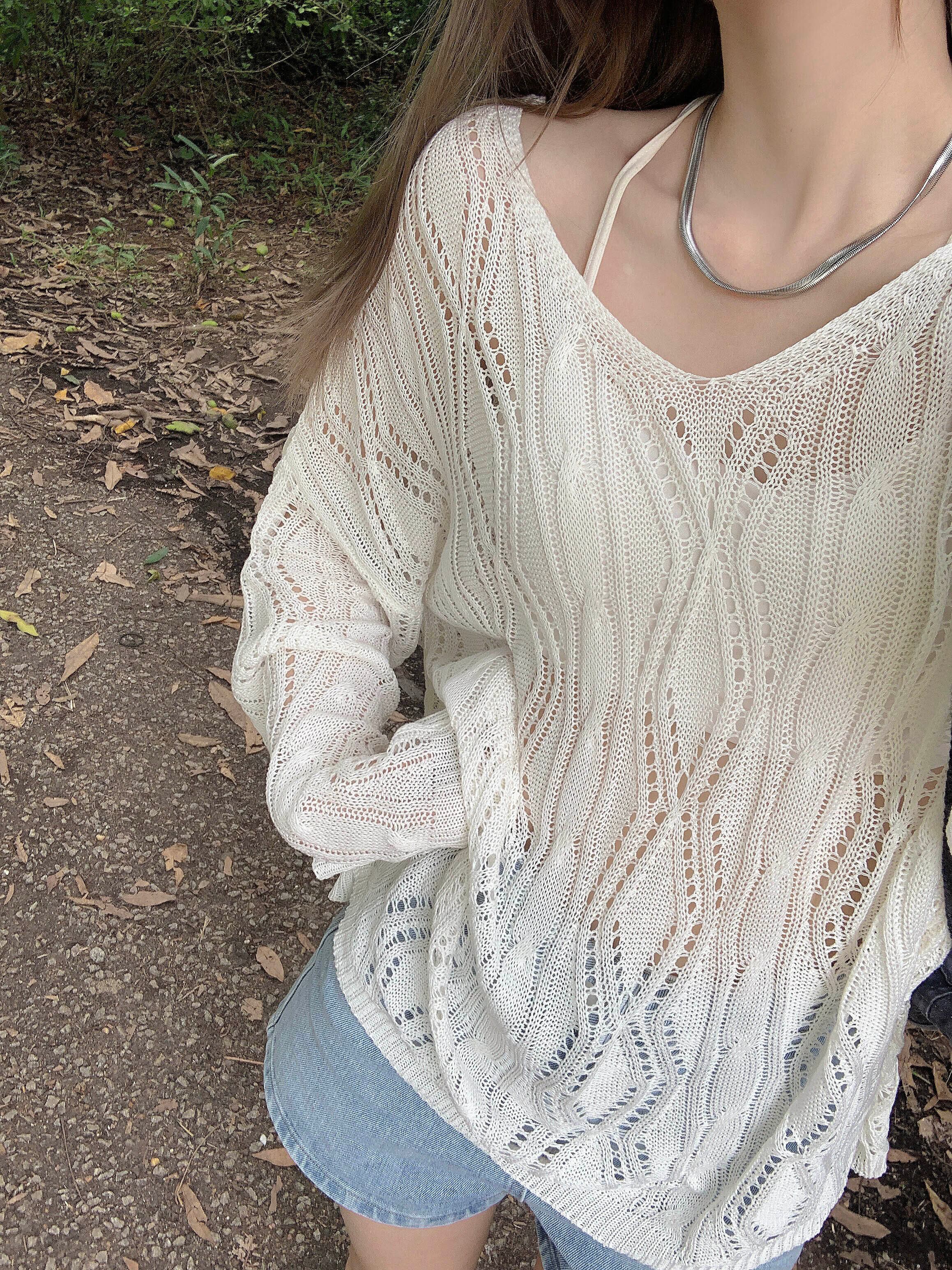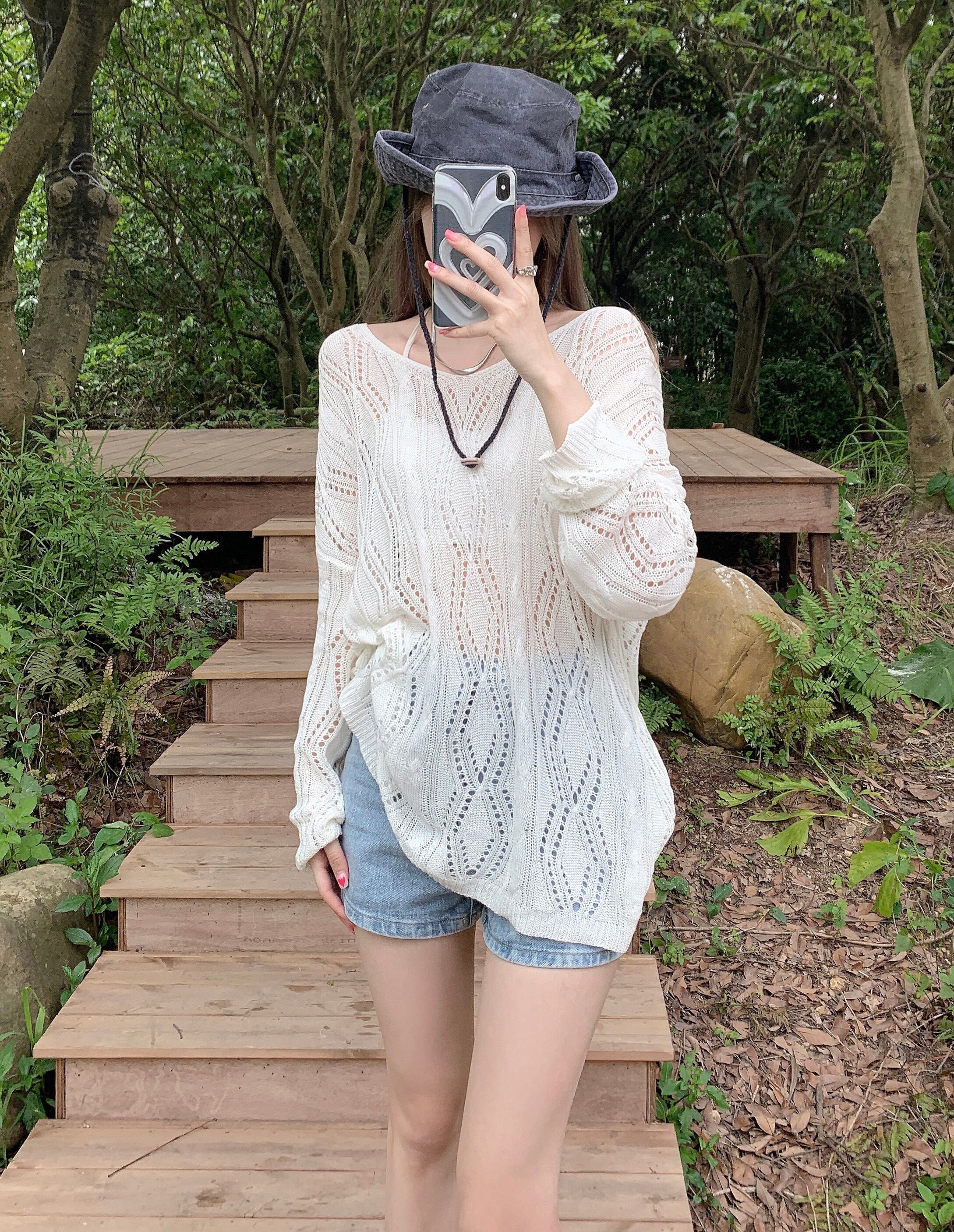 白い日焼け止めブラウス女性の夏のアイスシルクニットトップ、ルーズなデザインとオープンバックの長袖Tシャツを着た2枚 ロング ホワイト サマー 夏物 7460069073062725 | framboise21
