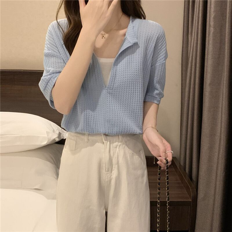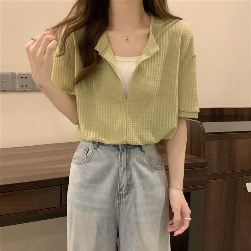 フェイクツーピースワッフルVネック半袖Tシャツレディース2022年夏デザインセンスニッチアイスシルクルーズショルダートップ薄手 サマー 夏物 7460080680359566 | framboise21