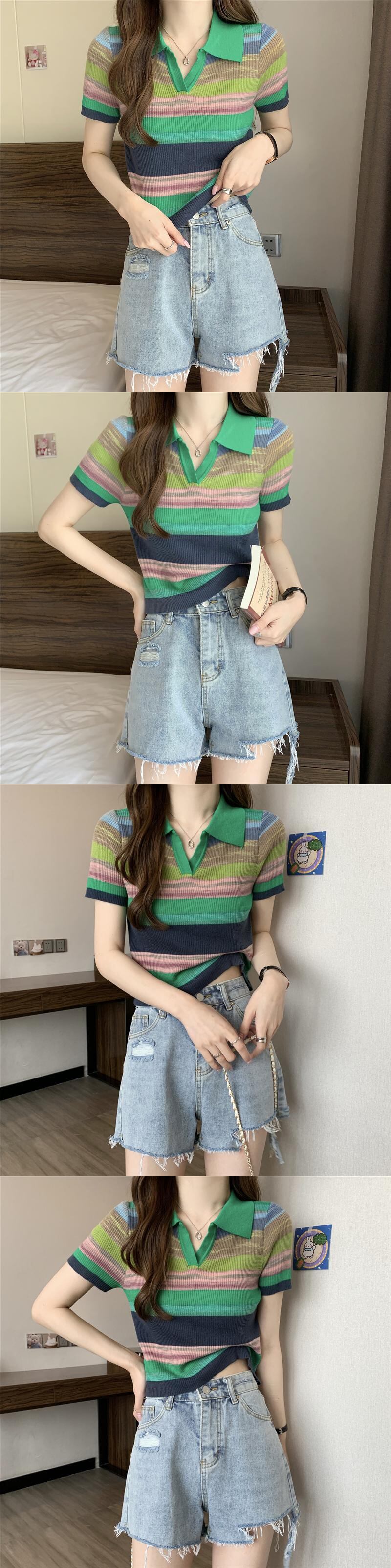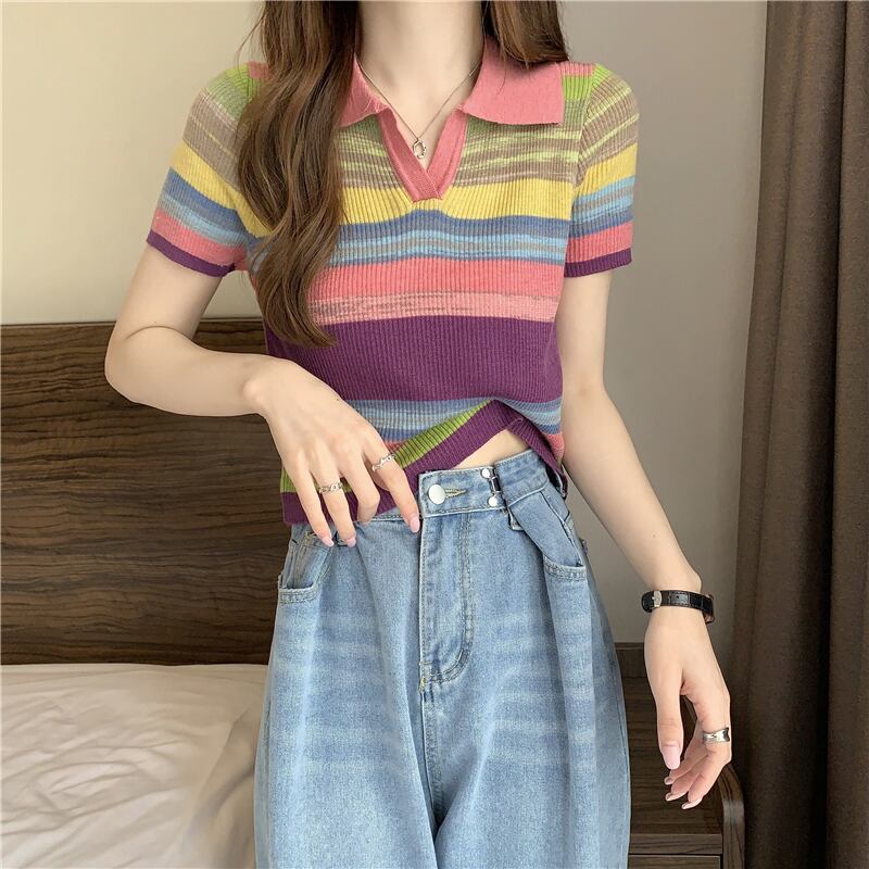 レインボーストライプポロシャツフロントショルダー半袖Tシャツレディース2022夏新作アイスシルクニットトップスリントレンディ ショート ハーフスリーブ サマー 夏物 7460067183207322 | framboise21