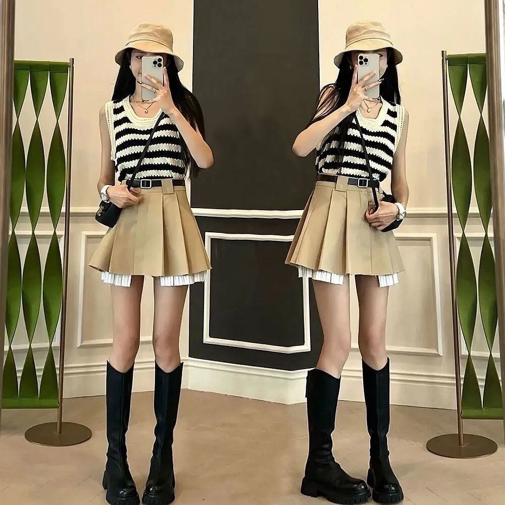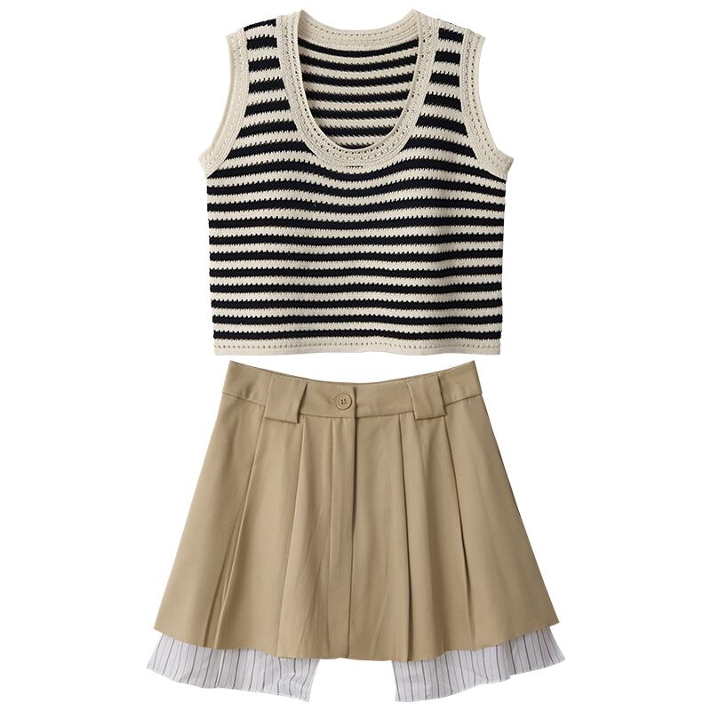 黒と白のストライプの中空ニットベスト女性の夏のデザインルーズアウターウェアショートサスペンダーノースリーブベスト ホワイト ブラック サマー 夏物 7460035331244050 | framboise21