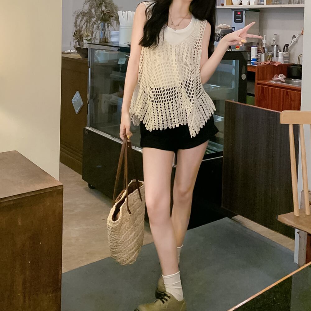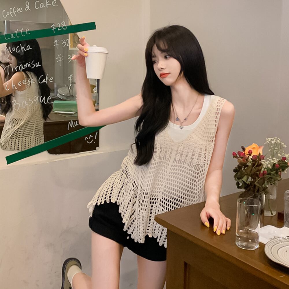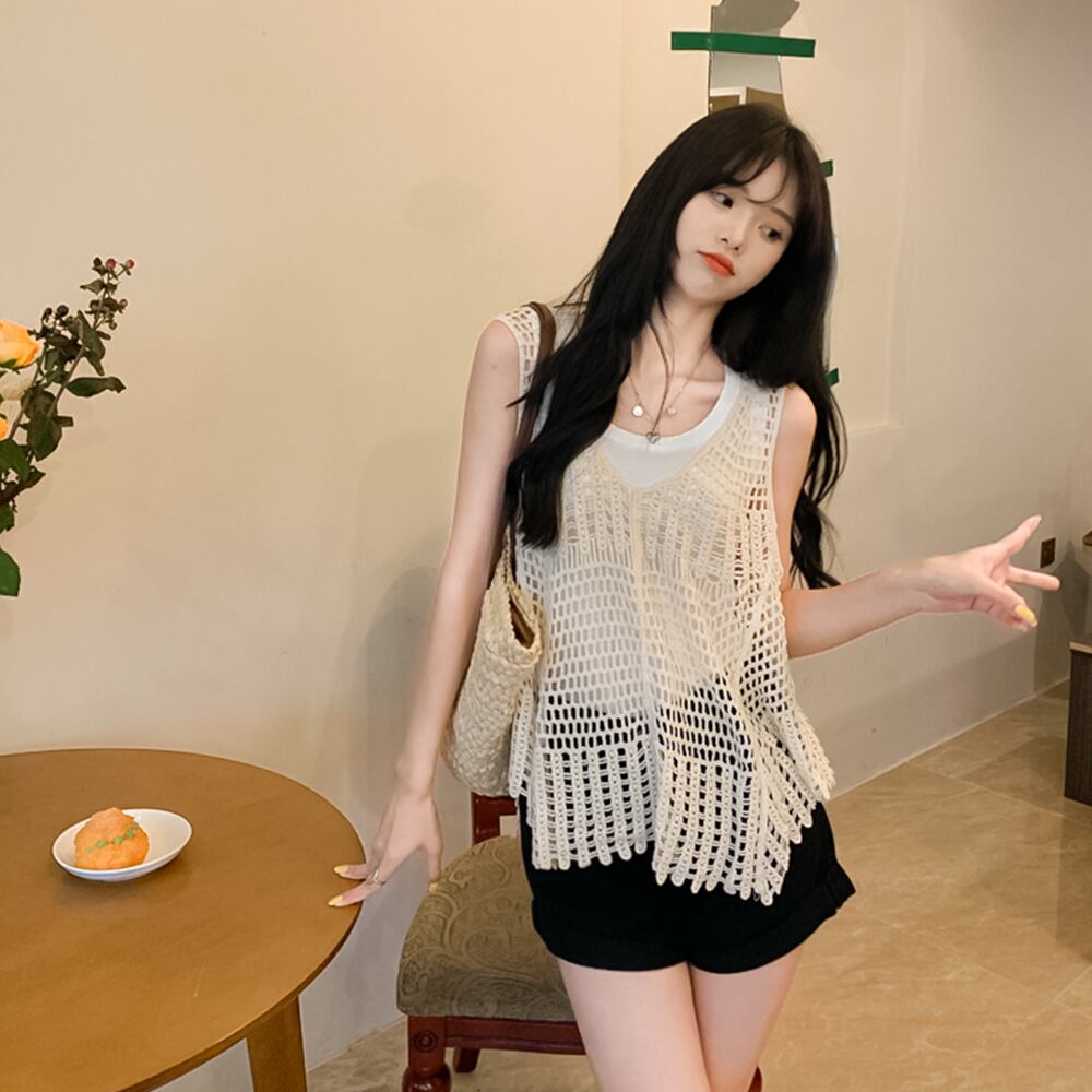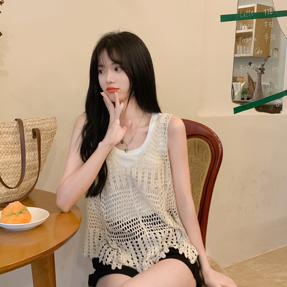 かぎ針編みの中空キャミソールの女性の夏のネットレッドのデザインは、薄いノースリーブのニットの日焼け止めトップで外にニッチを感じます サマー 夏物 7460041732549614 | framboise21