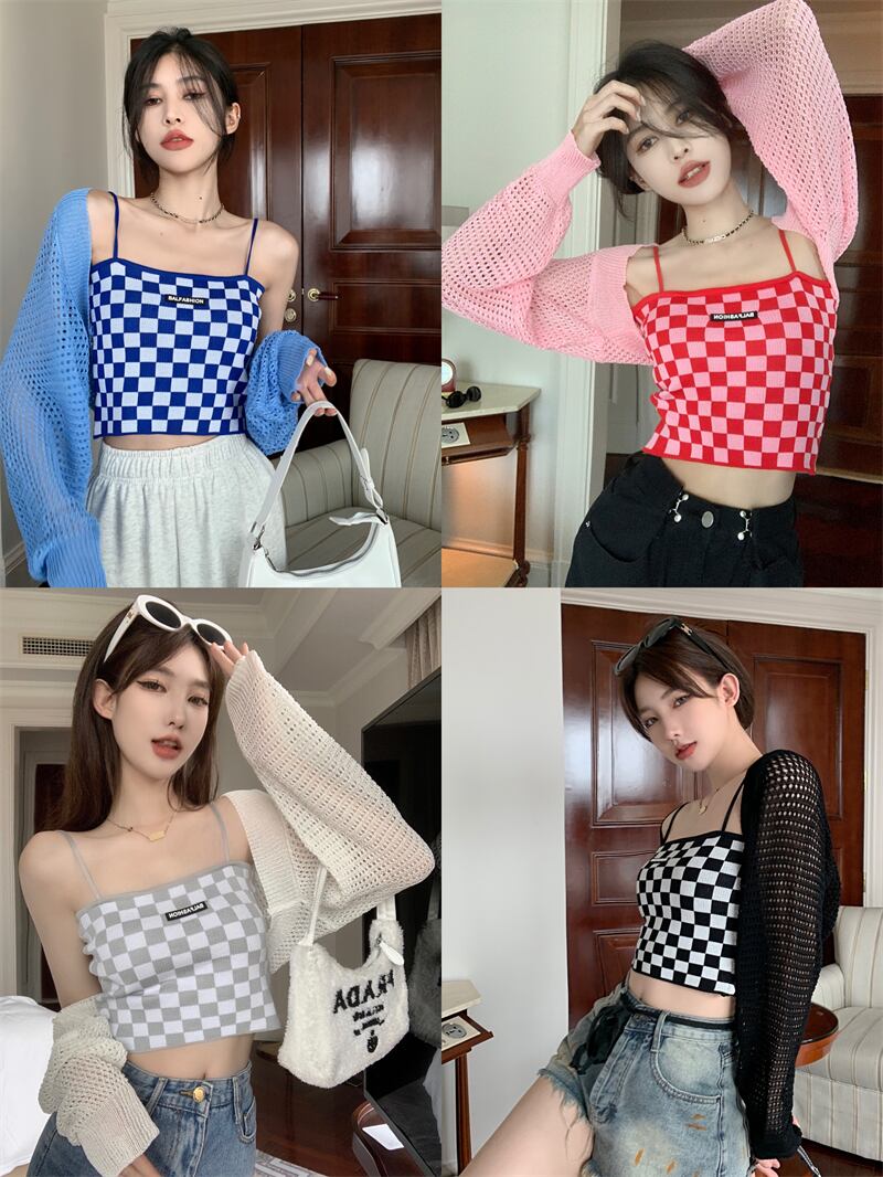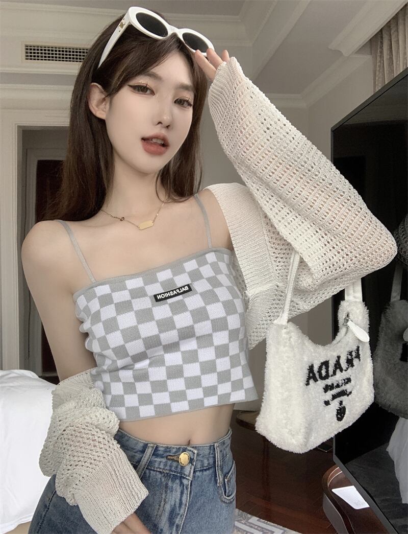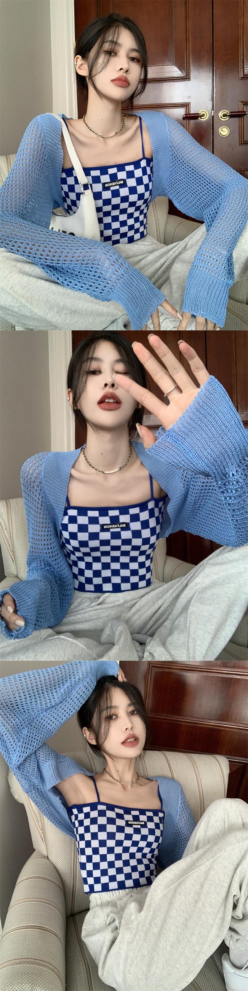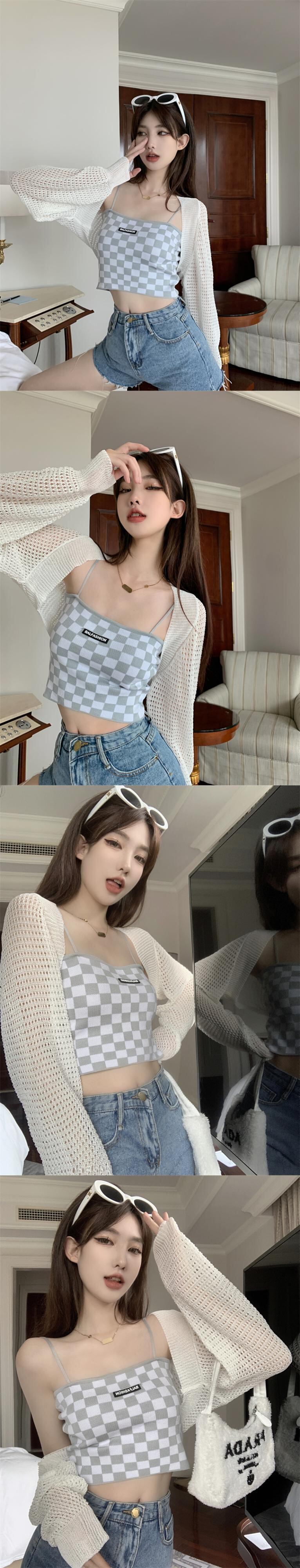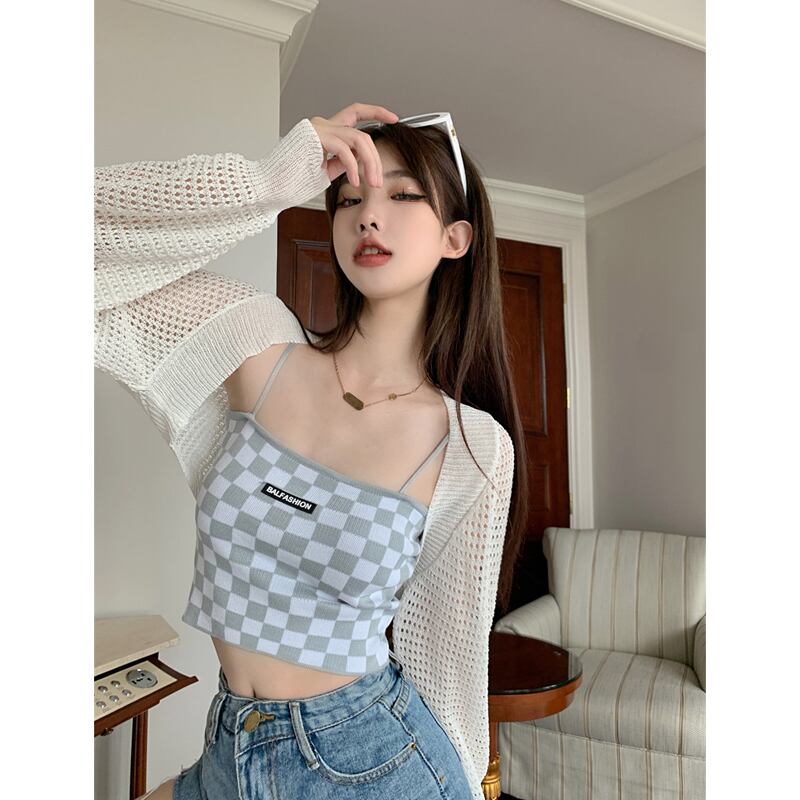 白い中空の日焼け止めカーディガン女性の夏の薄いニットのスモックコート、外側にサスペンダー、ハーフチョッキと小さなショール ホワイト サマー 夏物 7460043710586197 | framboise21