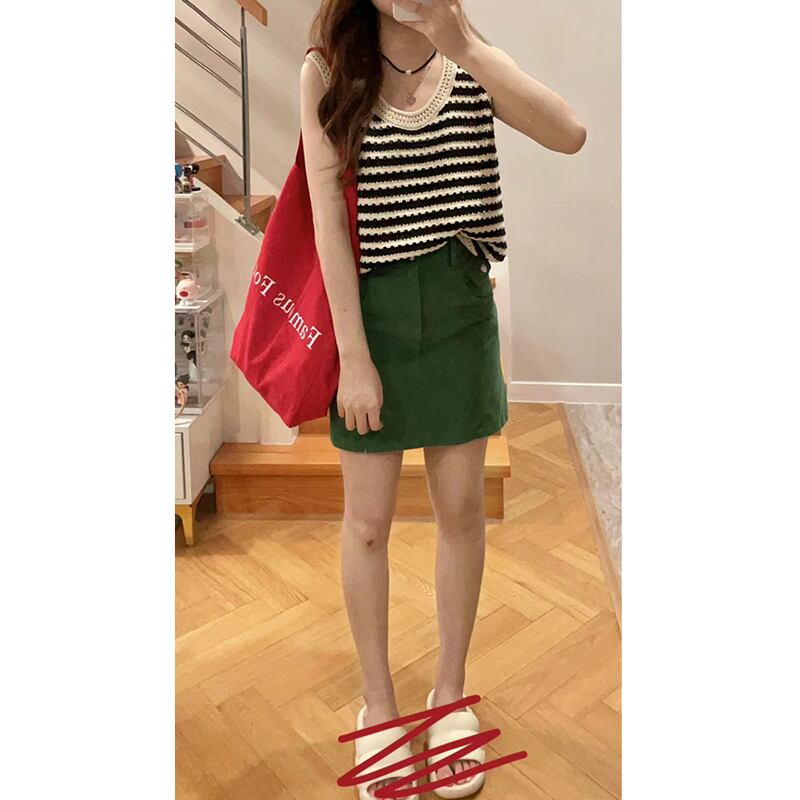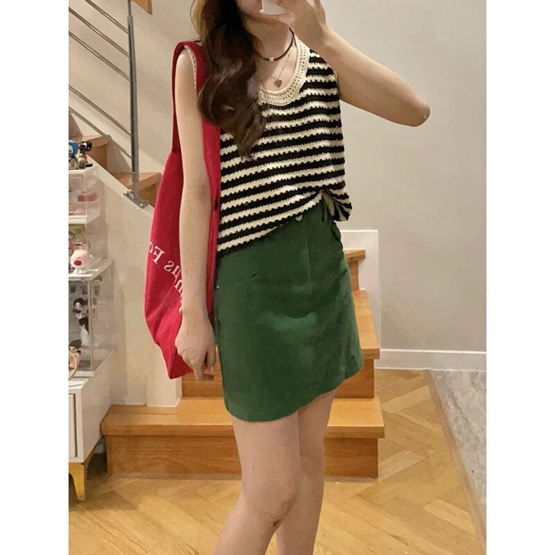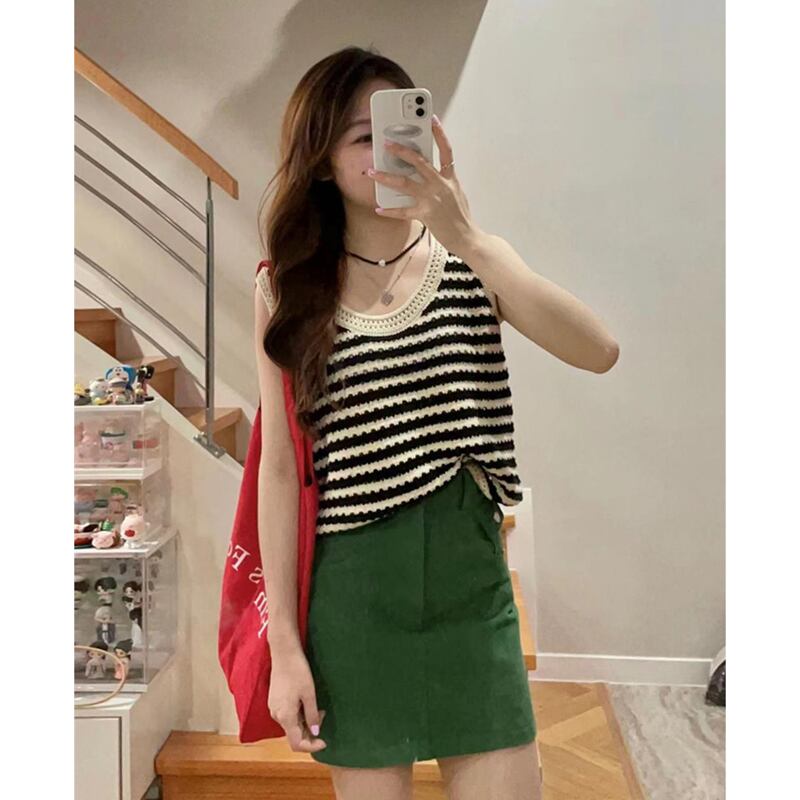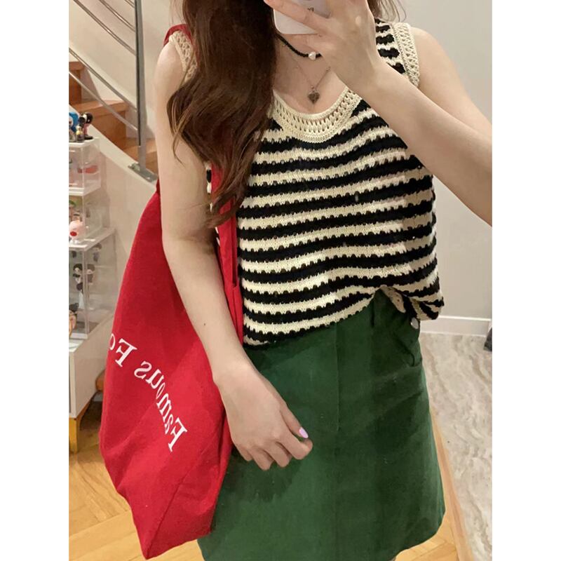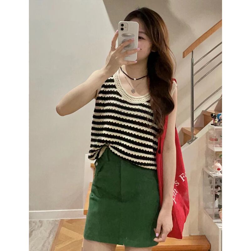 黒と白のストライプの中空ニットベストベストサスペンダー女性の2022年夏のデザインセンスニッチアウトサイドウェアノースリーブトップ ホワイト ブラック サマー 夏物 7460026189480614 | framboise21