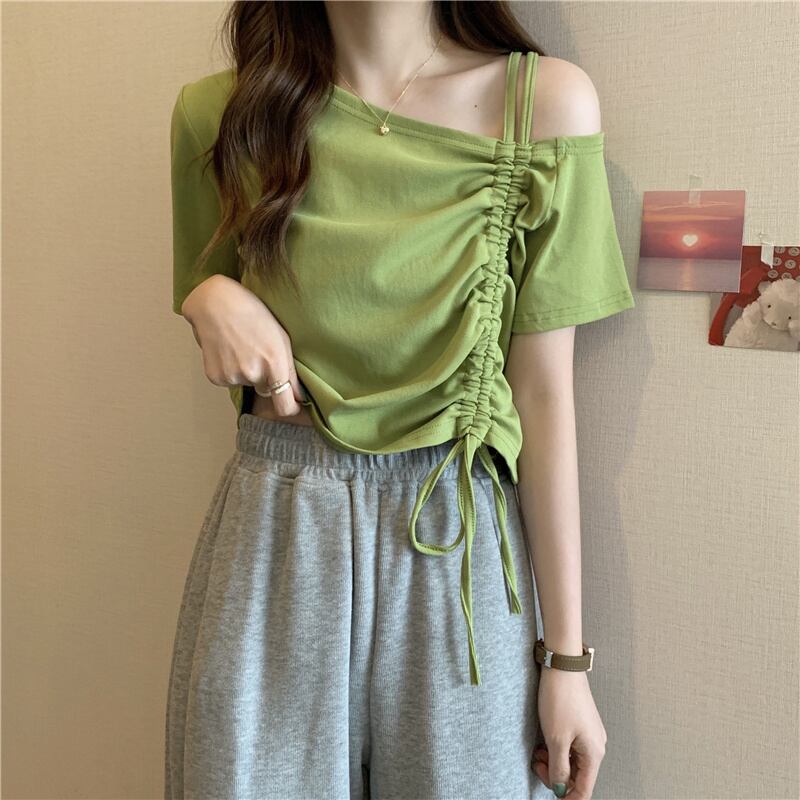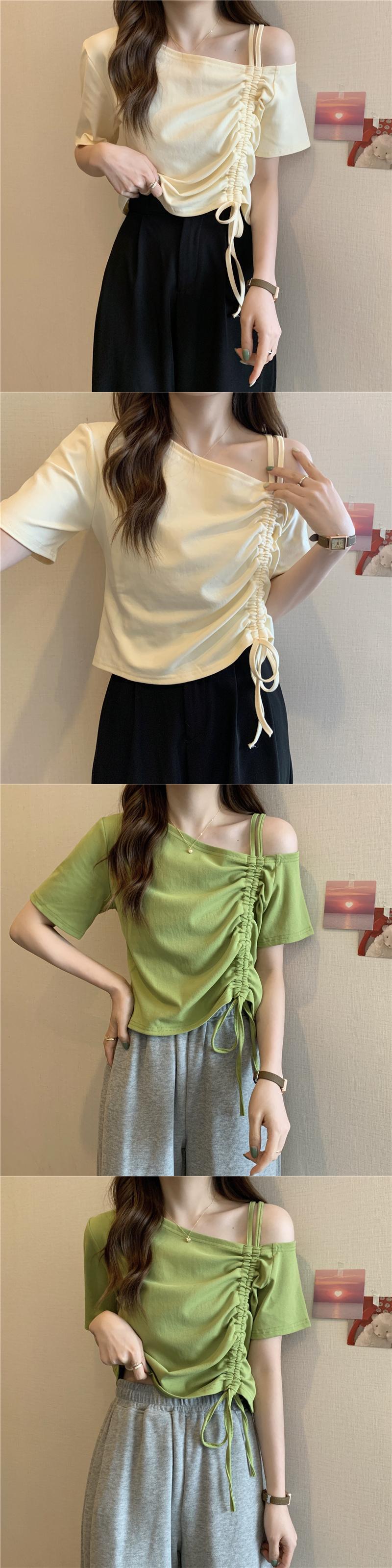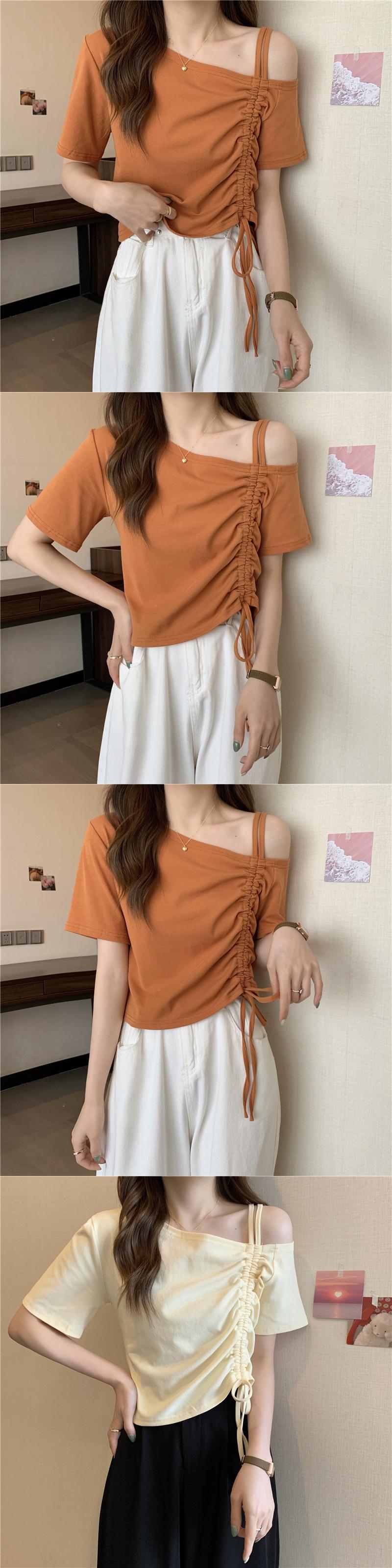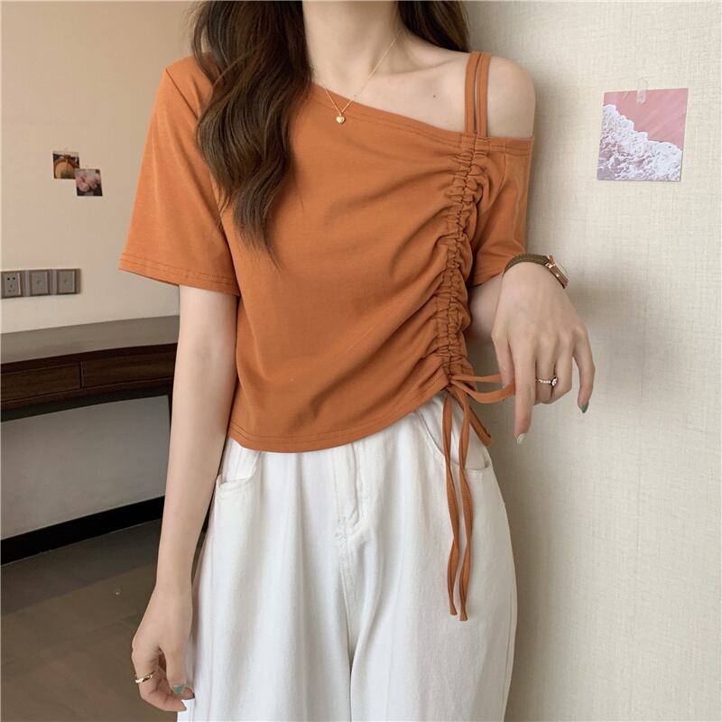 甘くてスパイシーなフレンチワンショルダースラントショルダー半袖Tシャツレディースサマーデザインニッチユニークなスペシャルショートドローストリングトップ 大人ガーリー スウィート キュート カジュアル 夏物 7460098476106667 | framboise21