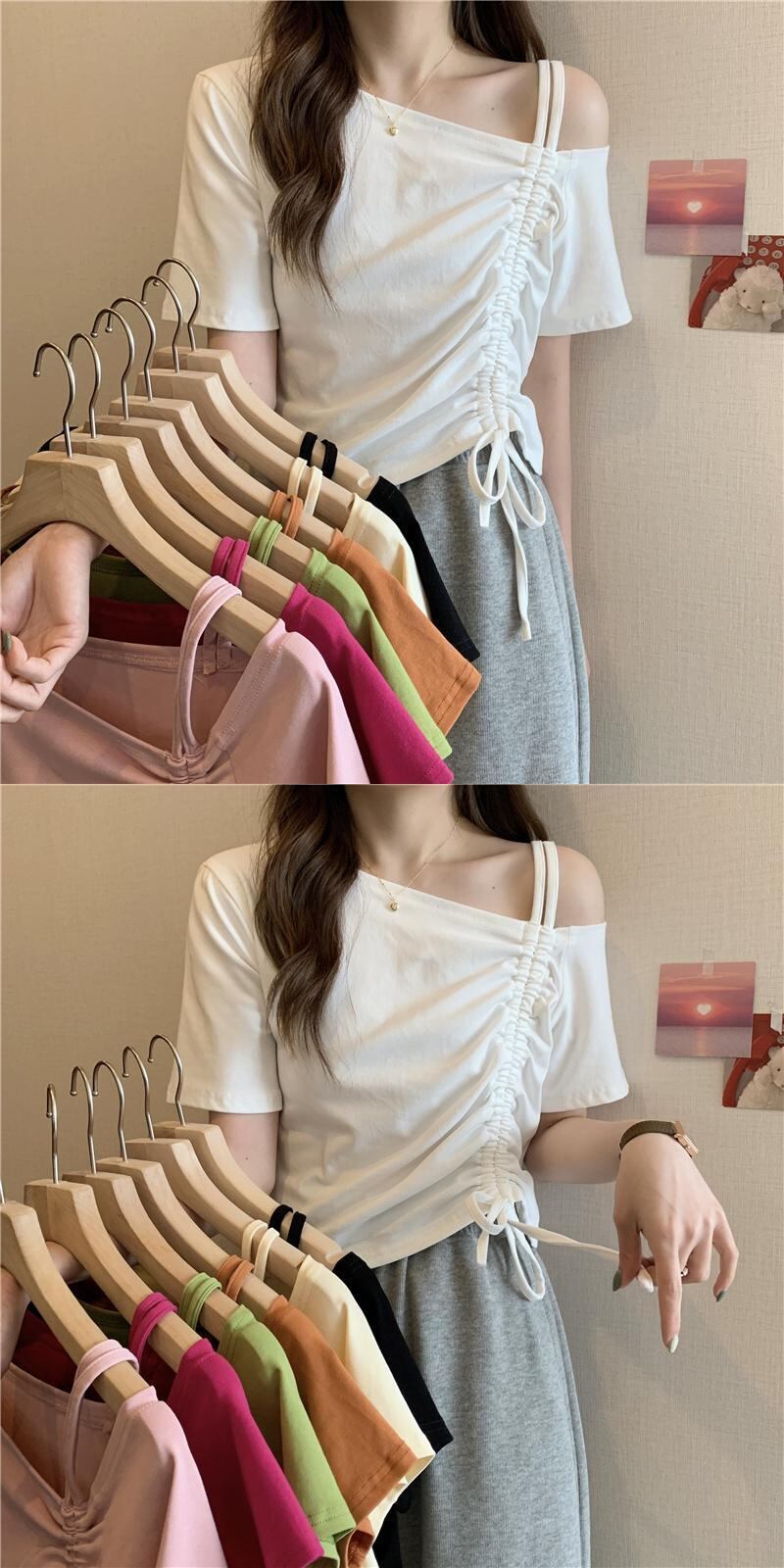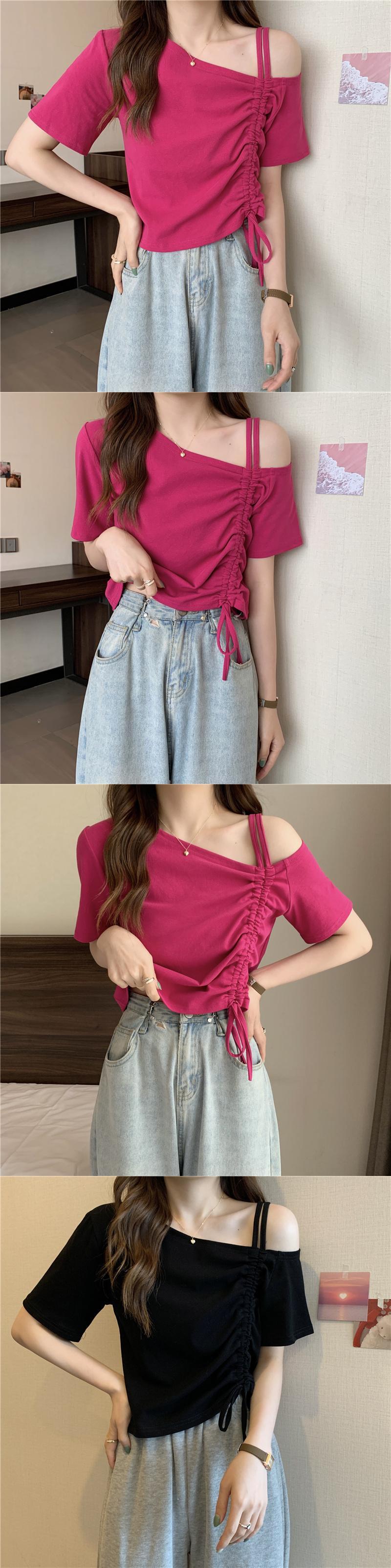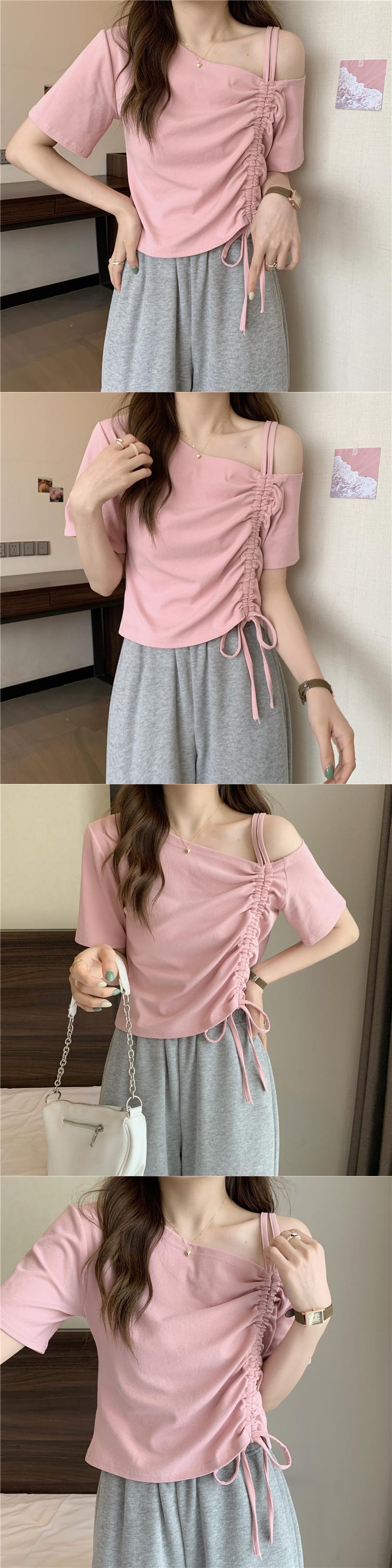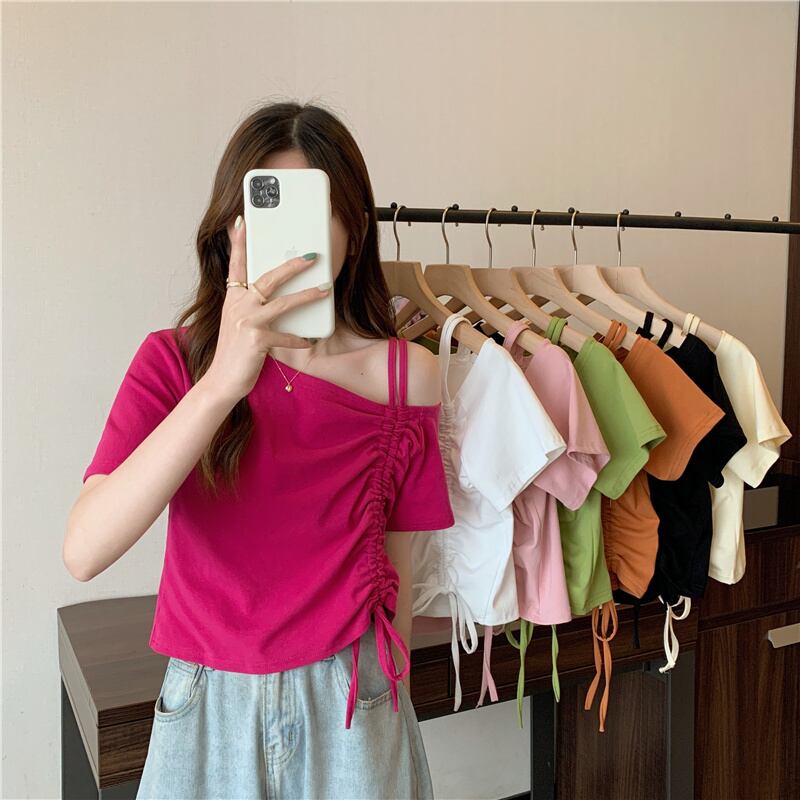 甘くてスパイシーなフレンチワンショルダースラントショルダー半袖Tシャツレディースサマーデザインニッチユニークなスペシャルショートドローストリングトップ 大人ガーリー スウィート キュート カジュアル 夏物 7460098476106667 | framboise21