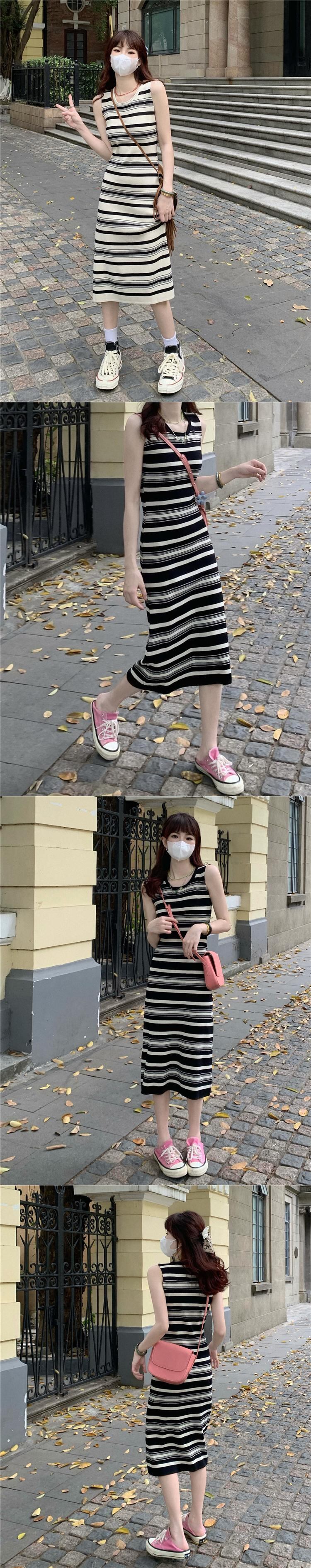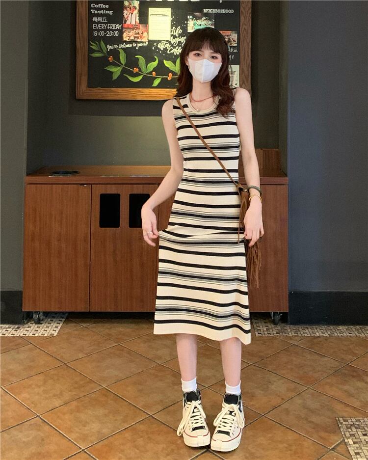 香港スタイルのレトロシックなノースリーブストライプニットドレスレディースサマースリミングスリムバッグヒップスカートロングベストスカート 夏物 7460033972280630 | framboise21
