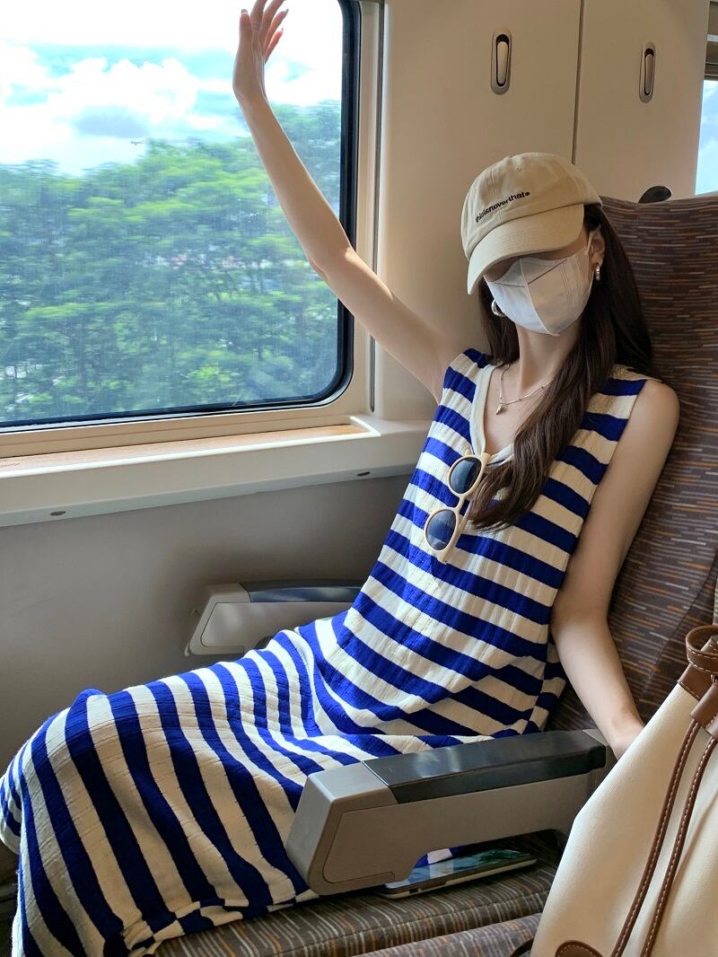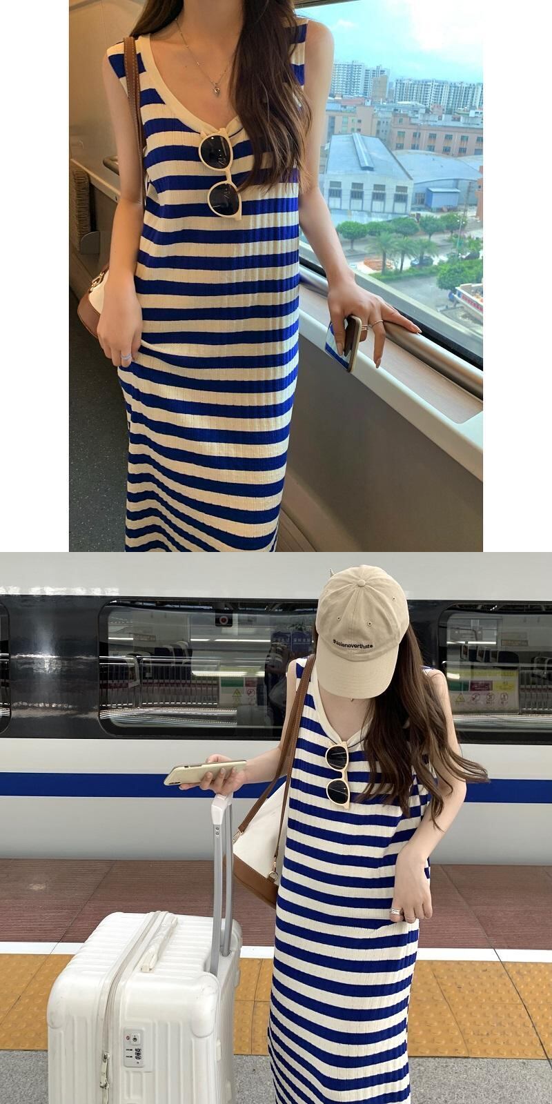 ブルーストライプワンピースレディースサマーノースリーブベストサスペンダースカートデザインカジュアルセクシーローネックロングスカート薄手 夏物 7460039241340217 | framboise21