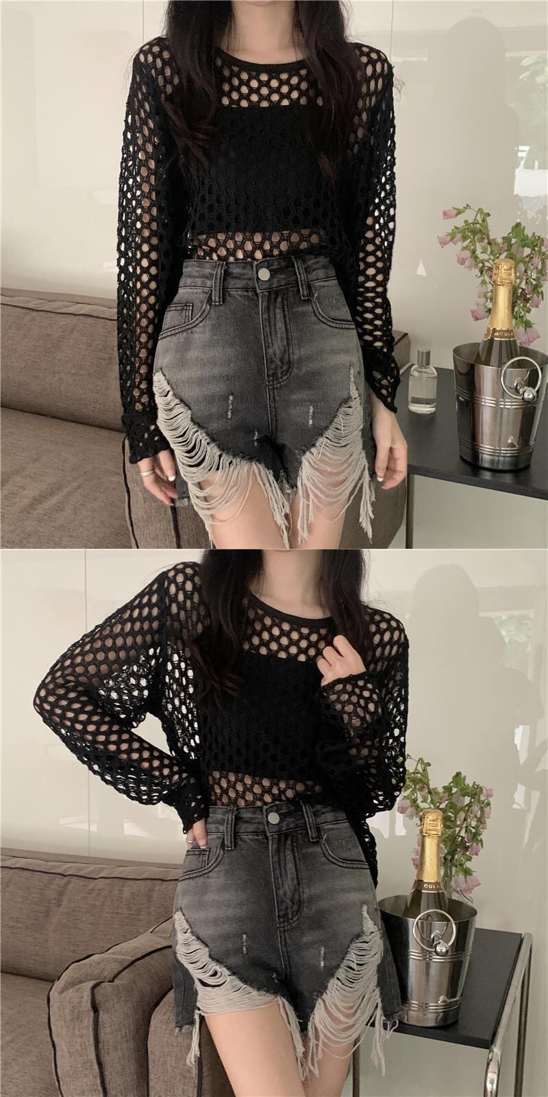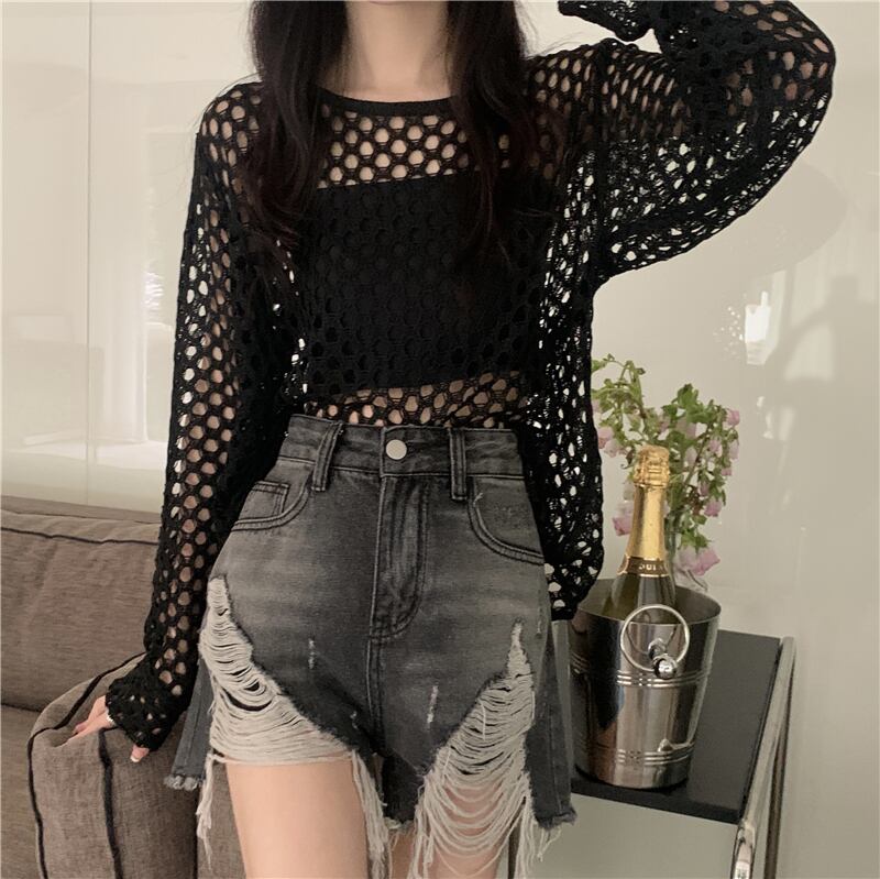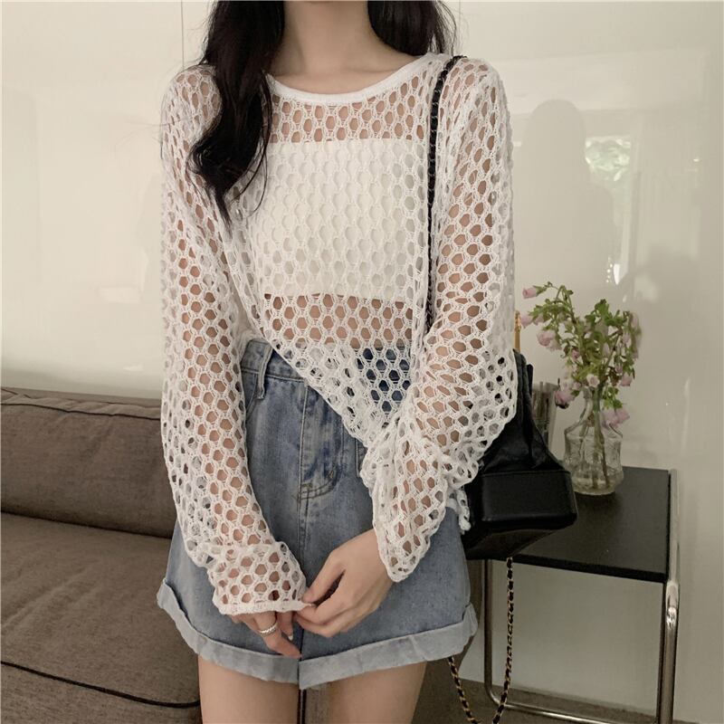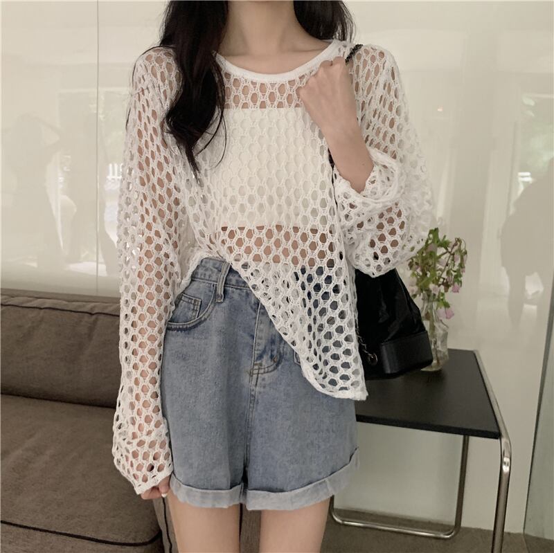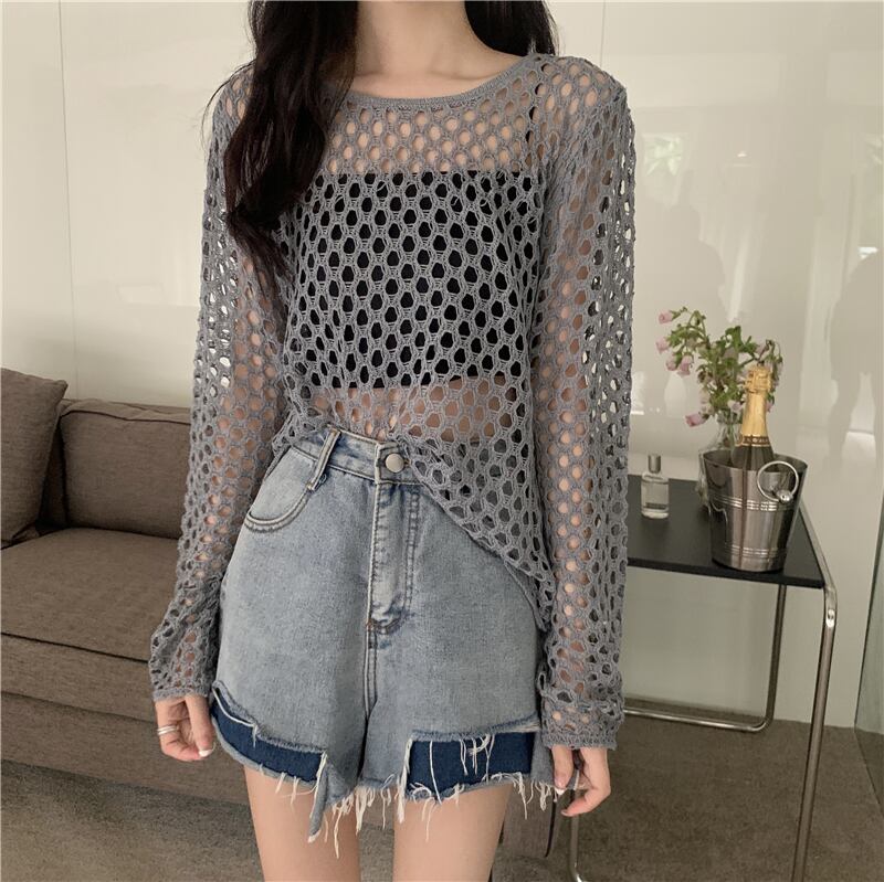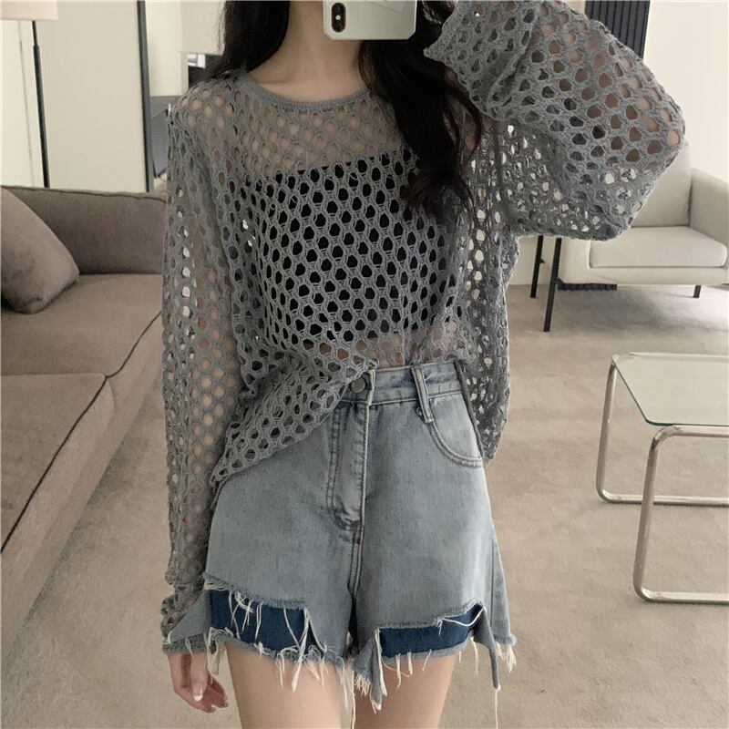 中空サンスクリーンブラウス女性の夏の薄いニットトップデザインは怠惰な風の氷シルクアイスシルク長袖Tシャツインを感じます ロング サマー 夏物 7460011810037510 | framboise21