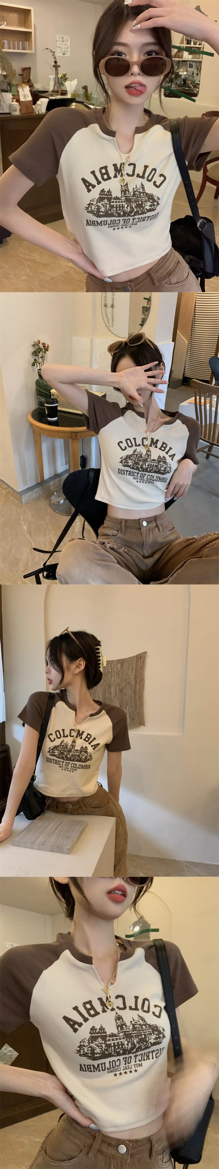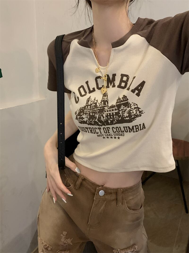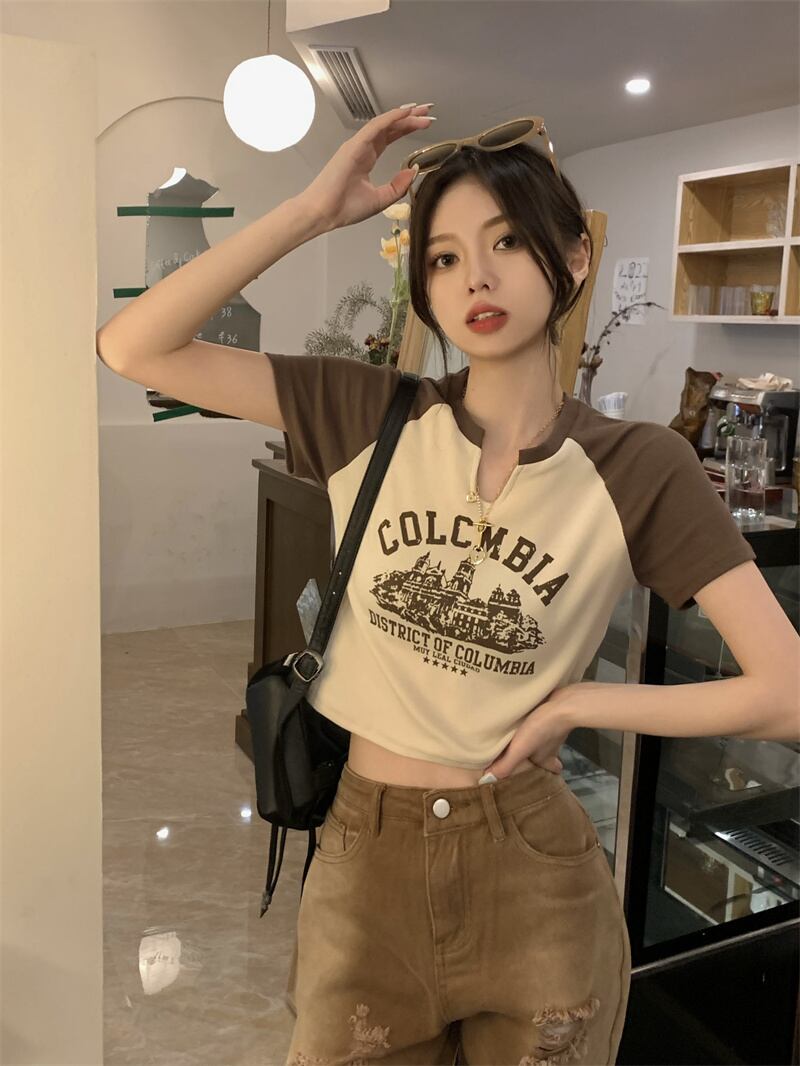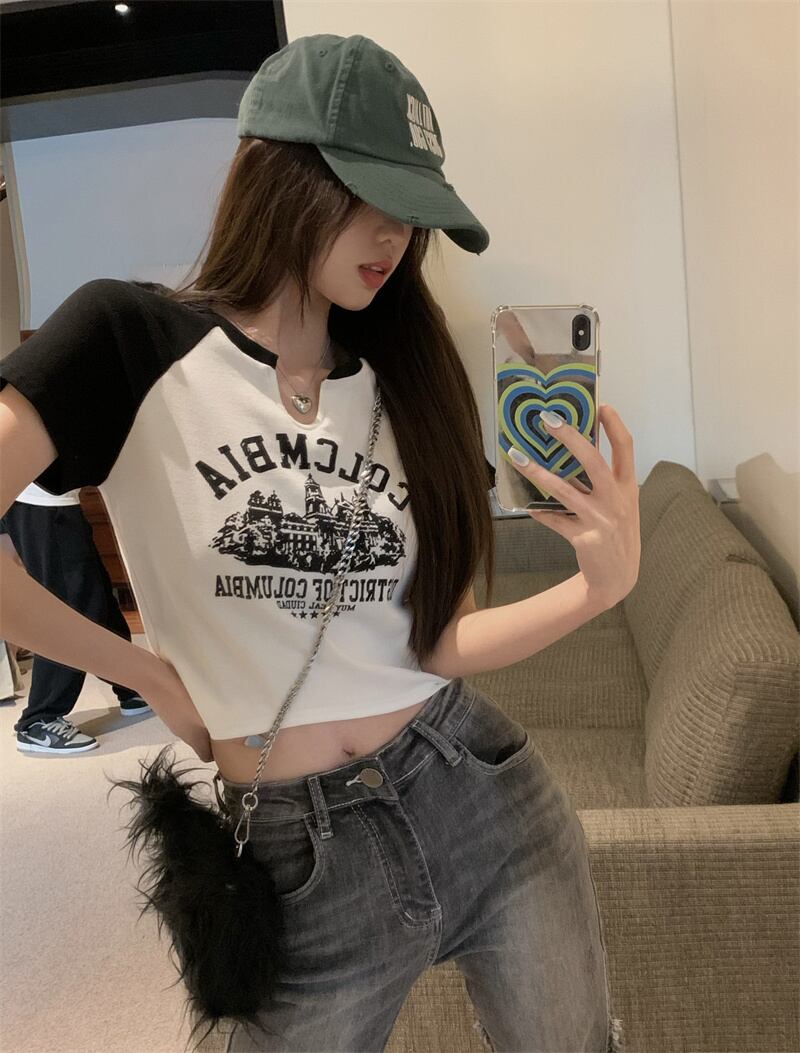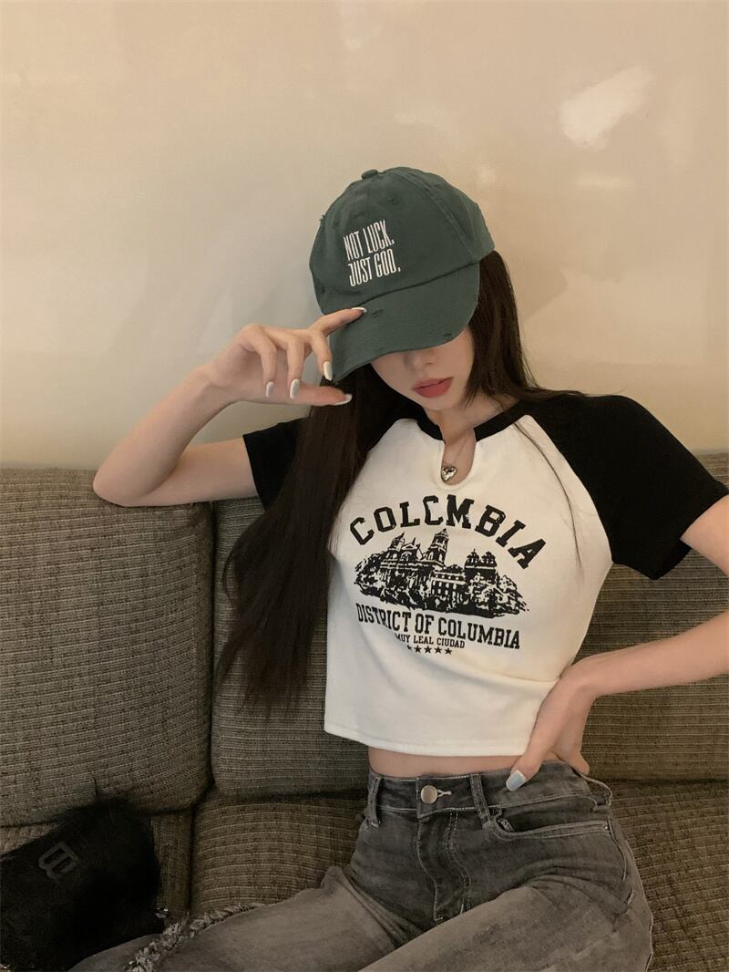 ホットスモールVネッククロップドアンビリカルトップレディースサマーセルフカルチャーコントラストカラーラグラン半袖Tシャツハイウエストデザインニッチ ハイウェスト 夏物 7460073116247963 | framboise21
