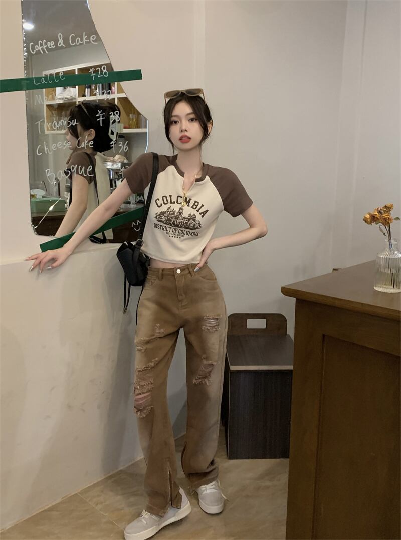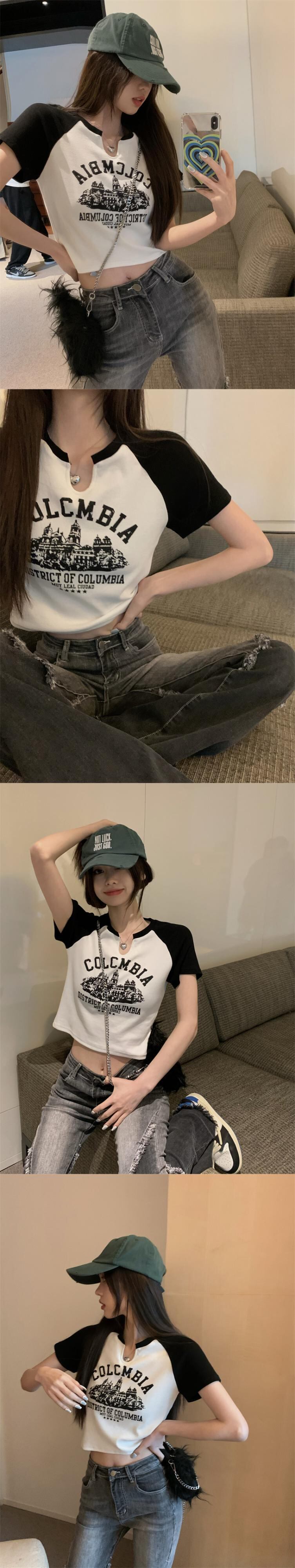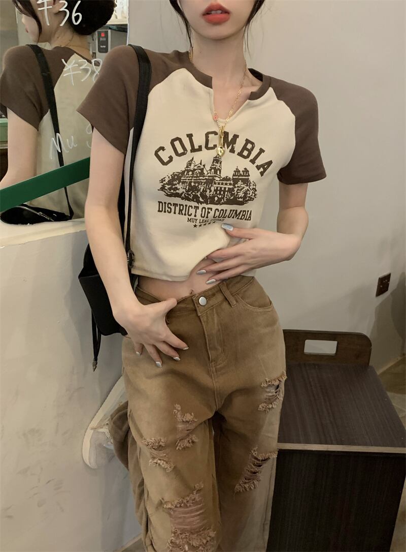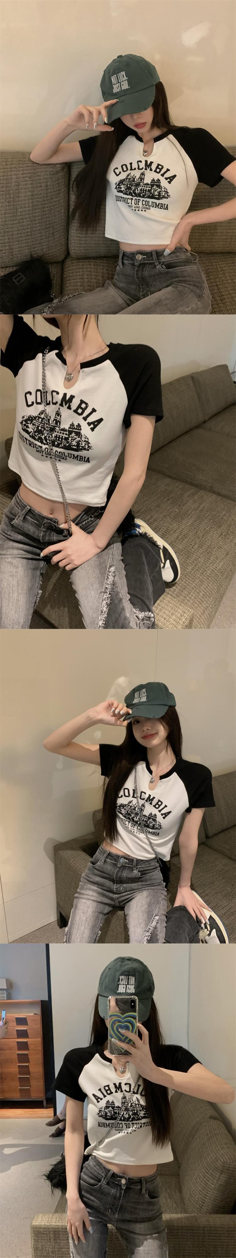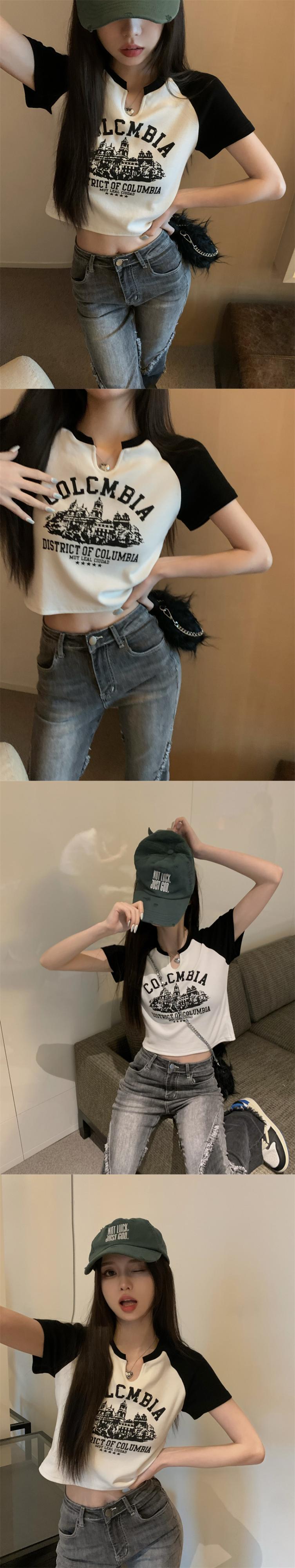 ホットスモールVネッククロップドアンビリカルトップレディースサマーセルフカルチャーコントラストカラーラグラン半袖Tシャツハイウエストデザインニッチ ハイウェスト 夏物 7460073116247963 | framboise21