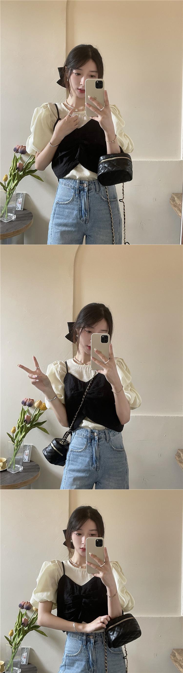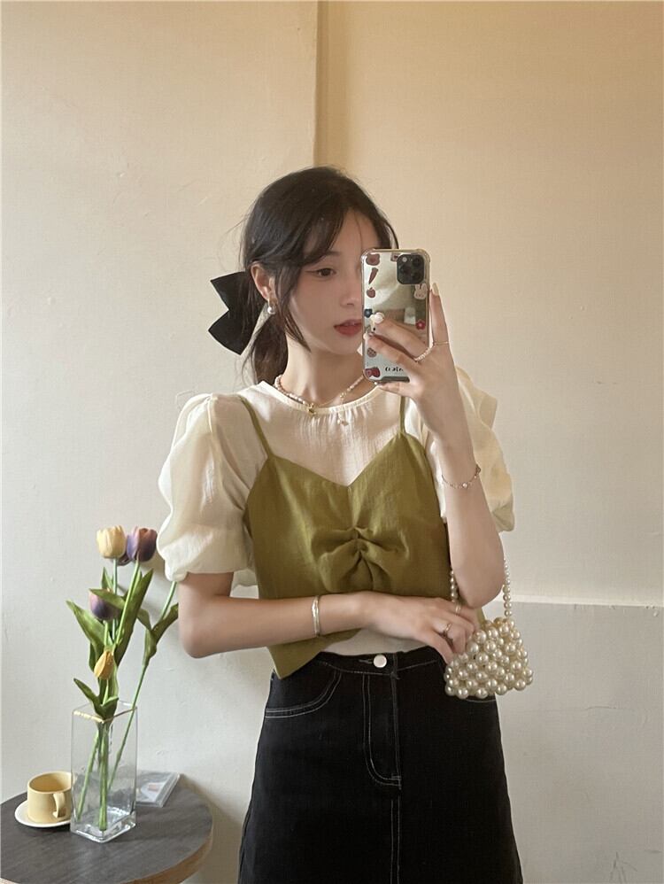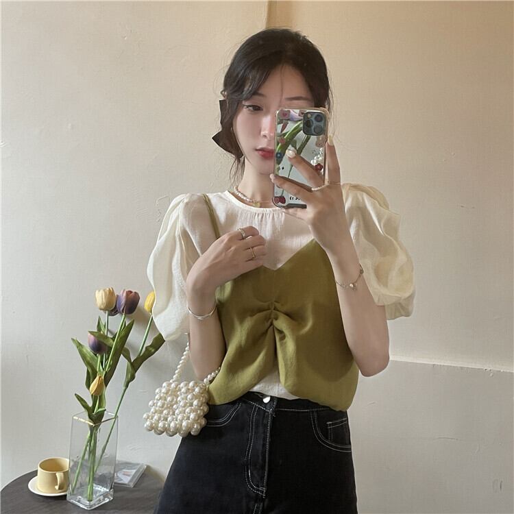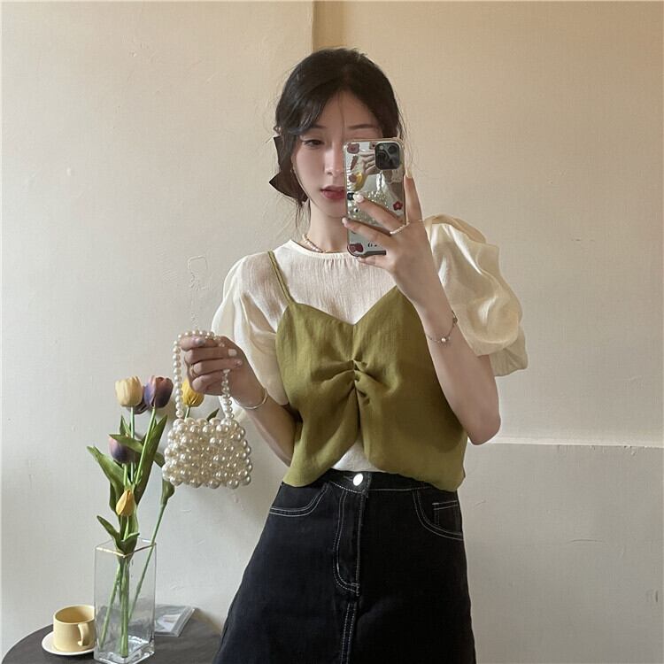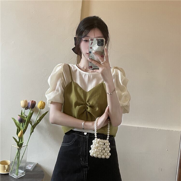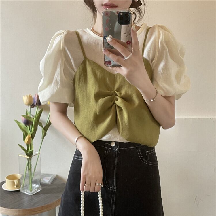 色:シフォンシャツアプリコット,ブラックサスペンダー,グリーンスリング