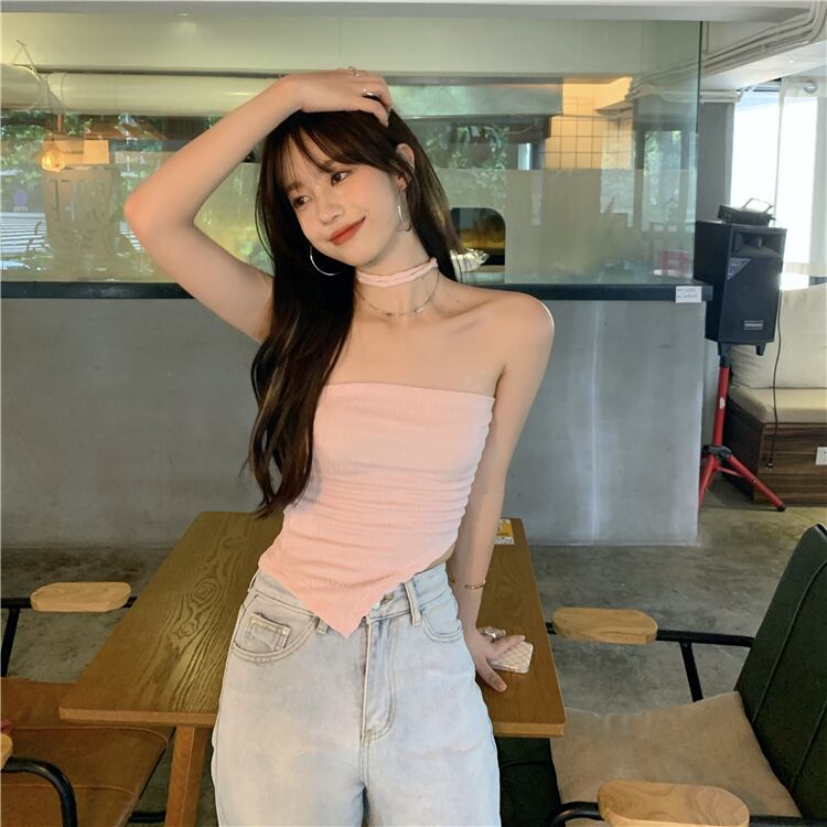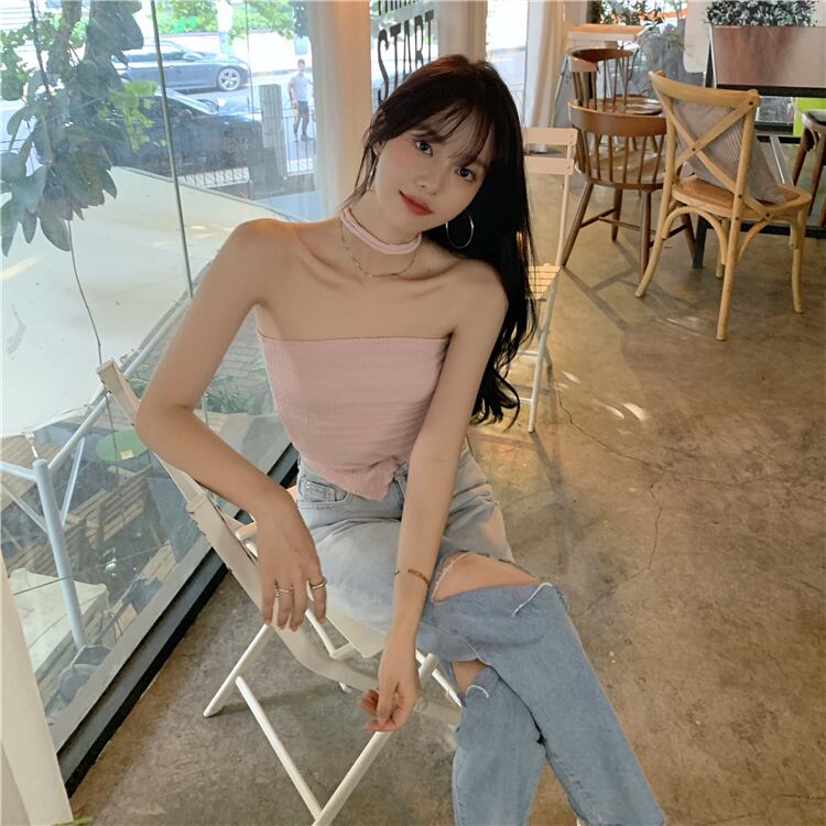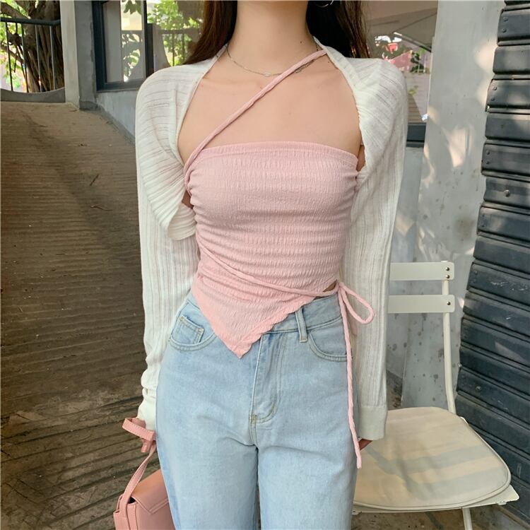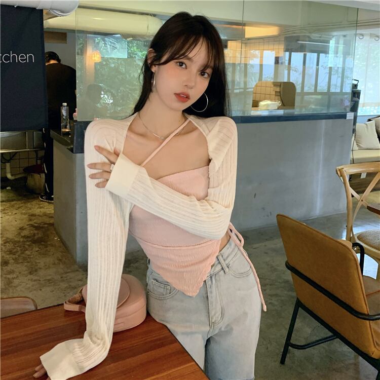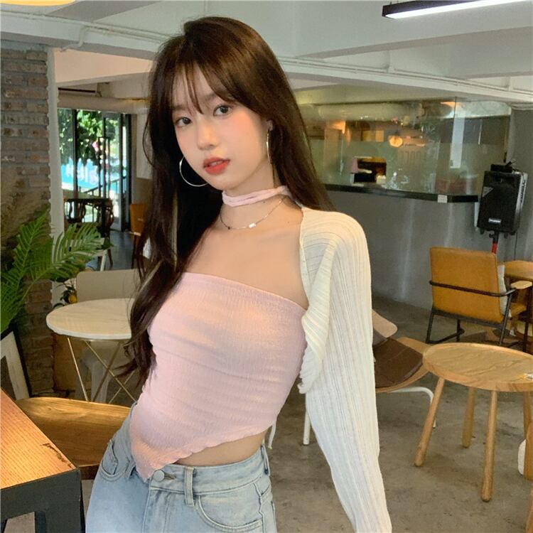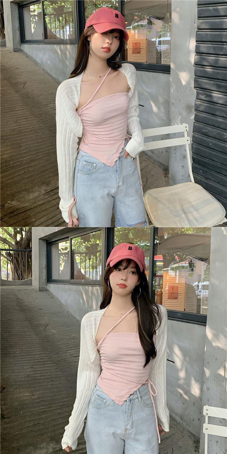 色:ピンクのサスペンダー,白いカーディガン