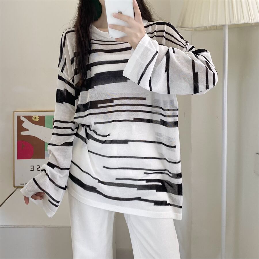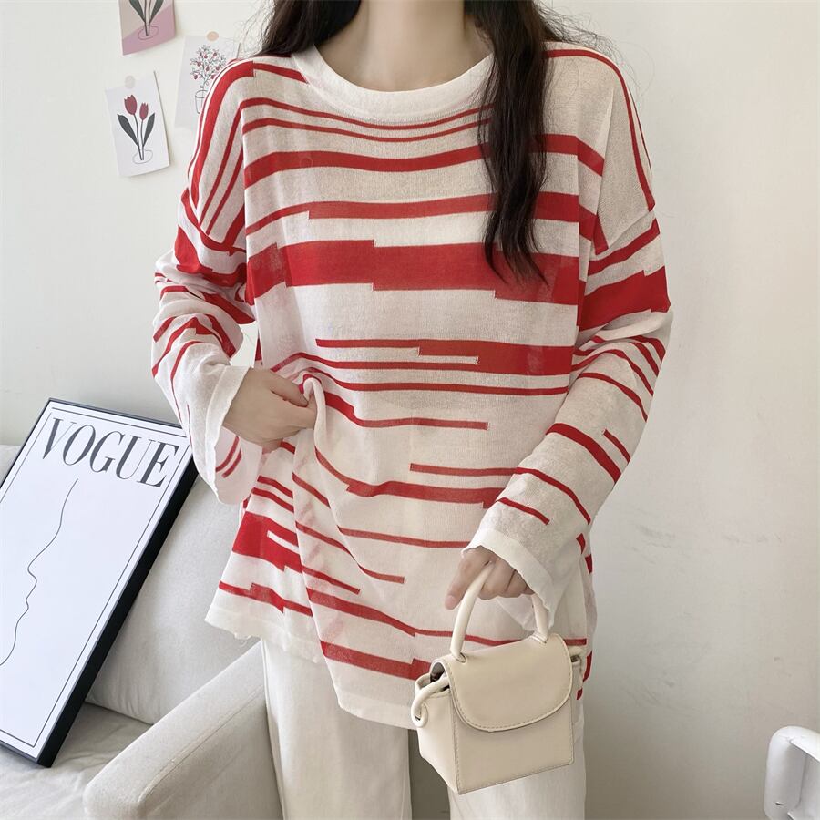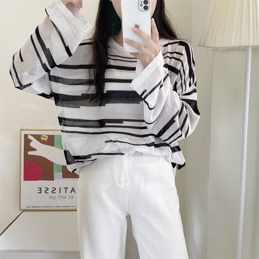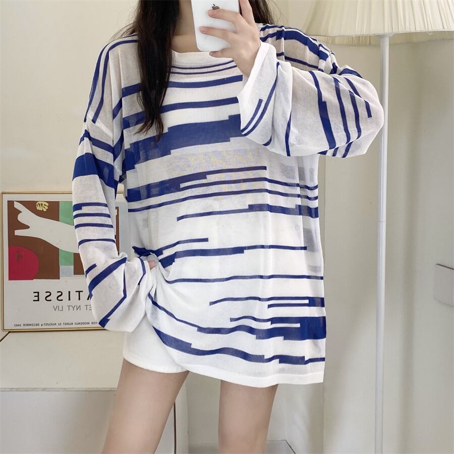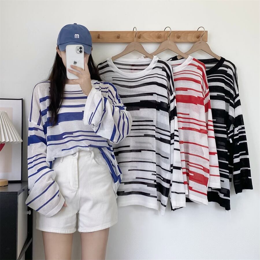 ストライプアイスシルクニットサンスクリーンTシャツレディースサマー長袖薄手セクションルーズオールマッチエアコントップブラウス ロング 夏物 7460016886501518 | framboise21