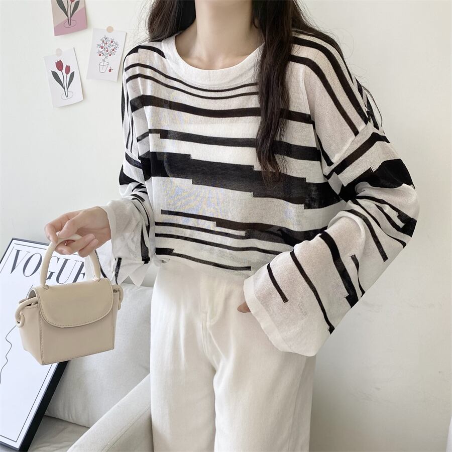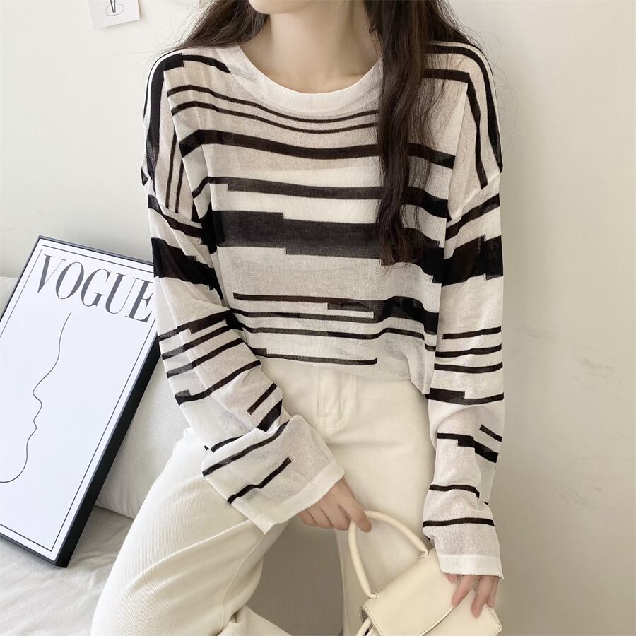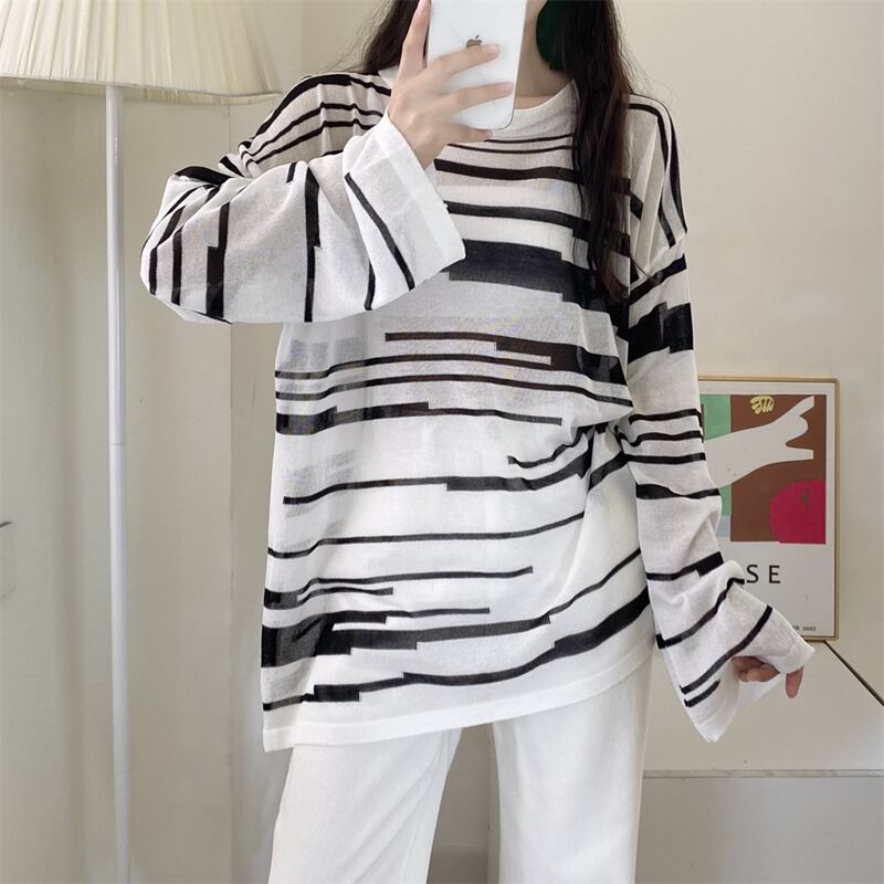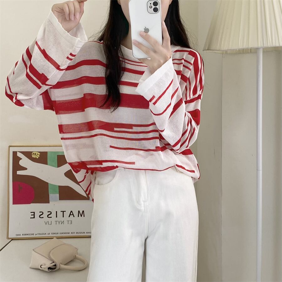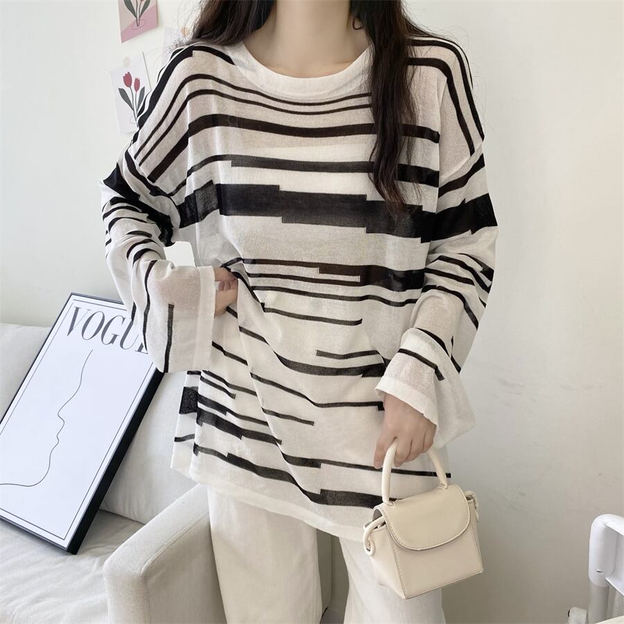 ストライプアイスシルクニットサンスクリーンTシャツレディースサマー長袖薄手セクションルーズオールマッチエアコントップブラウス ロング 夏物 7460016886501518 | framboise21