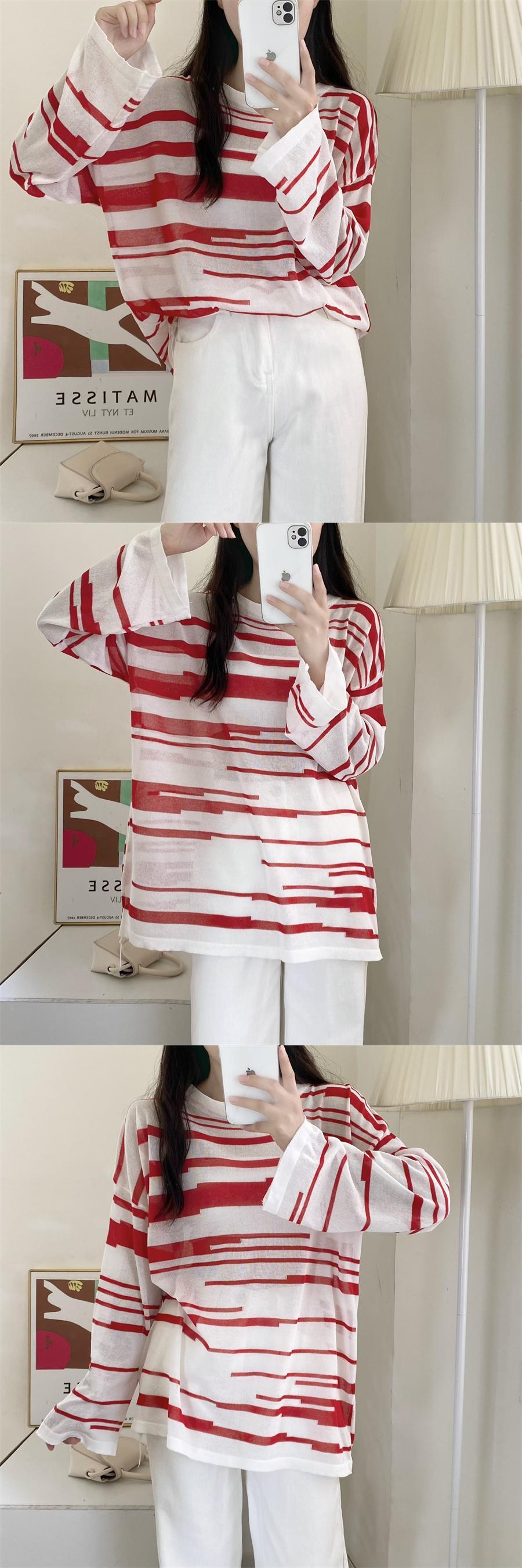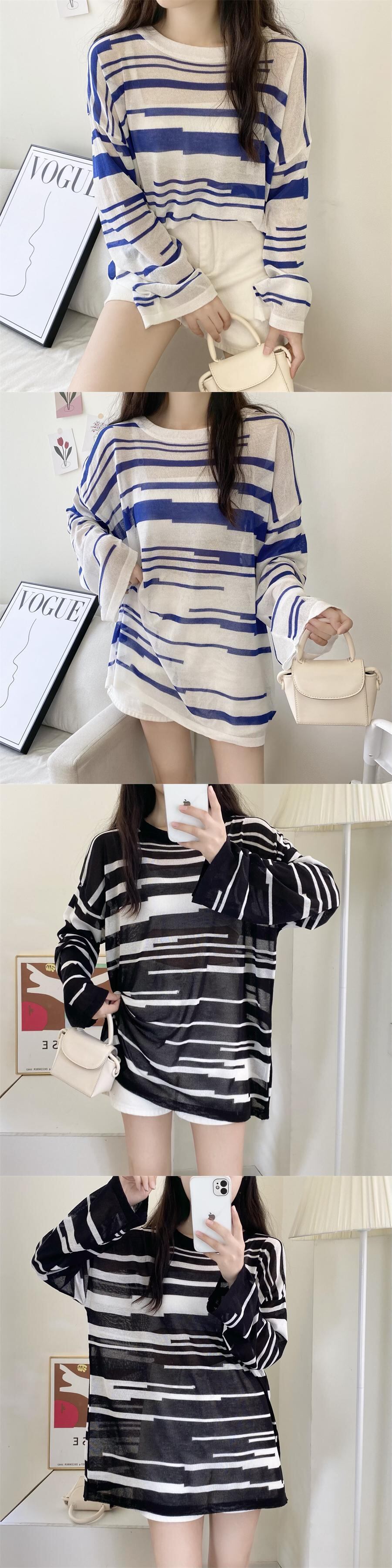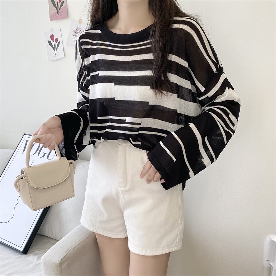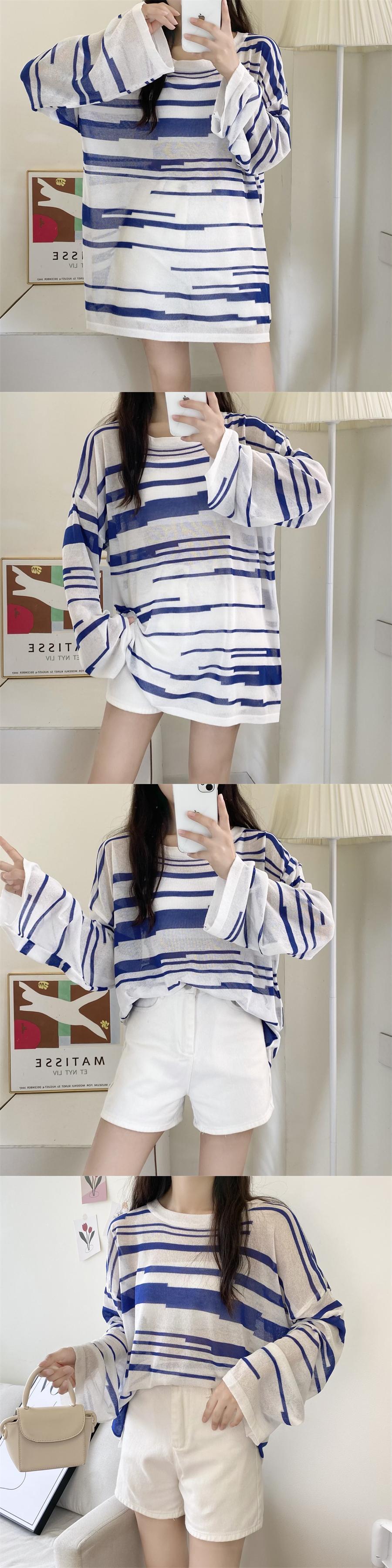 ストライプアイスシルクニットサンスクリーンTシャツレディースサマー長袖薄手セクションルーズオールマッチエアコントップブラウス ロング 夏物 7460016886501518 | framboise21