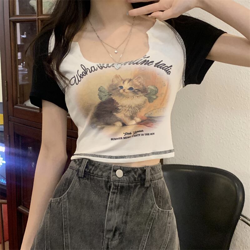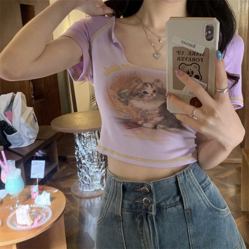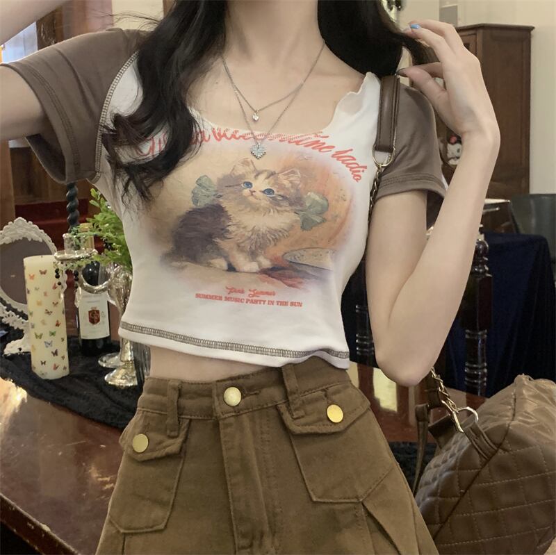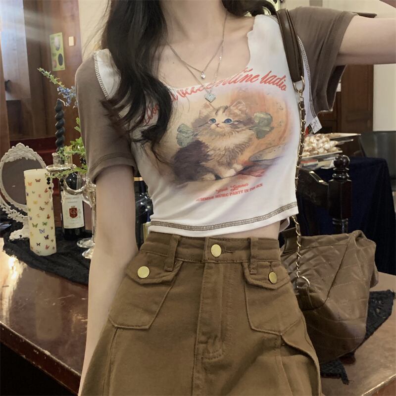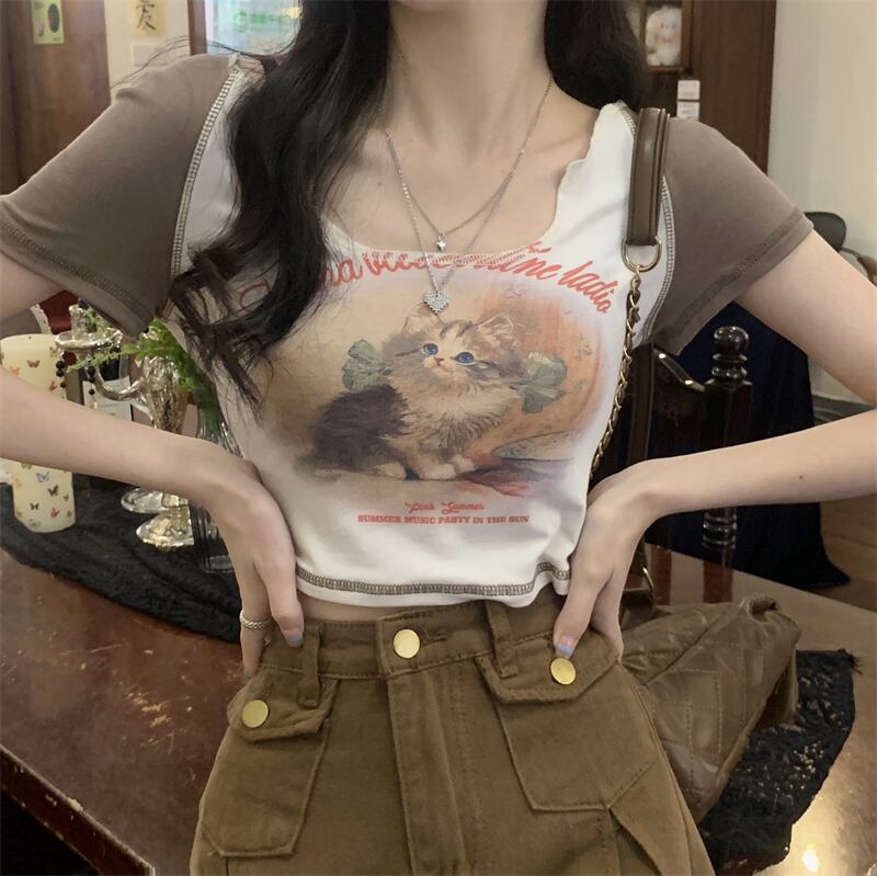 フロントショルダー半袖Tシャツ女子2022年夏新作アメリカンレトロデザインセンスショートプリントスクエアネックトップ サマー 夏物 スクウェア 7460054919531991 | framboise21