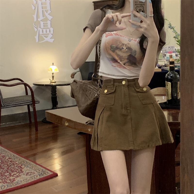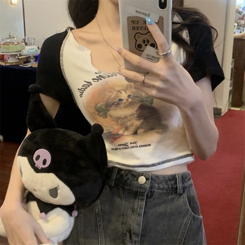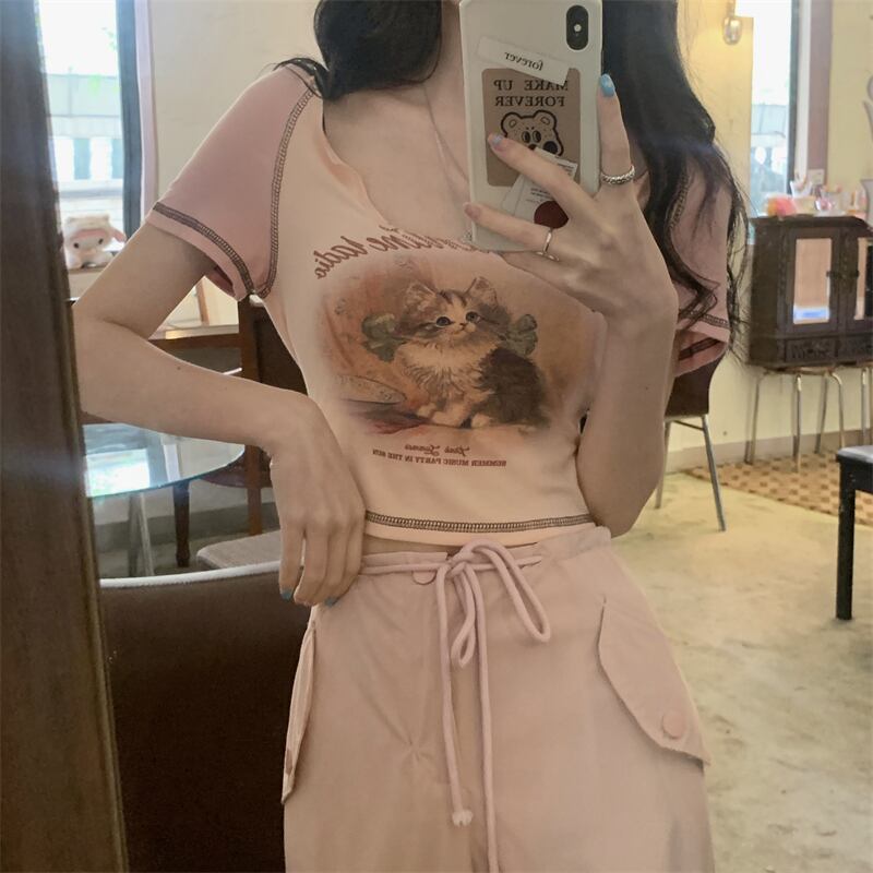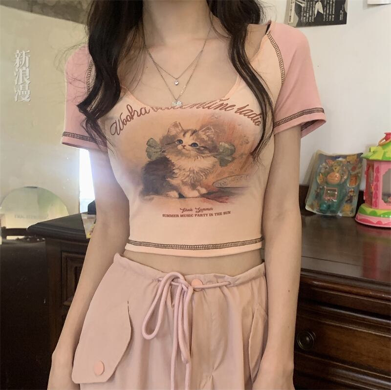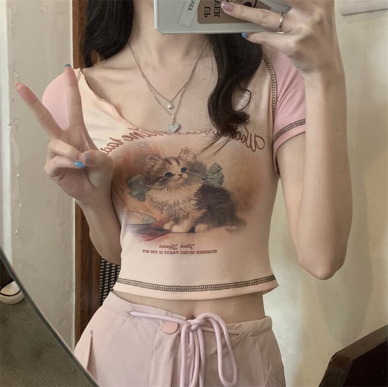 フロントショルダー半袖Tシャツ女子2022年夏新作アメリカンレトロデザインセンスショートプリントスクエアネックトップ サマー 夏物 スクウェア 7460054919531991 | framboise21