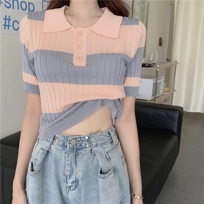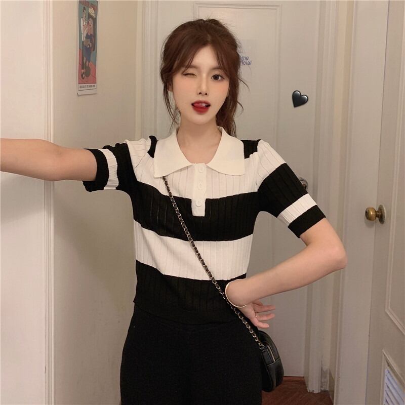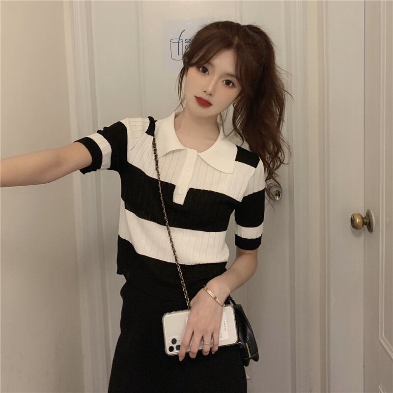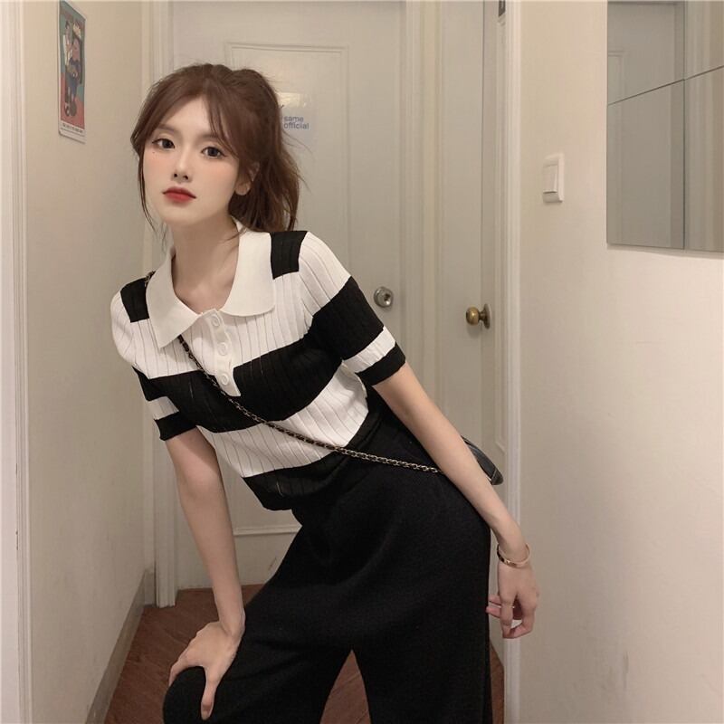 ポロシャツ半袖TシャツレディースXiaXiaoxiangスタイルeseスタイルコントラストカラーラペルアイスシルクニットショートトップハイウエストパンツ ハイウェスト 746003117452382 | framboise21