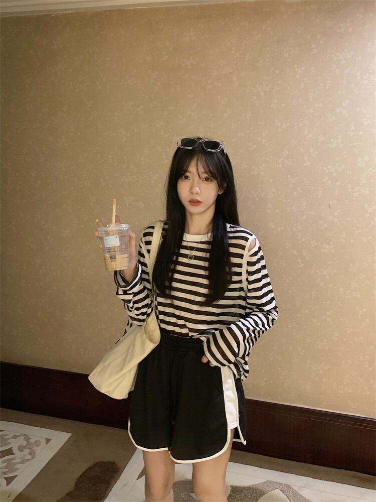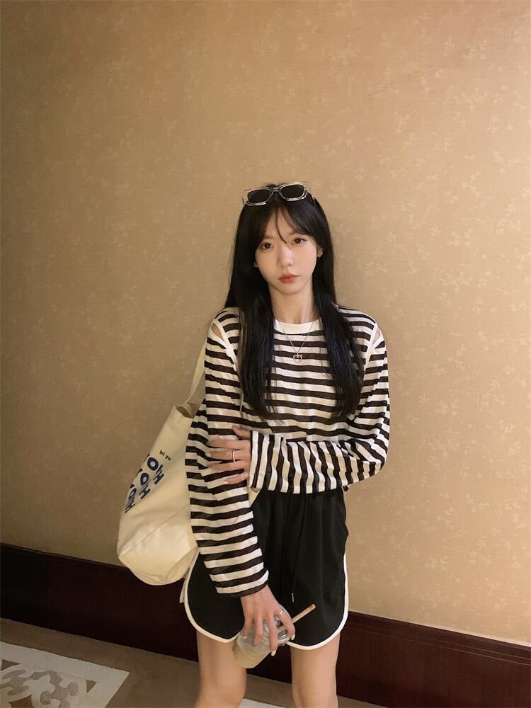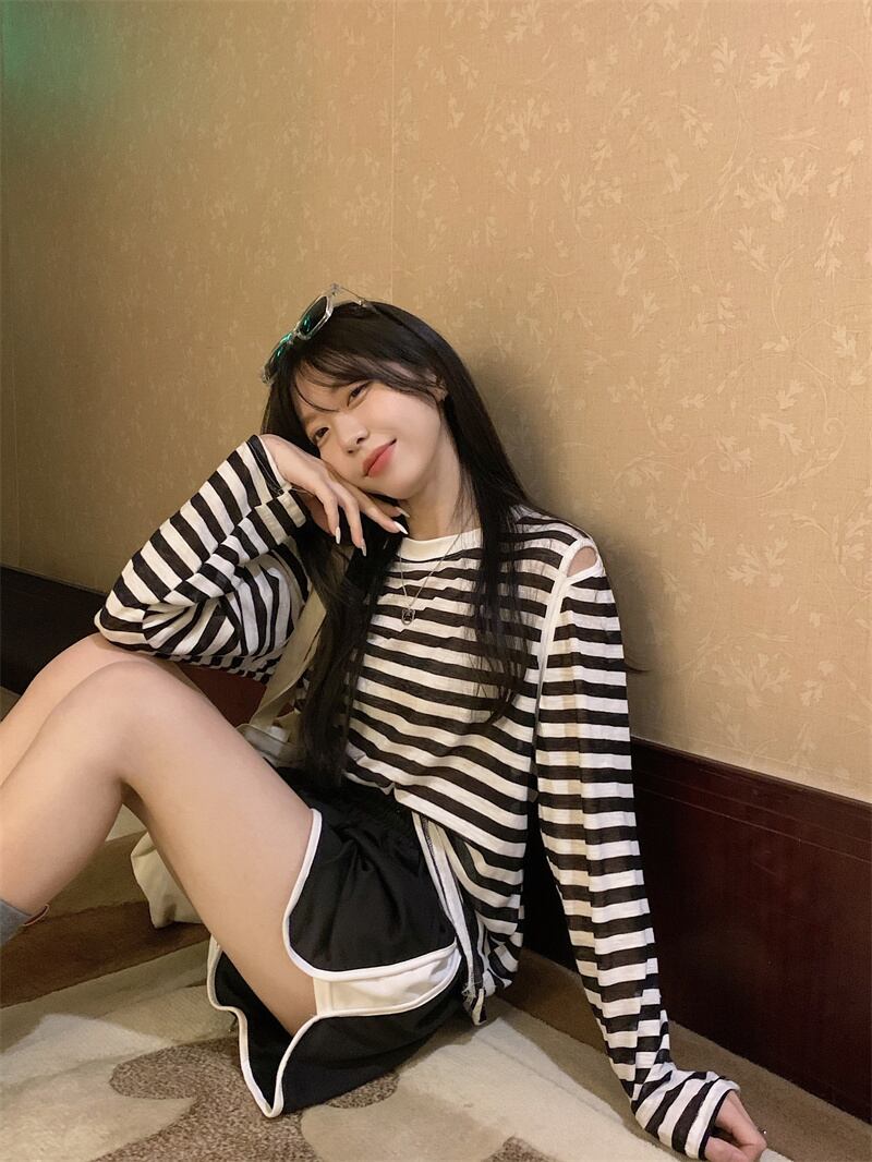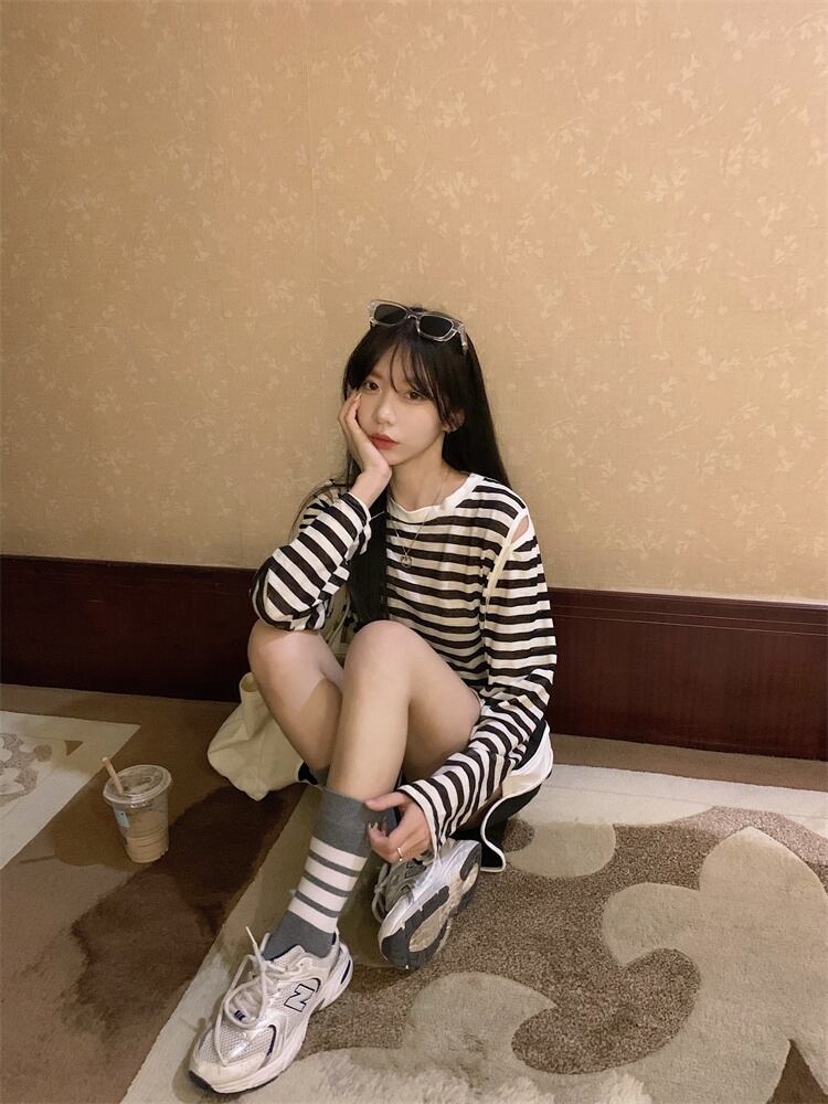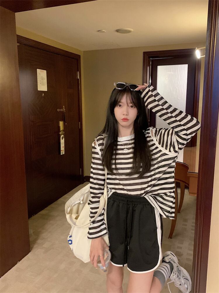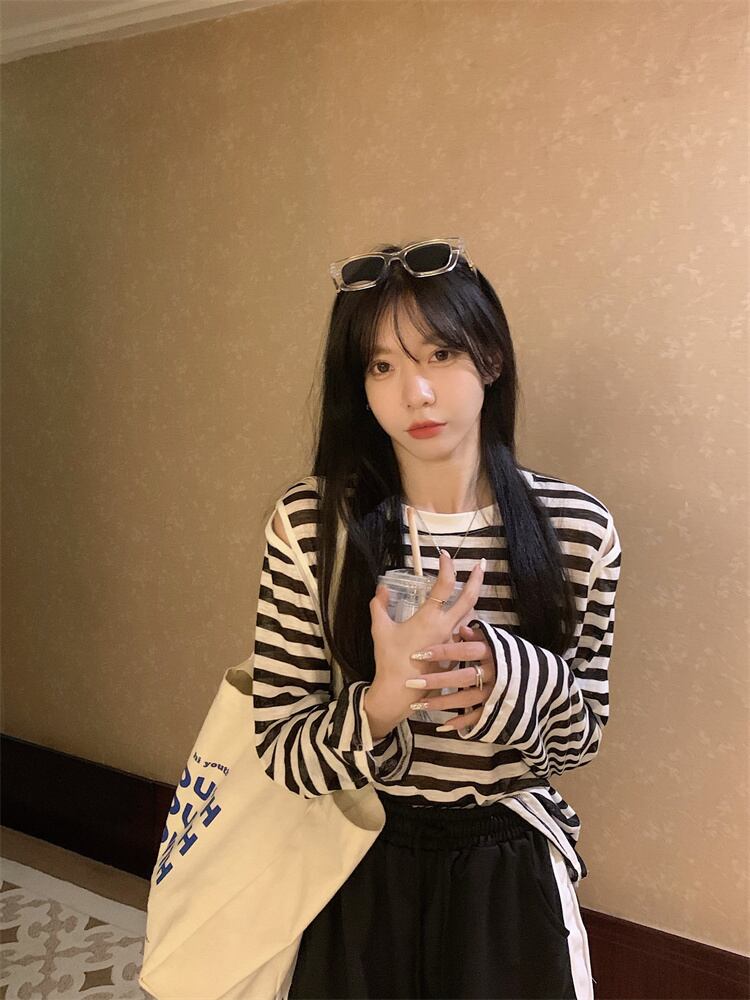 夏の薄い日焼け止めブラウスオールマッチルーズデザインオフショルダートップネットセレブスーパーストライプ長袖Tシャツ女性 ロング サマー 夏物 7460079696462820 | framboise21