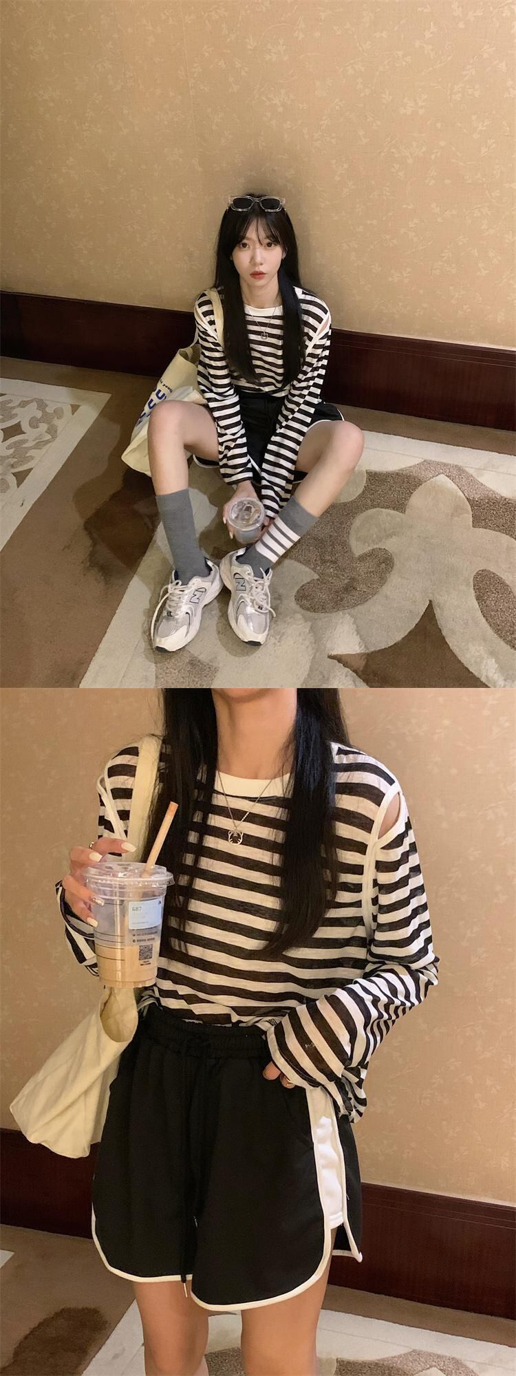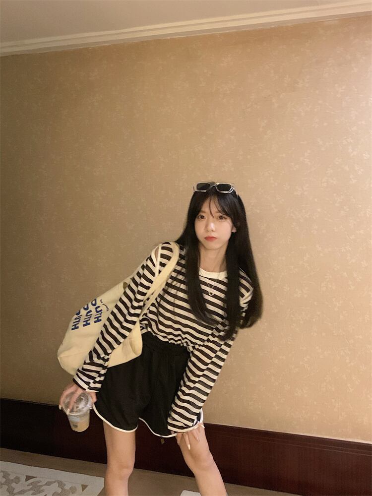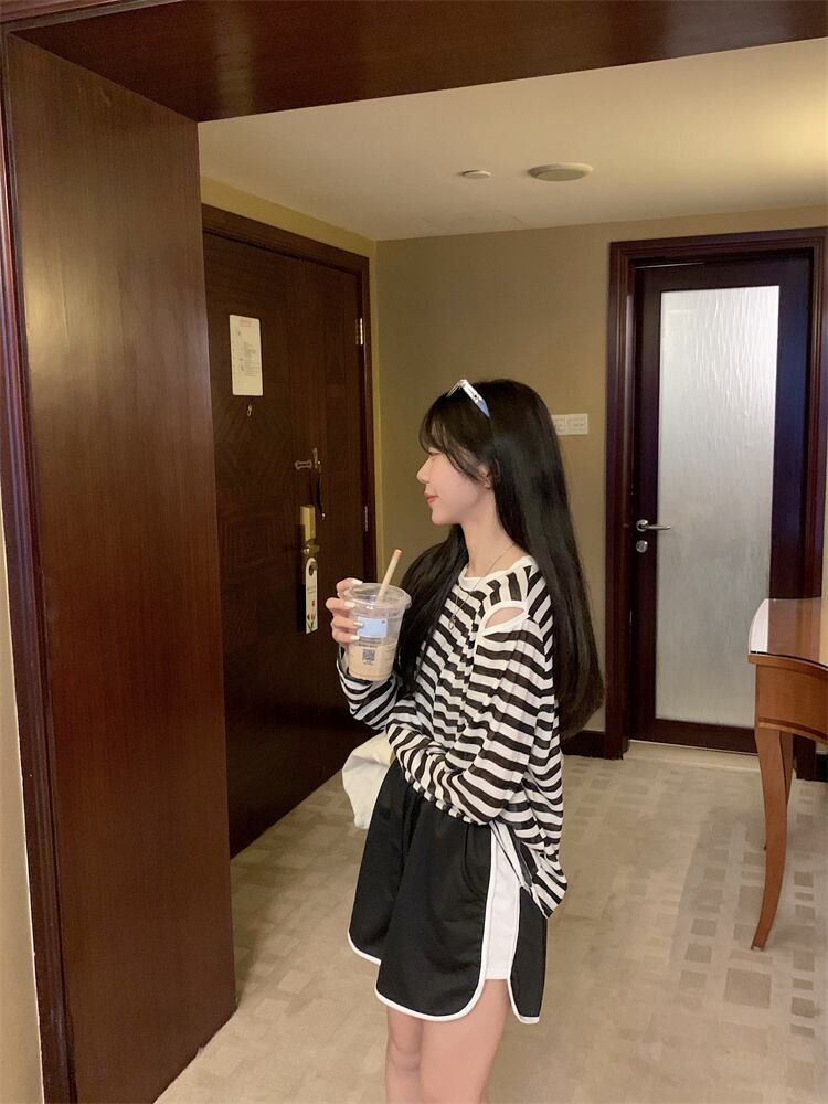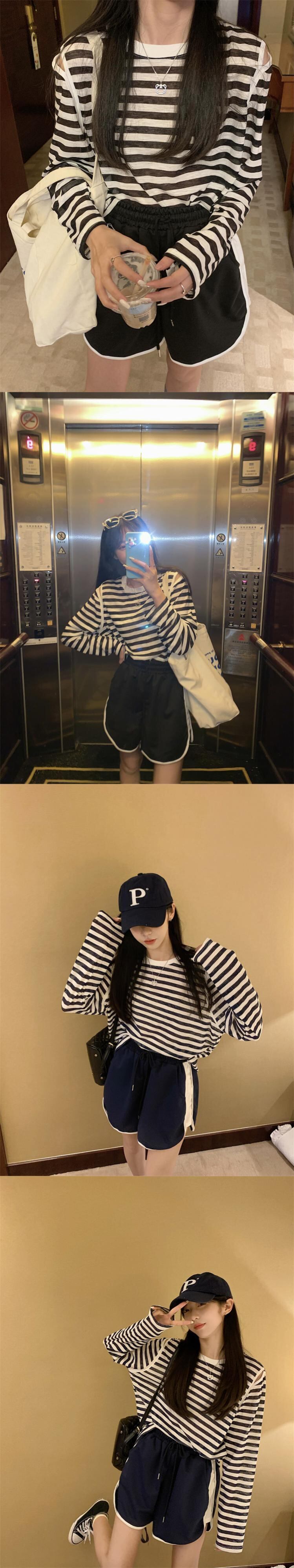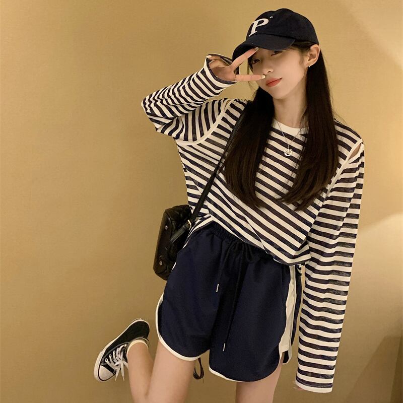 夏の薄い日焼け止めブラウスオールマッチルーズデザインオフショルダートップネットセレブスーパーストライプ長袖Tシャツ女性 ロング サマー 夏物 7460079696462820 | framboise21